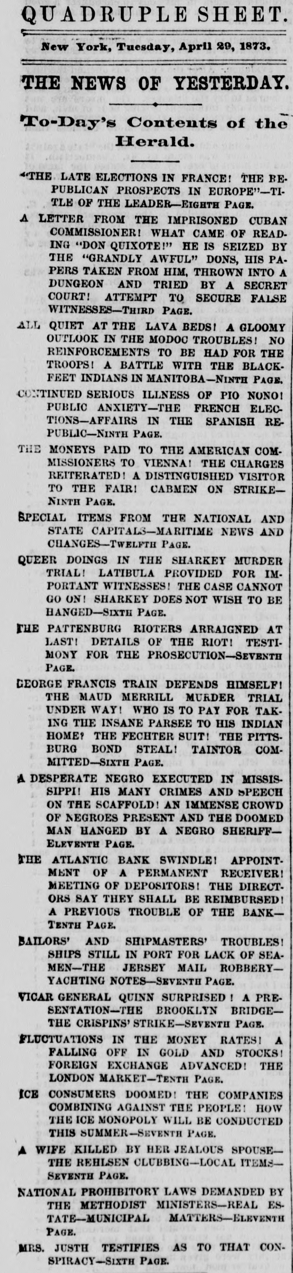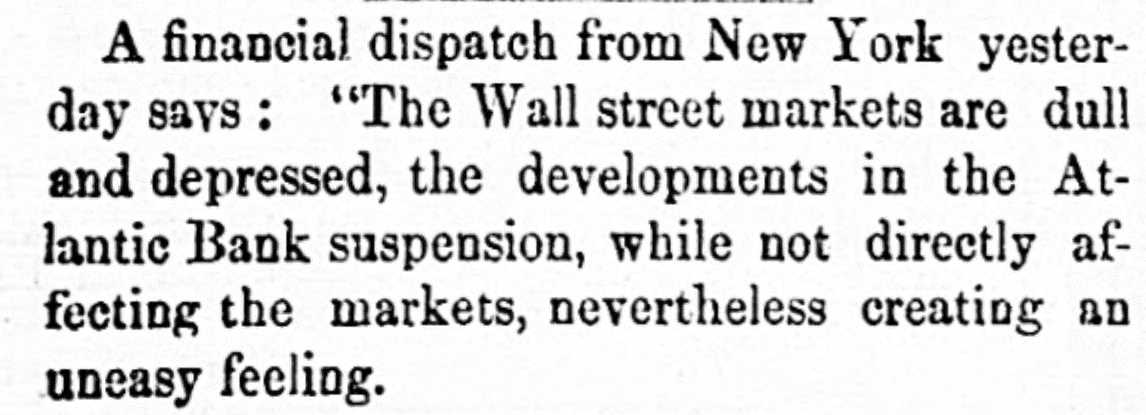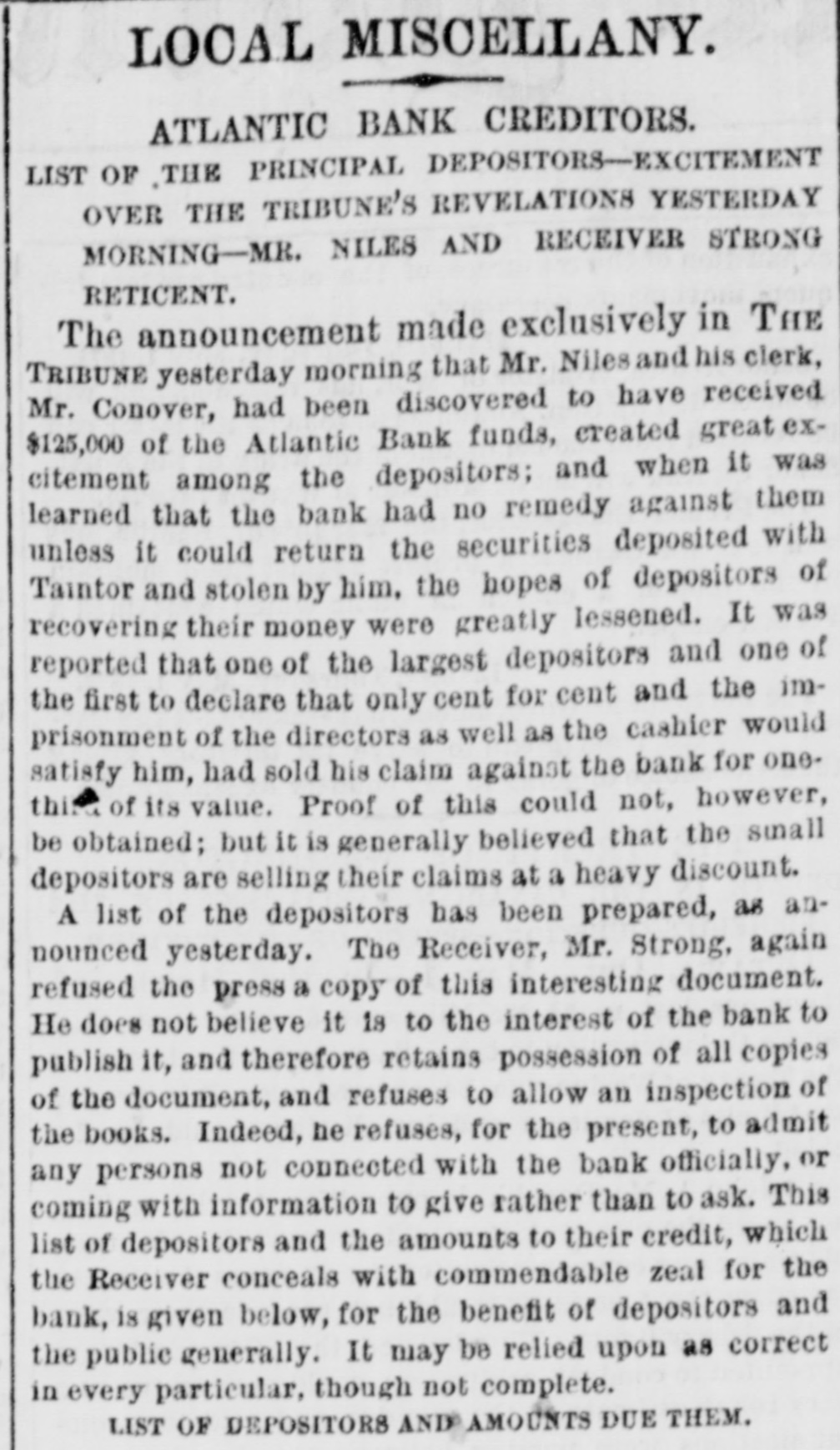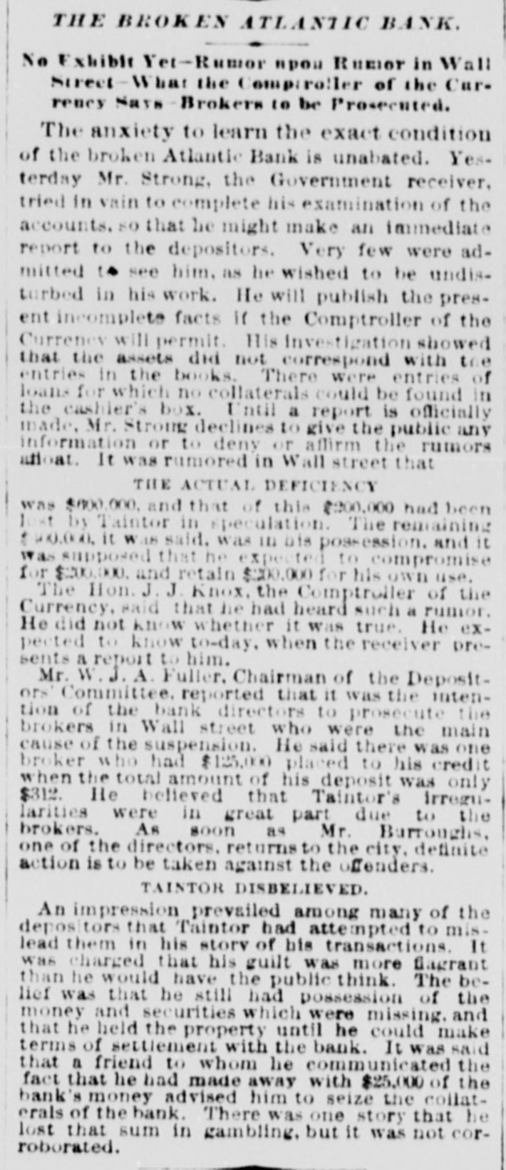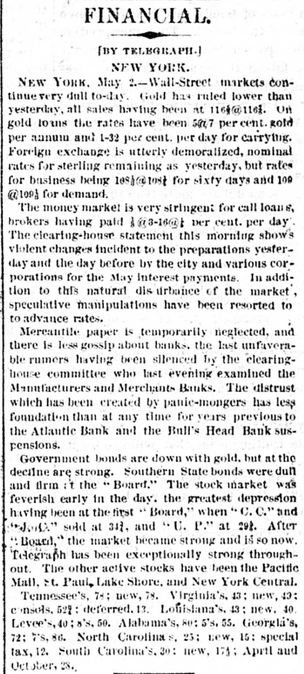 The Reported Defalcation in the New York Postofice. NEW YORK. April 28.-Postmaster Jasper pronounces without foundation the rumors of a defacation In the accounts of Henry Whiting. Cashier. The rumors originated from the fact that while Mr. Whiting is making up the last quarterly accounts of ex-Postmaster Jones, another is acting as Cashier. Rumored Raidon Pacific Mail Shorts There is a talk on the streets of a movement to twist those who have gone extensively short of Pacific Mail. Goald, Stockwell and Hatch, are said to have most of the stock. and will not allow the street to cover its shorts present prices. Meeting of Atlantic Bank Depositors. The depositors of the Atlantic Bank meet this evening to consider the situation. The United States Marshal has charge of the bank. Burned so Death. Liverpool papers of the 14th contain particulars of the fire in No. 26, Gray street, in that city. whereby one Seharah was burned to death, and an entire family named Edwards, consisting of six persons, suffered suffocation. Fire in Oak Hill. Ohio. PORTSMOUTH 0., April 28.-A in Oak Hill on Saturday night destroyed a store and warehouse belonging to the Mason Furnace Company. Loss, $7,000. No insurance. Suicides. CHICAGO. April 28.-Clara Crawford. an estimable young lady. committed suicide at the house of her brother Charles, yesterday. hanging herself with a trunk strap in her closet during the absence of the family at church. Temporary insanity caused by a long and sovere illness supposed to be the cause. John Coffee. a laborer, blew the top of his head off with a shotgun at boarding house on Clinton street yesterday afternoon. Cause, whisky. Accidentally Drowned. Arthur M. Arnold, aged 14 years, only son of I. W. Arnold, of this city, was drowned in the Rock river, at Dixon, on Saturday, by the capsizing of a boat. New Office. The Western Union Telegraph Comoccupy the new eleoffice just gant pany to-day completed for and them on the southwest corner of Washington and Lasalle streets, directly opposite of their office before. The Exposition Scandal. A Washington special says that an exceedingly sharp controversy is promised between Commissioner Van Buren and the Secretary of State over the alleged irregularities growing out of the Vienna Exposition scandal. The friends of the Commissioner explain that the very reason why he didn't file his bond arose from the fact that the fourteen general appointments of Commissioners were made by the State Department. and Van Buren did not propose to make himself responsible for the distribution of a fund amounting to $200,000. In a letter written to-day on this subject, Secretary Fish said that a detailed report of the examinationgnow taking place in Vienna will be forwarded shortly, and at the earliest moment the suspension of all who shall not be implicated will be removed.