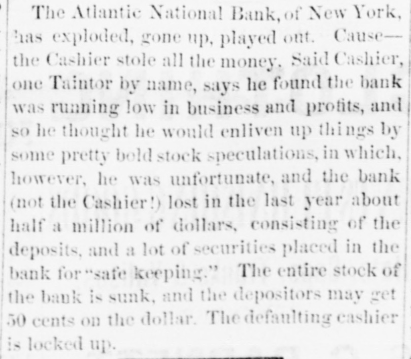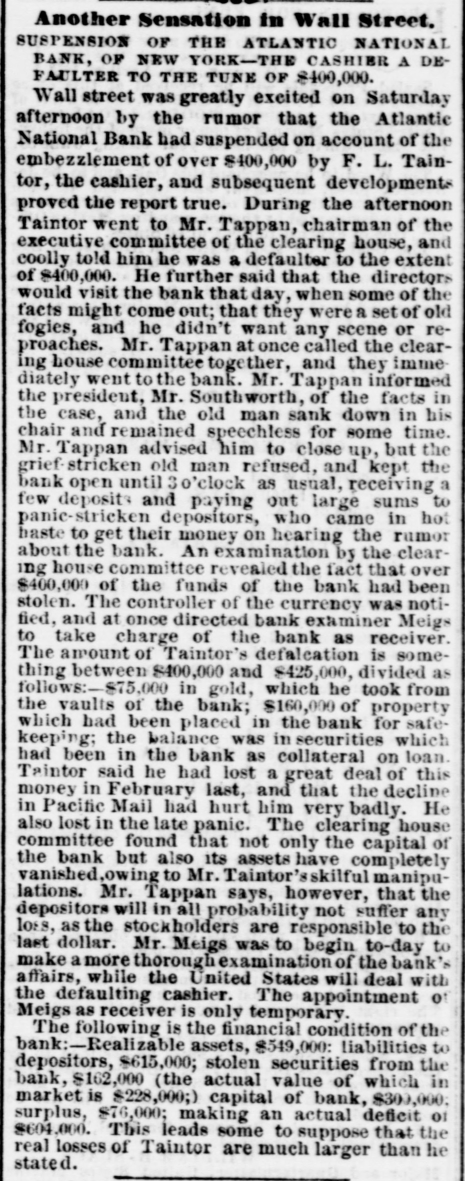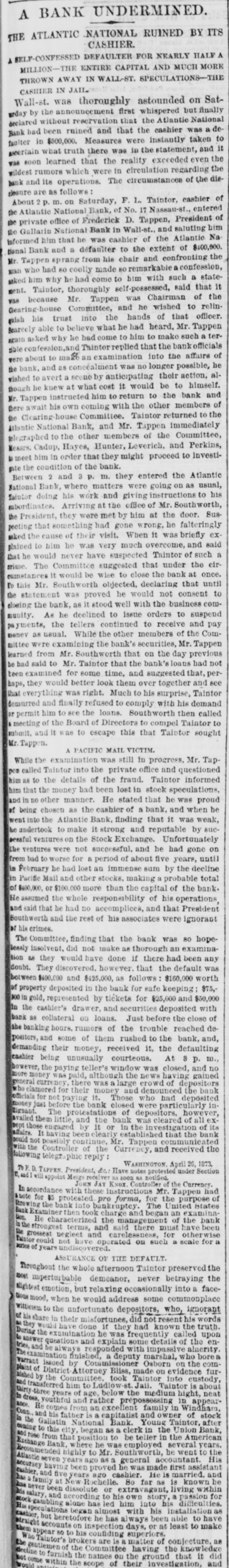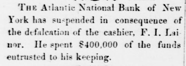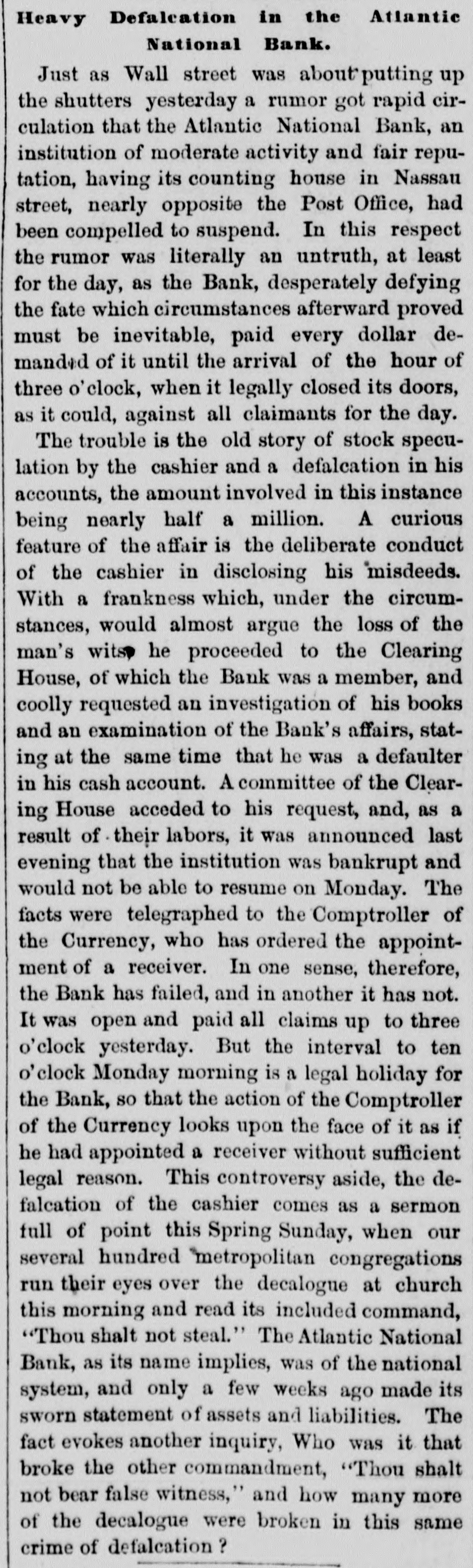 Heavy Defalcation in the Atlantic National Bank. Just as Wall street was about putting up the shutters yesterday a rumor got rapid circulation that the Atlantic National Bank, an institution of moderate activity and fair reputation, having its counting house in Nassau street, nearly opposite the Post Office, had been compelled to suspend. In this respect the rumor was literally an untruth, at least for the day, as the Bank, desperately defying the fate which circumstances afterward proved must be inevitable, paid every dollar demanded of it until the arrival of the hour of three o'clock, when it legally closed its doors, as it could, against all claimants for the day. The trouble is the old story of stock speculation by the cashier and a defalcation in his accounts, the amount involved in this instance being nearly half a million. A curious feature of the affair is the deliberate conduct of the cashier in disclosing his "misdeeds. With a frankness which, under the circumstances, would almost argue the loss of the man's wits, he proceeded to the Clearing House, of which the Bank was a member, and coolly requested an investigation of his books and an examination of the Bank's affairs, stating at the same time that he was a defaulter in his cash account. A committee of the Clearing House acceded to his request, and, as a result of their labors, it was announced last evening that the institution was bankrupt and would not be able to resume on Monday. The facts were telegraphed to the Comptroller of the Currency, who has ordered the appointment of a receiver. In one sense, therefore, the Bank has failed, and in another it has not. It was open and paid all claims up to three o'clock yesterday. But the interval to ten o'clock Monday morning is a legal holiday for the Bank, so that the action of the Comptroller of the Currency looks upon the face of it as if he had appointed a receiver without sufficient legal reason. This controversy aside, the defalcation of the cashier comes as a sermon full of point this Spring Sunday, when our several hundred metropolitan congregations run their eyes over the decalogue at church this morning and read its included command, "Thou shalt not steal." The Atlantic National Bank, as its name implies, was of the national system, and only a few weeks ago made its sworn statement of assets and liabilities. The fact evokes another inquiry, Who was it that broke the other commandment, "Thou shalt not bear false witness," and how many more of the decalogue were broken in this same crime of defalcation?