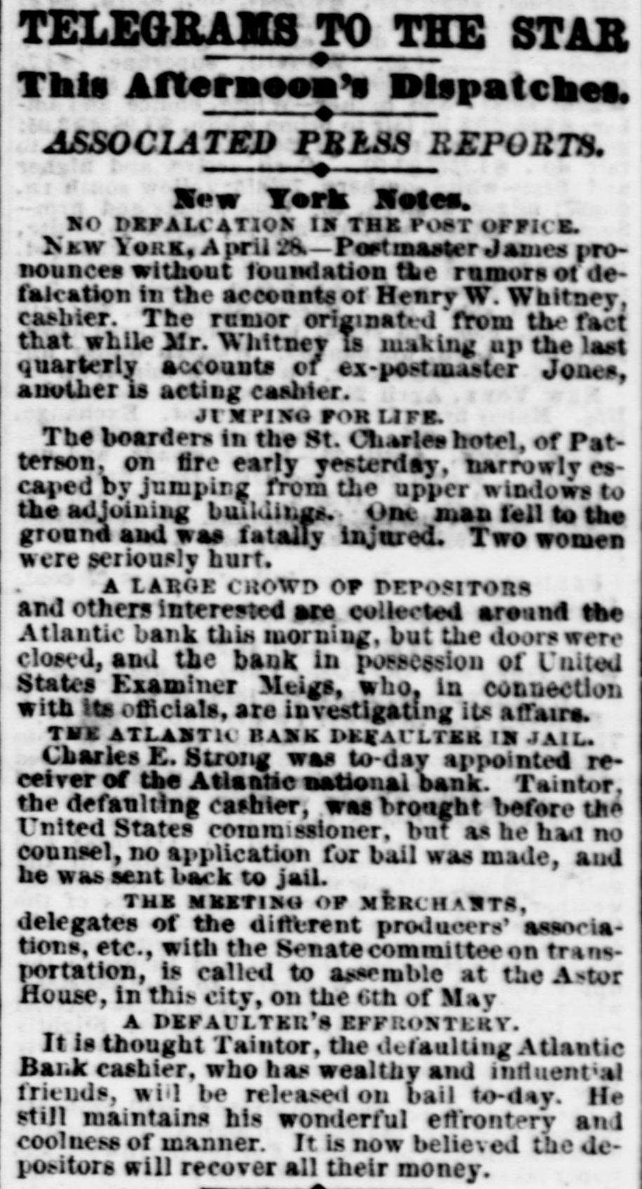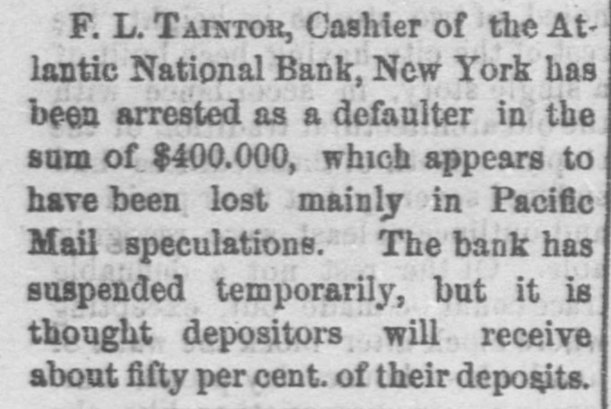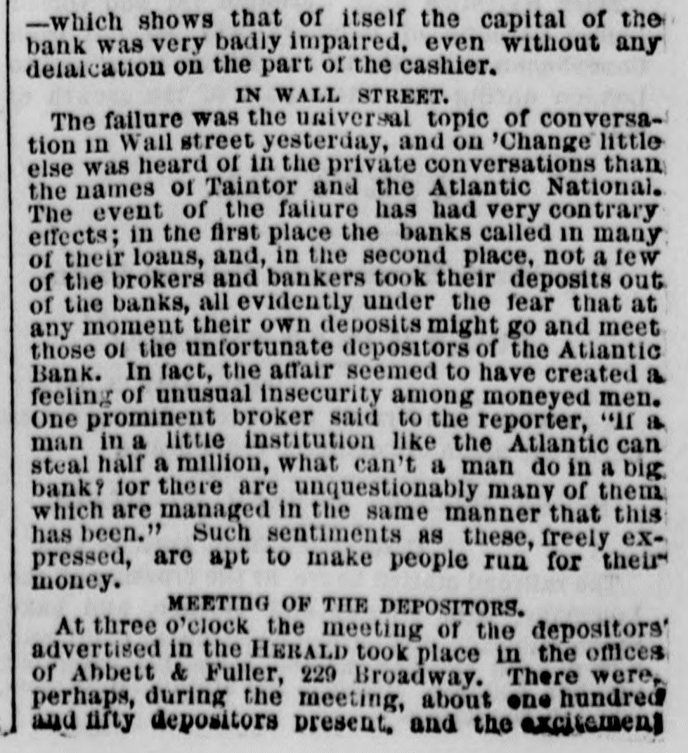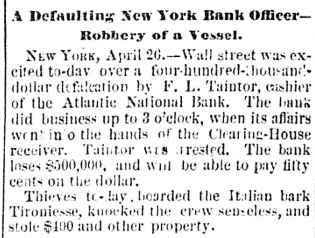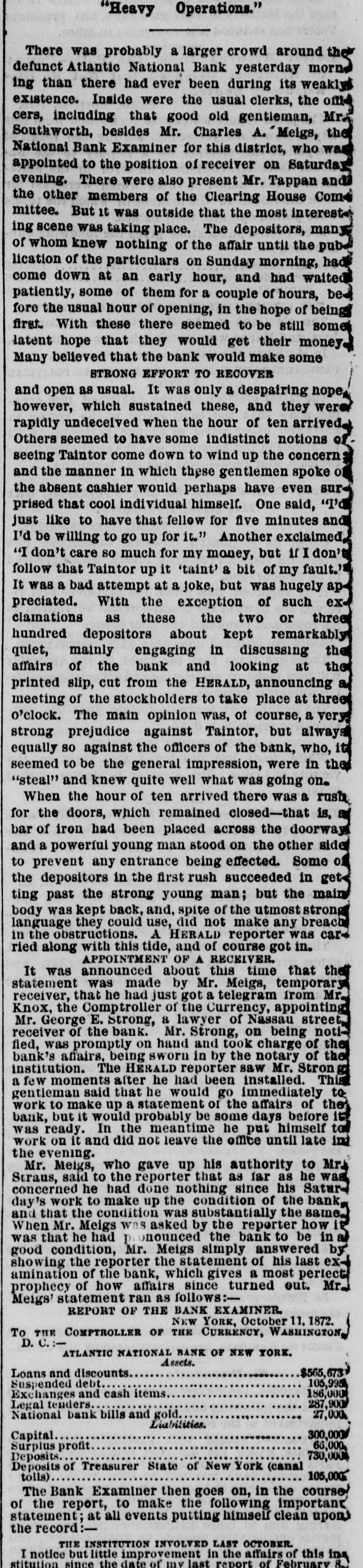Heavy Defalcation in the Atlantic National Bank. Just as Wall street was about putting up the shutters yesterday a rumor got rapid circulation that the Atlantic National Bank, an institution of moderate activity and fair reputation, having its counting house in Nassau street, nearly opposite the Post Office, had been compelled to suspend. In this respect the rumor was literally an untruth, at least for the day, as the Bank, desperately defying the fate which circumstances afterward proved must be inevitable, paid every dollar demanded of it until the arrival of the hour of three o'clock, when it legally closed its doors, as it could, against all claimants for the day. The trouble is the old story of stock speculation by the cashier and a defalcation in his accounts, the amount involved in this instance being nearly half a million. A curious feature of the affair is the deliberate conduct of the cashier in disclosing his "misdeeds. With a frankness which, under the circumstances, would almost argue the loss of the man's wits, he proceeded to the Clearing House, of which the Bank was a member, and coolly requested an investigation of his books and an examination of the Bank's affairs, stating at the same time that he was a defaulter in his cash account. A committee of the Clearing House acceded to his request, and, as a result of their labors, it was announced last evening that the institution was bankrupt and would not be able to resume on Monday. The facts were telegraphed to the Comptroller of the Currency, who has ordered the appointment of a receiver. In one sense, therefore, the Bank has failed, and in another it has not. It was open and paid all claims up to three o'clock yesterday. But the interval to ten o'clock Monday morning is a legal holiday for the Bank, so that the action of the Comptroller of the Currency looks upon the face of it as if he had appointed a receiver without sufficient legal reason. This controversy aside, the defalcation of the cashier comes as a sermon full of point this Spring Sunday, when our several hundred metropolitan congregations run their eyes over the decalogue at church this morning and read its included command, "Thou shalt not steal." The Atlantic National Bank, as its name implies, was of the national system, and only a few weeks ago made its sworn statement of assets and liabilities. The fact evokes another inquiry, Who was it that broke the other commandment, "Thou shalt not bear false witness," and how many more of the decalogue were broken in this same crime of defalcation?