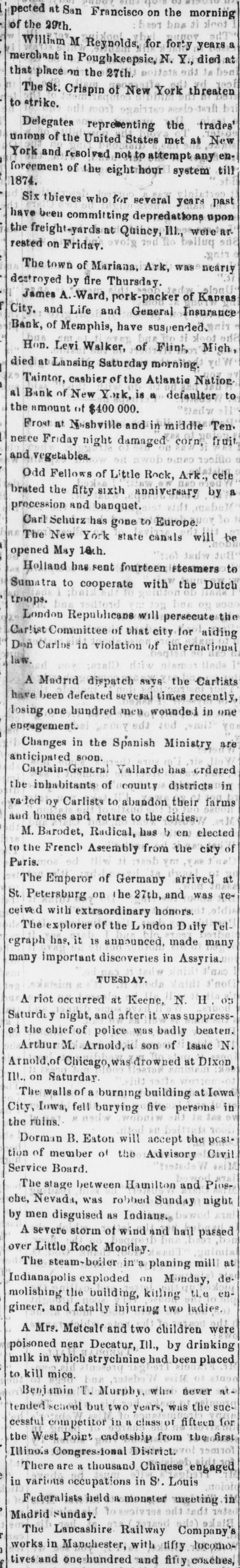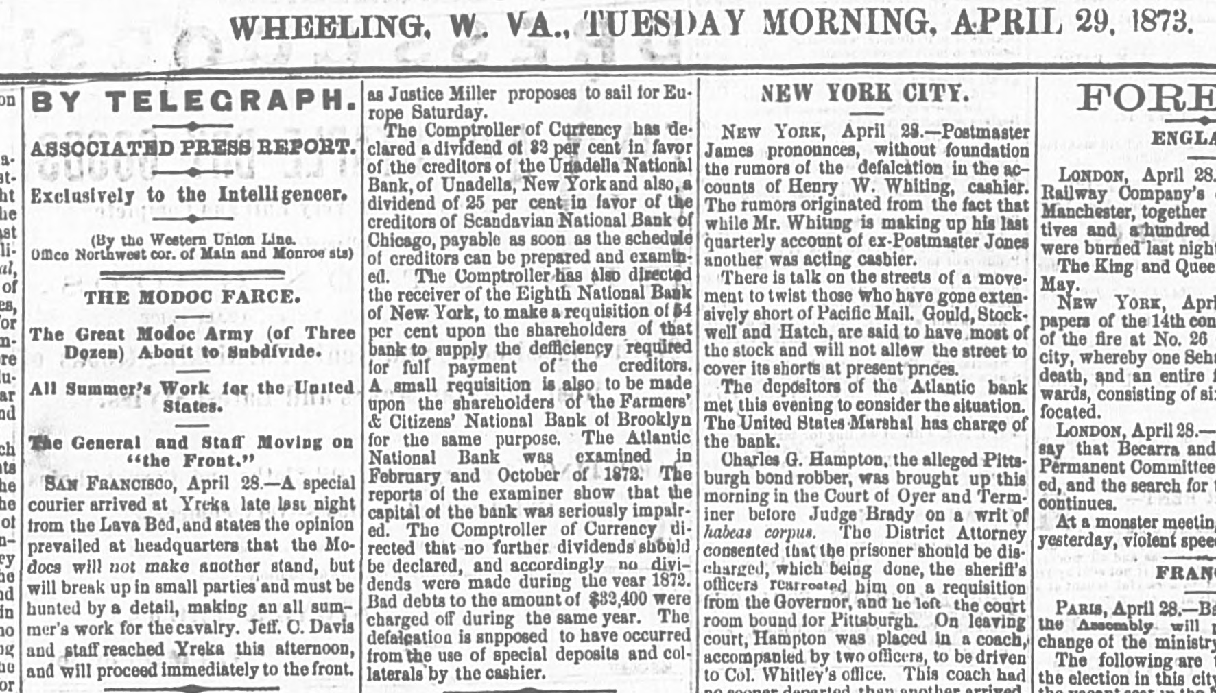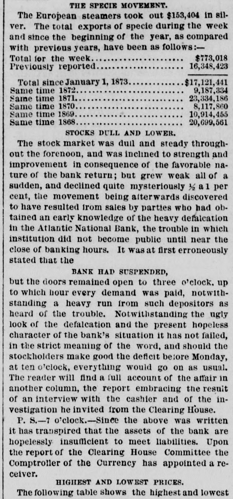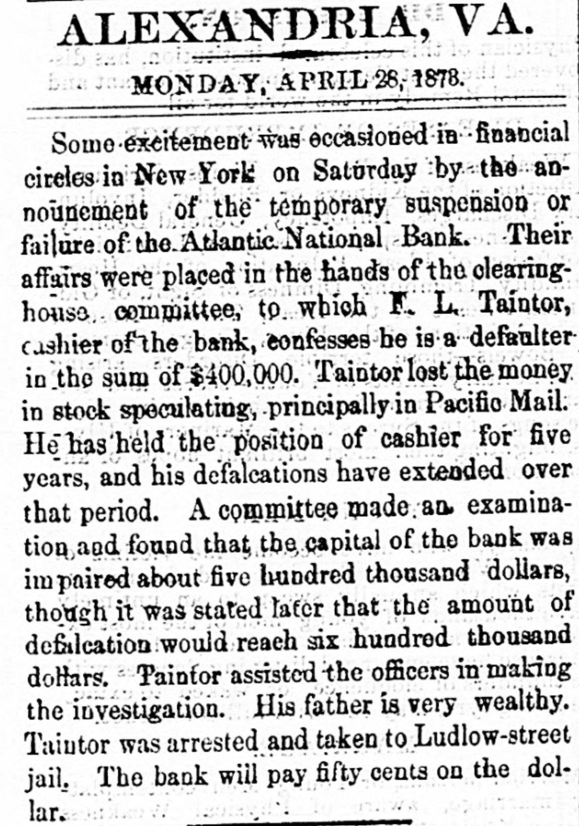 Heavy Defalcation in the Atlantic National Bank. Just as Wall street was about putting up the shutters yesterday a rumor got rapid circulation that the Atlantic National Bank, an institution of moderate activity and fair reputation, having its counting house in Nassau street, nearly opposite the Post Office, had been compelled to suspend. In this respect the rumor was literally an untruth, at least for the day, as the Bank, desperately defying the fate which circumstances afterward proved must be inevitable, paid every dollar demanded of it until the arrival of the hour of three o'clock, when it legally closed its doors, as it could, against all claimants for the day. The trouble is the old story of stock speculation by the cashier and a defalcation in his accounts, the amount involved in this instance being nearly half a million. A curious feature of the affair is the deliberate conduct of the cashier in disclosing his "misdeeds. With a frankness which, under the circumstances, would almost argue the loss of the man's wits, he proceeded to the Clearing House, of which the Bank was a member, and coolly requested an investigation of his books and an examination of the Bank's affairs, stating at the same time that he was a defaulter in his cash account. A committee of the Clearing House acceded to his request, and, as a result of their labors, it was announced last evening that the institution was bankrupt and would not be able to resume on Monday. The facts were telegraphed to the Comptroller of the Currency, who has ordered the appointment of a receiver. In one sense, therefore, the Bank has failed, and in another it has not. It was open and paid all claims up to three o'clock yesterday. But the interval to ten o'clock Monday morning is a legal holiday for the Bank, so that the action of the Comptroller of the Currency looks upon the face of it as if he had appointed a receiver without sufficient legal reason. This controversy aside, the defalcation of the cashier comes as a sermon full of point this Spring Sunday, when our several hundred metropolitan congregations run their eyes over the decalogue at church this morning and read its included command, "Thou shalt not steal." The Atlantic National Bank, as its name implies, was of the national system, and only a few weeks ago made its sworn statement of assets and liabilities. The fact evokes another inquiry, Who was it that broke the other commandment, "Thou shalt not bear false witness," and how many more of the decalogue were broken in this same crime of defalcation?