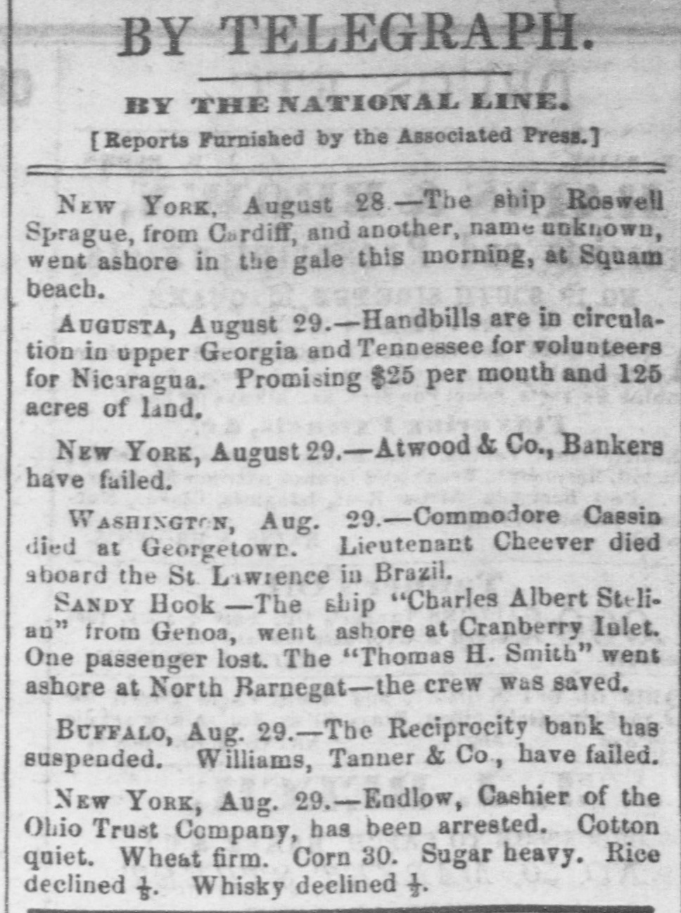 BY TELEGRAPH. BY THE NATIONAL LINE. [Reports Furnished by the Associated Press.] NEW YORK, August 28.-The ship Roswell Sprague, from Cardiff, and another, name unknown, went ashore in the gale this morning, at Squam beach. Augusta, August 29.-Handbills are in circulation in upper Georgia and Tennessee for volunteers for Nicaragua. Promising $25 per month and 125 acres of land, New YORK, August 29.-Atwood & Co., Bankers have failed. WASHINGTON, Aug. 29.-Commodore Cassin died at Georgetown. Lieutenant Cheever died aboard the St. Lawrence in Brazil. SANDY Hook -The ship "Charles Albert Stelian" from Genoa, went ashore at Cranberry Inlet. One passenger lost. The "Thomas H. Smith" went ashore at North Barnegat-the crew was saved. Buffalo, Aug. 29.-The Reciprocity bank has suspended. Williams, Tanner & Co, have failed. NEW YORK, Aug. 29.-Endlow, Cashier of the Ohio Trust Company, has been arrested. Cotton quiet. Wheat firm. Corn 30. Sugar heavy. Rice declined to Whisky deelined 1.