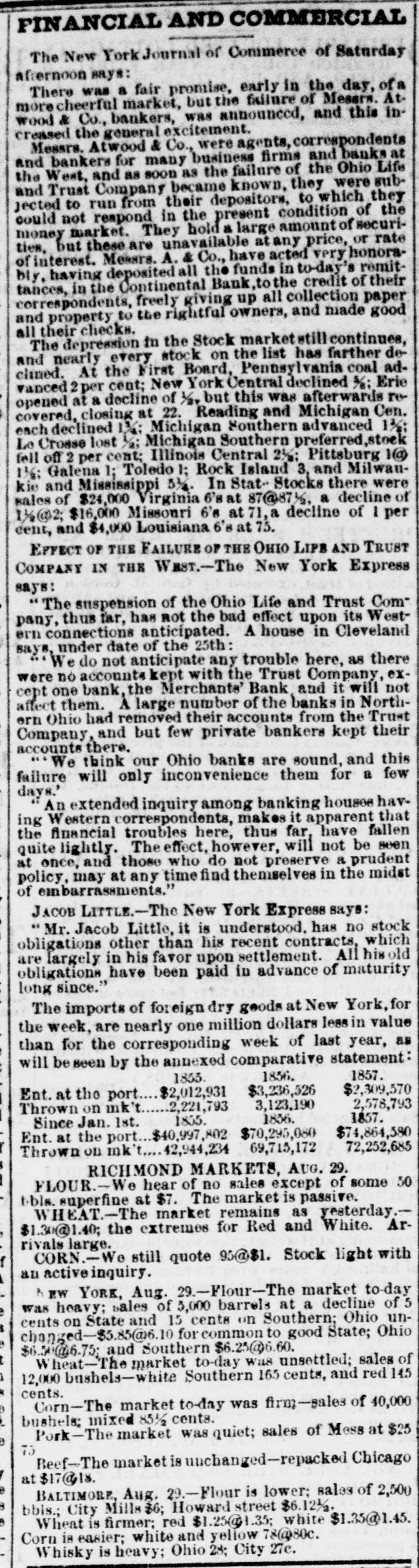 FINANCIAL AND COMMERCIAL The New York Journal of Commerce of Saturday afternoon says: There was a fair promise, early in the day, of a more cheerful market, but the failure of Mesars. Atwood & Co., bankers, was announced, and this increased the general excitement. Messrs. Atwood & Co., were agents, correspondents and bankers for many business firms and banks at the West, and as soon as the failure of the Ohio Life and Trust Company became known, they were subjected to run from their depositors, to which they could not respond in the present condition of the money market. They hold a large amount of securities, but these are unavailable at any price, or rate of interest. Messrs. A. & Co., have acted very honorably, having deposited all the funds in to-day's remittances, in the Continental Bank, to the credit of their correspondents, freely giving up all collection paper and property to the rightful owners, and made good all their checks. The depression in the Stock market still continues, and nearly every stock on the list has farther declined. At the First Board, Pennsylvania coal advanced 2 per cent; New York Central declined %; Erie opened at a decline of ½, but this was afterwards recovered, closing at 22. Reading and Michigan Cen. each declined 14: Michigan Southern advanced 1%; Le Crosse lost : Michigan Southern preferred, stock fell off 2 per cent; Illinois Central 2%; Pittsburg 1@ 14; Galena 1; Toledo 1; Rock Island 3, and Milwaukie and Mississippi 5%. In Stat Stocks there were sales of $24,000 Virginia 6's at 87@87%, a decline of 1%@2; $16,000 Missouri 6's at 71, a decline of 1 per cent, and $4,000 Louisiana 6's at 75. EFFECT OF THE FAILURE OF THE OHIO LIPE AND TRUST COMPANY IN THE WEST.-The New York Express says: "The suspension of the Ohio Life and Trust Company, thus far, has not the bad effect upon its Western connections anticipated. A house in Cleveland says, under date of the 25th: "We do not anticipate any trouble here, as there were no accounts kept with the Trust Company, except one bank, the Merchants' Bank and it will not affect them. A large number of the banks in Northern Ohio had removed their accounts from the Trust Company, and but few private bankers kept their accounts there. "We think our Ohio banks are sound, and this failure will only inconvenience them for a few days.' An extended inquiry among banking houses having Western correspondents, makes it apparent that the financial troubles here, thus far, have fallen quite lightly. The effect, however, will not be seen at once, and those who do not preserve a prudent policy, may at any time find themselves in the midst of embarrassments." JACOB LITTLE. -The New York Express says: "Mr. Jacob Little, it is understood, has no stock obligations other than his recent contracts, which are largely in his favor upon settlement. All his old obligations have been paid in advance of maturity long since." The imports of foreign dry goods at New York, for the week, are nearly one million dollars less in value than for the corresponding week of last year, as will be seen by the annexed comparative statement: ``` 1855. 1856. 1857. Ent. at the port.... $2,012,931 $3,236,526 $2,309,570 Thrown on mk't. 2,221,793 3,123,190 2,578,793 Since Jan. 1st. 1855. 1856. 1857. Ent. at the port... $40,997,802 $70,295,080 $74,864,580 Thrown on mk't.... 42,944,234 69,715,172 72,252,685 ``` RICHMOND MARKETS, AUG. 29. FLOUR. We hear of no sales except of some 50 tbls. superfine at $7. The market is passive. WHEAT.-The market remains as yesterday.-$1.30@1.40; the extremes for Red and White. Arrivals large. CORN. We still quote 95@$1. Stock light with an active inquiry. EW YORK, Aug. 29.-Flour-The market to-day was heavy; bales of 3,000 barrels at a decline of 5 cents on State and 15 cents on Southern; Ohio un-changed-$5.85@6.10 for common to good State; Ohio $6.50@6.75; and Southern $6.25@6.60. Wheat-The market to-day was unsettled; sales of 12,000 bushels-white Southern 165 cents, and red 145 cents. Corn-The market to-day was firm-sales of 40,000 bushels; mixed 85½ cents. Pork-The market was quiet; sales of Mess at $25 75 Beef The market is unchanged-repacked Chicago at $17@18. BALTIMORE, Aug. 29. Flour is lower; sales of 2,500 bbis.; City Mills 36; Howard street $6.12½. Wheat is firmer; red $1.25@1.35; white $1.35@1.45. Corn is easier; white and yellow 78@80c. Whisky is heavy; Ohio 28; City 27c.