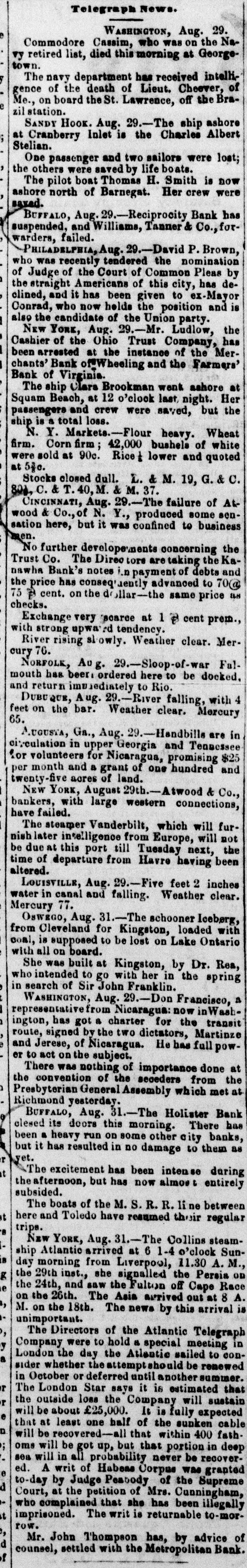 Telegraph News. WASHINGTON, Aug. 29. Commodore Cassim, who was on the Navy retired list, died this morning at Georgetown. The navy department has received intelligence of the death of Lieut. Cheever, of Me., on board the St. Lawrence, off the Brazil station. SANDY Hook. Aug. 29.-The ship ashore at Cranberry Inlet is the Charles Albert Stelian. One passenger and two sailors were lost; the others were saved by life boats. The pilot boat Thomas H. Smith is now ashore north of Barnegat. Her crew were saved. BUFFALO, Aug. 29.-Reciprocity Bank has suspended, and Williams, Tanner & Co.,forwarders, failed. Philadelphia,Aug. 29.-David P. Brown, who was recently tendered the nomination of Judge of the Court of Common Pleas by the straight Americans of this city, has declined, and it has been given to ex-Mayor Conrad, who now holds the position and is also the candidate of the Union party. NEW YORK, Aug. 29.-Mr. Ludlow, the Cashier of the Ohio Trust Company, has been arrested at the instance of the Merchants' Bank of-Wheeling and the Farmers' Bank of Virginia. The ship Clars Brookman went ashore at Squam Beach, at 12 o'clook last, night. Her passengers and crew were saved, but the ship is a total loss. N. Y. Markets.-Flour heavy. Wheat firm. Corn firm; 42,000 bushels of white were sold at 90c. Rice t lower and quoted at 54c. Stocks closed dull. L. & M. 19, G. & C. 801, C. & T. 40, M. & M. 37. CINCINNATI, Aug. 29.-The failure of Atwood & Co., of N. Y., produced some sensation here, but it was confined to business men. No further developements concerning the Trust Co. The Direc tore aretaking the Kanawha Bank's notes i.n payment of debts and the price has consequently advanced to 70@ 75 P cent. on the dollar-the same price ILH checks. Exchange very scarce at 1 & cent prem., with strong upwa tendency. River rising slowly. Weather clear. Mercury 76. NORFOLK, Aug. 29.-Sloop-of-war Falmouth has beer, ordered here to be docked. and return imprediately to Rio. DUBUQUE, Aug. 29.-River falling, with 4 65. feet on the bar. Weather clear. Mercury AUGUSTA, Ga., Aug. 29.-Handbills are in circulation in upper Georgia and Tennessee for volunteers for Nicaragua, promising $25 per month and a grant of one hundred and twenty-five acres of land. NEW YORK, August 29th.Atwood & Co., bankers, with large western connections, have failed. The steamer Vanderbilt, which will furnishlater intelligence from Europe, will not be due at this port till Tuesday next, the time of departure from Havre having been altered. LOUISVILLE, Aug. 29.-Five feet 2 inches water in canal and falling. Weather clear. Mercury 77. Oswego, Aug. 31.-The schooner Iceberg, from Cleveland for Kingston, loaded with coal, is supposed to be lost on Lake Ontario with all on board. She was built at Kingston, by Dr. Rea, who intended to go with her in the spring in search of Sir John Franklin. WASHINGTON, Aug. 29.-Don Francisco, a representative from Nicaragua: now inWashington, has got a charter for the transit route, signed by the two dictators, Martinze and Jerese, of Nicaragua. He has full powor to act on the subject. There was nothing of importance done at the convention of the seceders from the Presbyterian General Assembly which met at Richmond yesterday. BUFFALO, Aug. 31.-The Holister Bank clesed its doors this morning. There has been a heavy run on some other city banks, but it has resulted in no damage to them as yet. The excitement has been intense during theafternoon, but has now almos & entirely subsided. The boats of the M. S. R. R. li ne between here and Toledo have resumed their regular trips. NEW YORK, Aug. 31.-The Collins steamship Atlantic arrived at 6 1-4 o'clock Sunday morning from Liverpool, 11.30 A. M., the 29th inst., she signalled the Persia on g the 24th, and saw the Fulton off Cape Race on the 26th. The Asia agrived out at 8 A. M. on the 18th. The news by this arrival is unimportant. The Directors of the Atlantic Telegraph Company were to hold a special meeting in y London the day the Atlentic sailed to cona sider whether the attemptshould be renewed in October or deferred until another summer. The London Star says it is estimated that the outside loss the Company will sustain will be about £25,000. It is fully expected e that at least one half of the sunken cable n will be recovered-all that within 400 fathoms will be got up, but that portion in deep sea will in all probability never be recovered. A writ of Habens Corpus was granted to-day by Judge Peabody of the Supreme