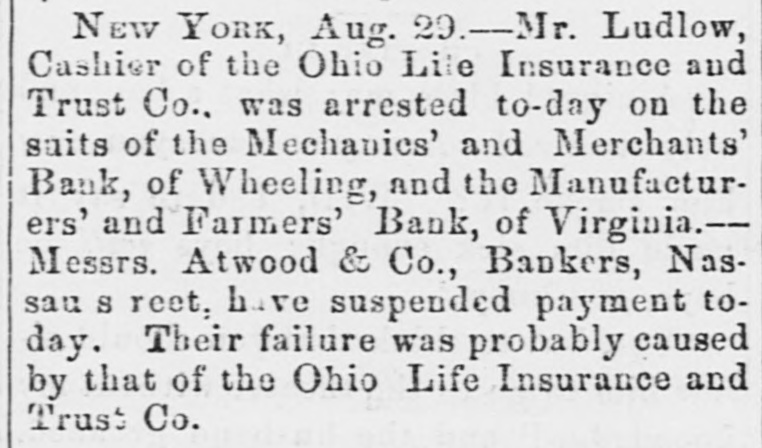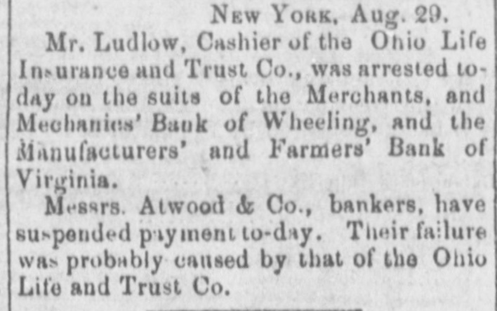 NEW YORK, Aug. 29. Mr. Ludlow, Cashier of the Ohio Life Insurance and Trust Co., was arrested today on the suits of the Merchants, and Mechanics' Bank of Wheeling, and the Manufacturers' and Farmers' Bank of Virginia. Messrs. Atwood & Co., bankers, have suspended payment to-day. Their failure was probably caused by that of the Ohio Life and Trust Co.