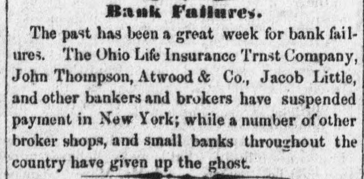 Bank Failures. The past has been a great week for bank failures. The Ohio Life Insurance Trnst Company, John Thompson, Atwood & Co., Jacob Little, and other bankers and brokers have suspended payment in New York; while a number of other broker shops, and small banks throughout the country have given up the ghost.