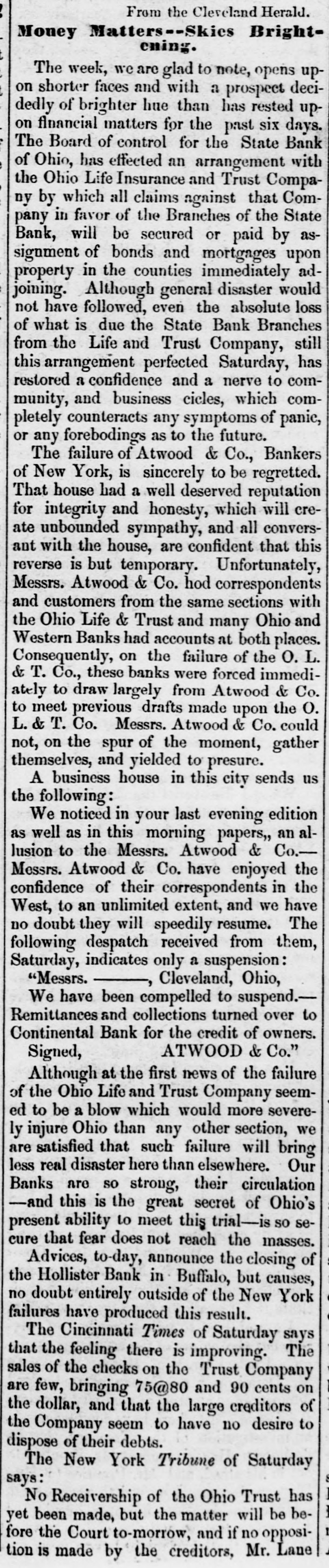 From the Cleveland Herald. Money Matters--Skics Brightening. The week, we are glad to note, opens upon shorter faces and with a prospect decidedly of brighter hue than has rested upon financial matters for the past six days. The Board of control for the State Bank of Ohio, has effected an arrangement with the Ohio Life Insurance and Trust Company by which all claims against that Company in favor of the Branches of the State Bank, will be secured or paid by assignment of bonds and mortgages upon property in the counties immediately adjoining. Although general disaster would not have followed, even the absolute loss of what is due the State Bank Branches from the Life and Trust Company, still this arrangement perfected Saturday, has restored a confidence and a nerve to community, and business cicles, which completely counteracts any symptoms of panie, or any forebodings as to the future. The failure of Atwood & Co., Bankers of New York, is sincerely to be regretted. That house had a well deserved reputation for integrity and honesty, which will create unbounded sympathy, and all conversant with the house, are confident that this reverse is but temporary. Unfortunately, Messrs. Atwood & Co. hod correspondents and customers from the same sections with the Ohio Life & Trust and many Ohio and Western Banks had accounts at both places. Consequently, on the failure of the O. L. & T. Co., these banks were forced immediately to draw largely from Atwood & Co. to meet previous drafts made upon the O. L. & T. Co. Messrs. Atwood & Co. could not, on the spur of the moment, gather themselves, and yielded to presure. A business house in this city sends us the following: We noticed in your last evening edition as well as in this morning papers, an allusion to the Messrs. Atwood & Co.Messrs. Atwood & Co. have enjoyed the confidence of their correspondents in the West, to an unlimited extent, and we have no doubt they will speedily resume. The following despatch received from them, Saturday, indicates only a suspension: "Messrs. Cleveland, Ohio, We have been compelled to suspend.Remittances and collections turned over to Continental Bank for the credit of owners. ATWOOD & Co." Signed, Although at the first news of the failure of the Ohio Life and Trust Company seemed to be a blow which would more severely injure Ohio than any other section, we are satisfied that such failure will bring less real disaster here than elsewhere. Our Banks are so strong, their circulation -and this is the great secret of Ohio's present ability to meet this trial-is so secure that fear does not reach the masses. Advices, to-day, announce the closing of the Hollister Bank in Buffalo, but causes, no doubt entirely outside of the New York failures have produced this result. The Cincinnati Times of Saturday says that the feeling there is improving. The sales of the checks on the Trust Company are few, bringing 75@80 and 90 cents on the dollar, and that the large creditors of the Company seem to have no desire to dispose of their debts. The New York Tribune of Saturday says: No Receivership of the Ohio Trust has 3 yet been made, but the matter will be be1 fore the Court to-morrow, and if no opposiL tion is made by the creditors, Mr. Lane