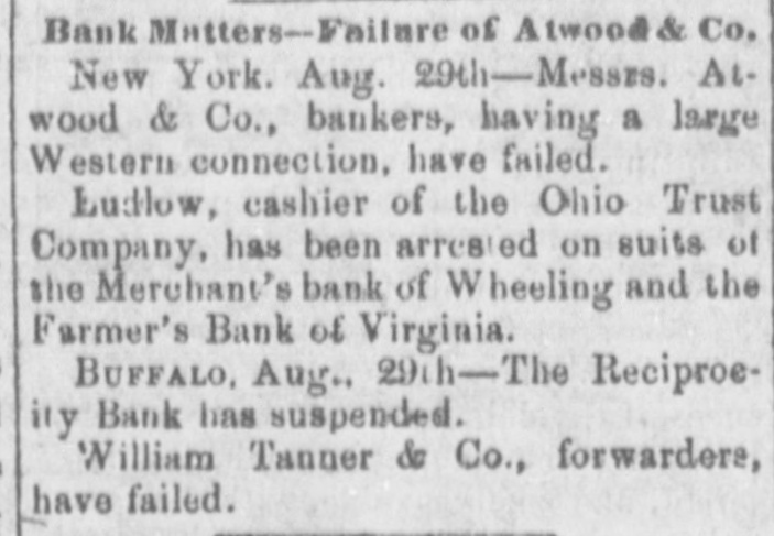 Bank Matters-Failare of Atwood & Co. New York. Aug. 29th-Messrs. Atwood & Co., bankers, having a large Western connection, have failed. Ludlow, cashier of the Ohio Trust Company, has been arrested on suits of the Merchant's bank of Wheeling and the Farmer's Bank of Virginia. BUFFALO, Aug., 29th-The Reciproeity Bank has suspended. William Tanner & Co., forwarders, have failed.