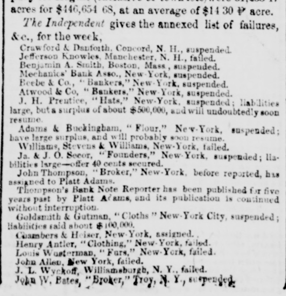 acres for $446,654 68, at an average of $14.30 P acre. The Independent gives the annexed list of failures, &c., for the week, Crawford & Danforth. Concord, N. H., suspended. Jefferson Knowles, Manchester, N. H., failed. Benjamin A. Smith, Boston, Mass, suspended. Mechanics' Bank Asso., New-York, suspended. Beebe & Co., "Bankers," New-York, suspended. Atwood & Co, Bankers," New-York, suspended. J. H. Prentice, "Hats," New-York, suspended; liabilities large, buts surplus of about $500,000, and will undoubtedly soon resume. Adams & Buckingbam, Flour," New-York, suspended; have large surplus, and will probably soon resume. Williams, Stevens & Williams, New-York, failed. Ja. & J. O. Secor, "Founders," New-York, suspended; llabilities large-offer 40 cents secured. John Thompson, "Broker," New-York, before reported, his assigned to Platt Adams. Thompson's Bank Note Reporter has been published for five years past by Platt Adams, and its publication is continued without interruption. Goldsmith & Gutman, "Cloths" New-York City, suspended; liabilities said about $100,000. Chambers & Heiser, New-York, assigned. Henry Antler, "Clothing," New-York, failed. Louis Wasterman, "Furs," New-York, failed. John Allen, New York, failed. J.L. Wyckoff, Williamsburgh, N. Y., failed. John W, Bates, "Broker," Troy, N. Y., suspended
