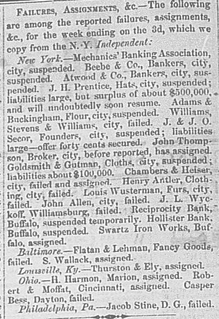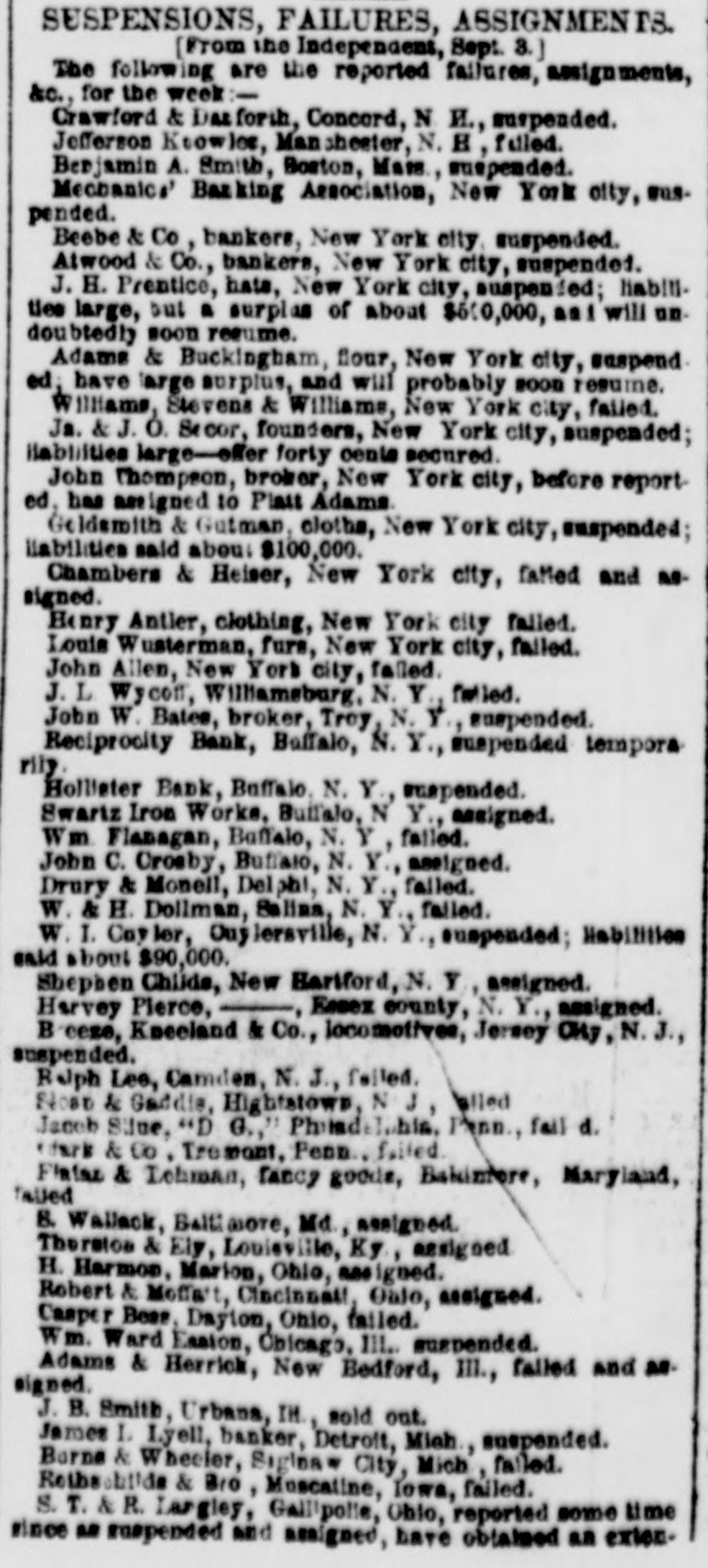 SUSPENSIONS, FAILURES, ASSIGNMENTS [From the Independent, Sept. 3.] The following are the reported failures, assignments, &c., for the week:Crawford & Darforth, Concord, N И., suspended. Jefferson Ktowler, Man chester, N. H, filled. Benjamin A. Smith, Boston, Mass, suspended. Mechanics' Banking Association, New York city, waspended. Beebe & Co, bankers, New York city, suspended. Atwood & Co., bankers, New York city, suspended. J. H. Prentice, hats, New York city, suspensed; liabilities large, but a surplas of about $600,000, and will undoubtedly soon resume. Adams & Buckingham, flour, New York city, suspend. ed; have large surplus, and will probably BOOD resume. Williams, Stevens & Williams, New York city, failed. Ja. & J. O. Secor, founders, New York city, suspended; liabilities large-offer forty cents secured. John Thompson, brower, New York city, before reported, has assigned to Platt Adams. Goldsmith & Gutman, cloths, New York city, suspended; liabilities said about $100,000. Chambers & Heiser, New York city, fatted and Msigned. Henry Antler, clothing, New York city failed. Louis Wusterman, furs, New York city, failed. John Allen, New York city, falled. J. L Wycoff, Williamsburg, N. Y., failed. John W. Bates, broker, Troy, N. Y., suspended. Reciprocity Bank, Baffalo, N. Y., suspended tempora. rily. Hollister Bank, Buffalo. N. Y., suspended. Swartz Iron Works, Buifalo, N Y., assigned. Wm Flanagan, Buffalo, N. failed. John C. Crosby, Buffaio, N. X., assigned. Drury & Monell, Delphi, N. Y., falled. W. & H. Dollman, Salima, N. Y., failed. W. I. Coyler, Ouylersville, N. Y., suspended; Habilities said about $90,000. Shephen Childs, New Hartford, N. Y, assigned. Harvey Pierce, Essex county, N. Y., assigned. B ceze, Kneeland & Co., locometives, Jersey any, N. 3., suspended. Relph Lee, Camden, N. J., failed. Noam & Gaddis, Hightstown, NJ, alled Jacob Sline, "D G.,' Philadelphia, Penn., fail d. chark & Do, Trement, Penn., failed. Flatas & Lohman, fancy goods, Bakinrore, Maryland, failed B. Wallack, Baltimore, Md., assigned. Thereton & Ely, Louisville, Kg, assigned H. Harmon, Marion, Ohio, assigned. Robert & Moffait, Cincinnati, Oalo, assigned. Casper Bess, Dayton, Ohio, failed. Wm. Ward Easton, Obicago, III.. suspended. signed. Adams & Herrick, New Bedford, III., falled and m. J. B. Smith, Urbana, IH., sold out. James I. Lyell, banker, Detroit, Mich, suspended. Burne & Wheeler, Signaw City, Mich, failed. Reibschilds & Bro, Muscatine, Iowa, failed. S. T. & R. Largley, Gallipolis, Ohio, reported some time since as suspended and assigned, have obtained an exten-