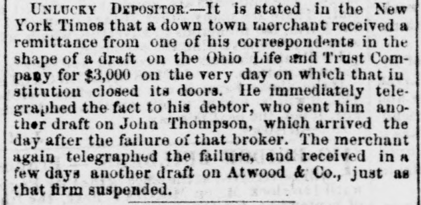 UNLUCKY DEPOSITOR.-It is stated in the New York Times that a down town merchant received a remittance from one of his correspondents in the shape of a draft on the Ohio Life and Trust Company for $3,000 on the very day on which that in stitution closed its doors. He immediately telegraphed the fact to his debtor, who sent him another draft on John Thompson, which arrived the day after the failure of that broker. The merchant again telegraphed the failure, and received in n few days another draft on Atwood & Co., just as that firm suspended.
