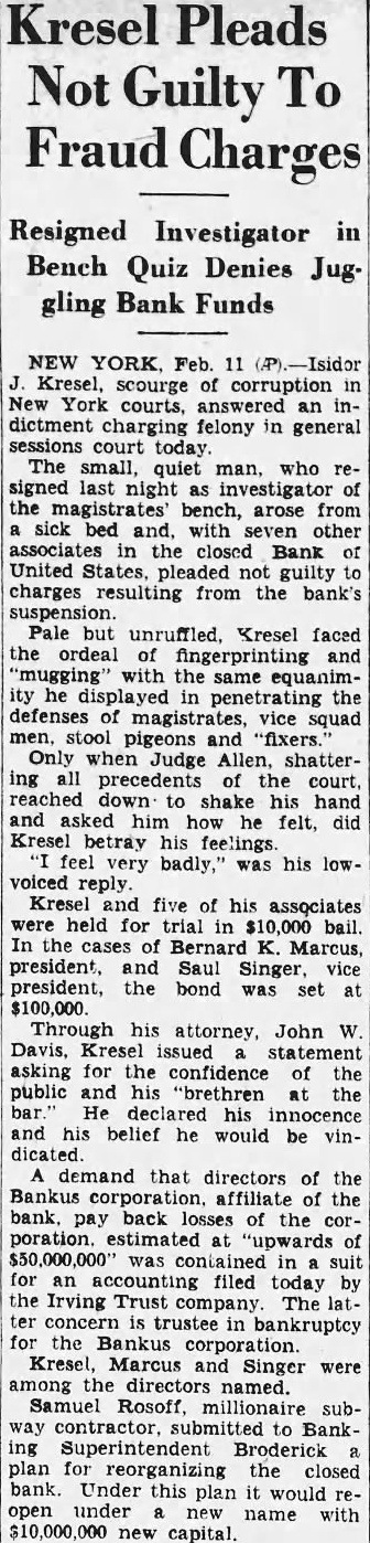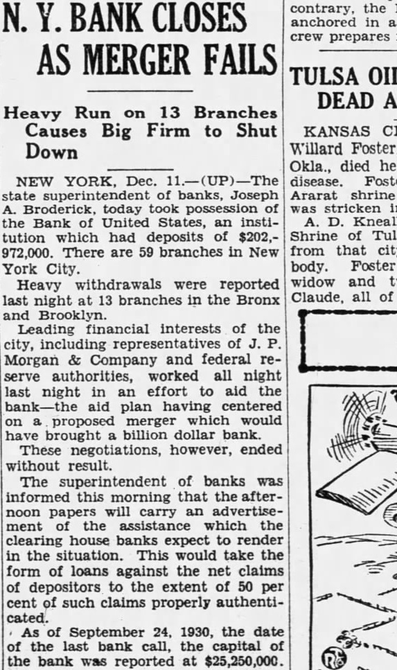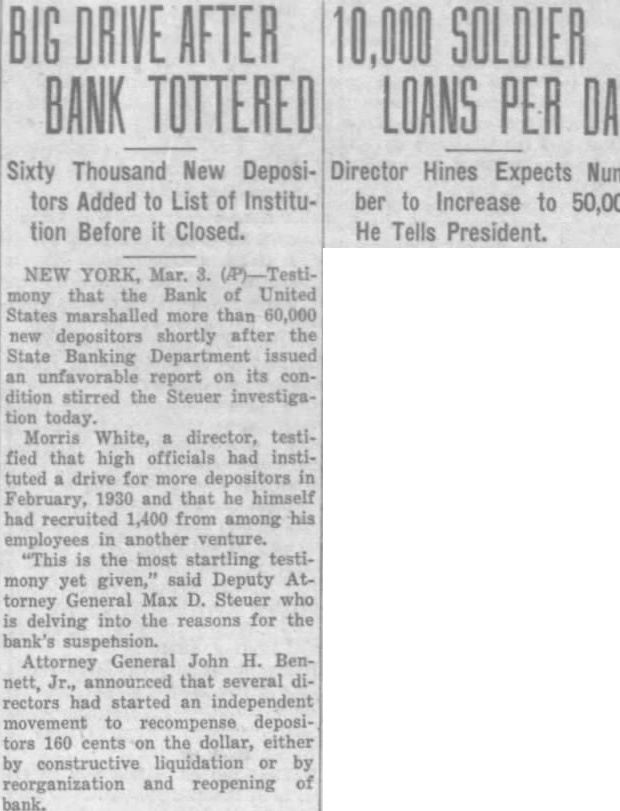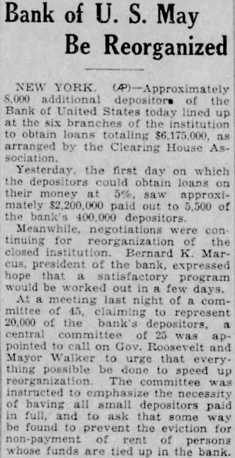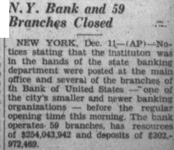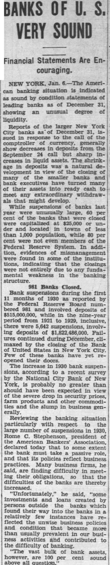 981 Banks Closed. Bank suspensions during the first months of 1930 as reported by the Federal Reserve Board numbered 981 and involved deposits of while in the period from 1921 1929, inclusive, there were 5,642 suspensions, involving deposits of Failcontinued during December, maxed by the closing of the Bank United in York City. Few of these banks have yet opened their doors. The increase in 1930 bank suspensions, according to recent survey by the National City Bank of New York, is probably no greater than should have been expected in view of the severe drop in security prices, farm and other commodities and the slump in business generally. Reviewing the banking situation particularly with respect to the large number of suspensions in 1930, Rome C. Stephenson, president of the American Bankers' Association, declared today that to some extent the bank must take passive role, and that its policies reflect business practices. Many business firms, he said, are finding difficulty in meeting their obligations, that the difficulties of the banks are thereby increased. "Unfortunately," he said, "some investments and loans created by persons outside the banks which found their way into the banks in relatively few instances have flected business policies and condition that became more than usually in our business activities and contributed to the difficulty of "The vast bulk of bank assets, are 100 cent sound above all question.'