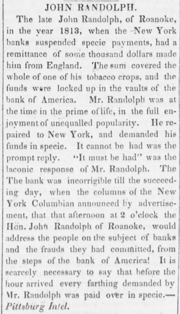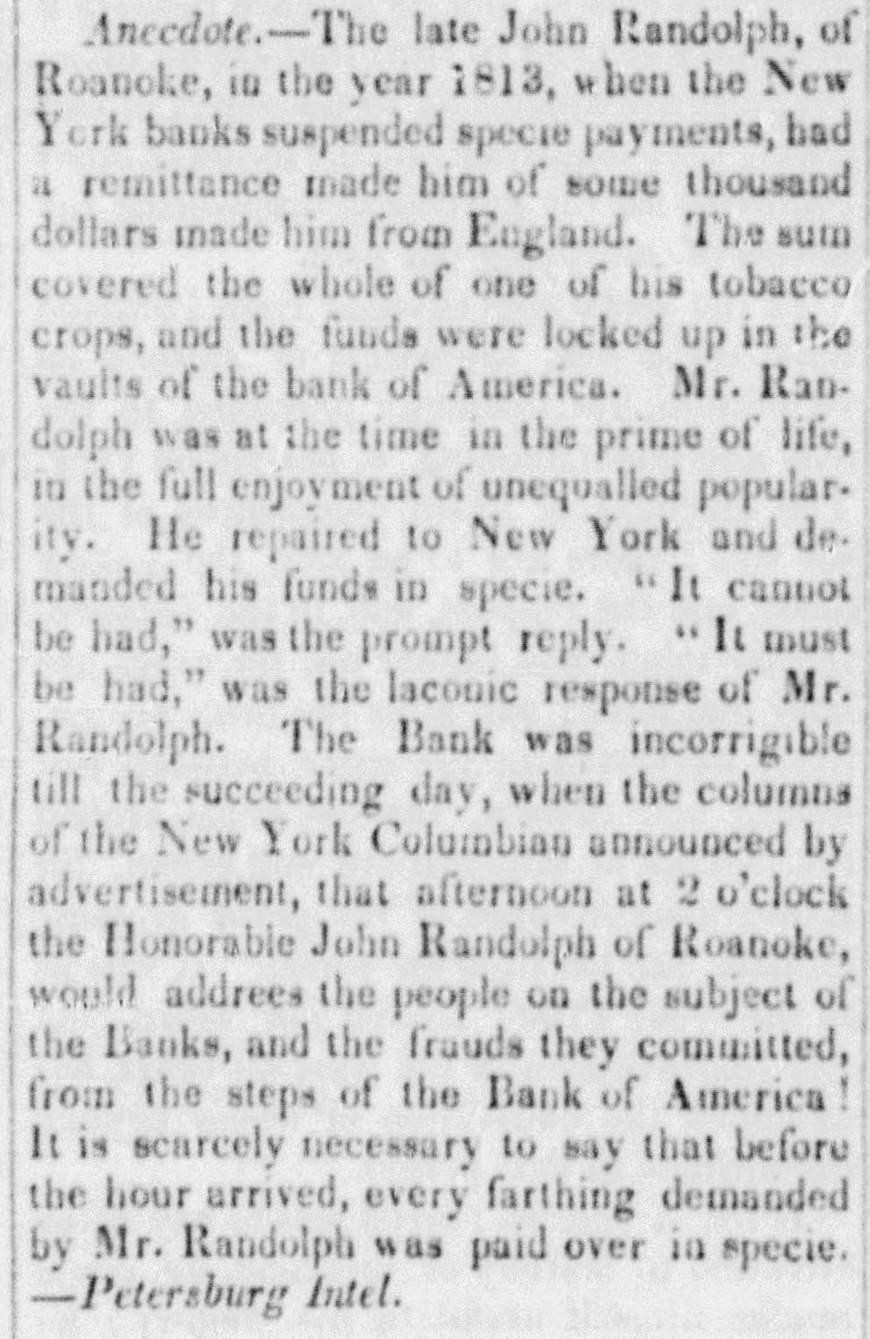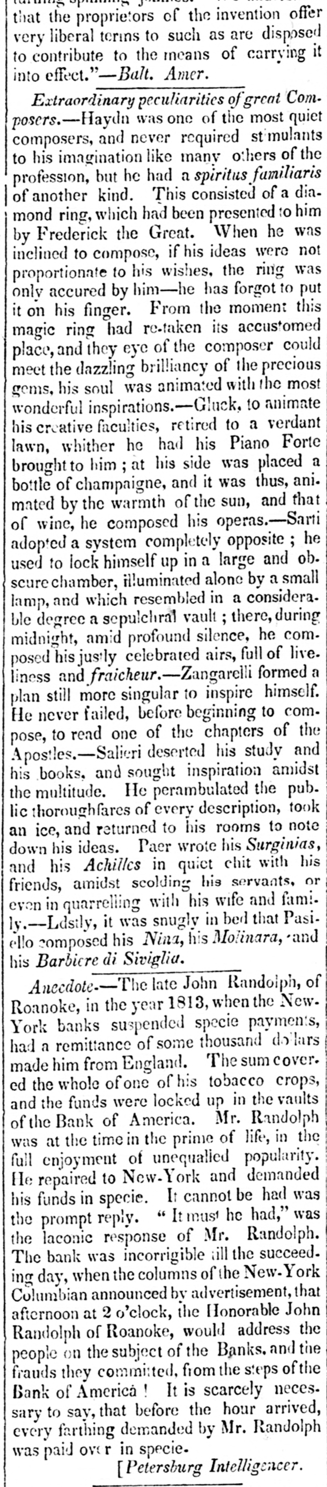 offer that the proprietors of the invention very liberal terms to such as are disposed to contribute to the means of carrying it into effect."-Balt. Amer. Extraordinary peculiarities of great Com. posers.-Haydn was one of the most quiet composers, and never required stimulants to his imagination like many others of the profession, but he had a spiritus familiaris of another kind. This consisted of a diamond ring, which had been presented to him by Frederick the Great. When he was inclined to compose, if his ideas were not proportionate to his wishes, the ring was only accured by him-he has forgot to put it on his finger. From the moment this magic ring had re-taken its accustomed place, and they eye of the composer could meet the dazzling brilliancy of the precious gems, his soul was animated with the most wonderful inspirations.-Gluck, to animate his creative faculties, retired to a verdant lawn, whither he had his Piano Forte brought to him; at his side was placed a bottle of champaigne, and it was thus, ani. mated by the warmth of the sun, and that he his operas.-Sarti a of adopted wine, system composed completely opposite he used to lock himself up in a large and ob. scurechamber, illuminated alone by a small lamp, and which resembled in a considera. ble degree a sepulchral vault; there, during midnight, amid profound silence, he composed his justly celebrated airs, full of live. liness and fraicheur.-Zangarelli formed a plan still more singular to inspire himself. He never failed, before beginning to compose, to read one of the chapters of the Apostles.-Salieri deserted his study and his books, and sought inspiration amidst the multitude. He perambulated the pub. lic thoroughfares of every description, took an ice, and returned to his rooms to note down his ideas. Paer wrote his Surginias, and his Achilles in quiet chit with his friends, amidst scolding his servants, or even in quarrelling with his wife and family.--Ldstly, it was snugly in bed that Pasiello composed his Nina, his Molinara, and his Barbiere di Siviglia. Anecdote-The late John Randoiph, of Roanoke, in the year 1813, when the New. York banks suspended specie payments, had a remittance of some thousand dollars made him from England. The sum cover. ed the whole of one of his tobacco crops, and the funds were locked up in the vaults of the Bank of America. Mr. Randolph was at the time in the prime of life, in the full enjoyment of unequalied popularity. He repaired to New- York and demanded his funds in specie. It cannot be had was the prompt reply. " It must he had," was laconic bank was the The response incorrigible of of Mr. till the the New-York Randolph. succeed. ing day, when the columns Columbian announced by advertisement, that afternoon at 2 o'clock, the Honorable John Randolph of Roanoke, would address the people on the subject of the Banks. and the frauds they committed, from the steps of the Bank of America It is scarcely neces. sary to say, that before the hour arrived, every farthing demanded by Mr. Randolph was paid over in specie. [Petersburg Intelligencer.