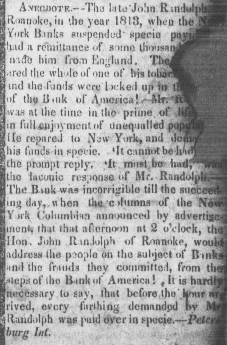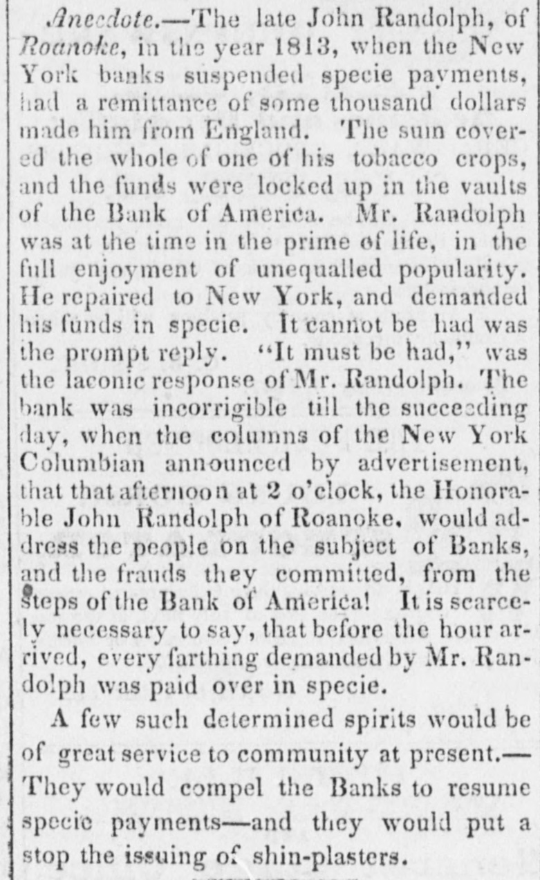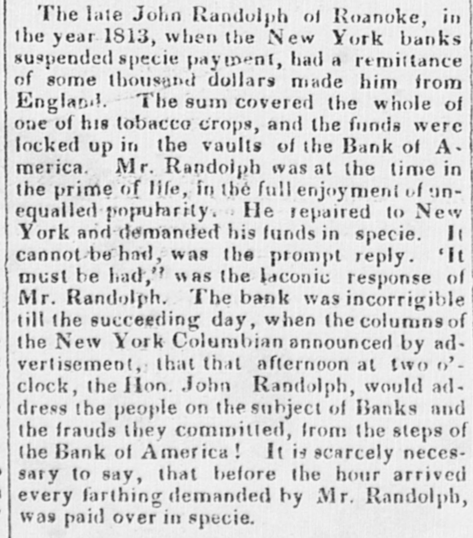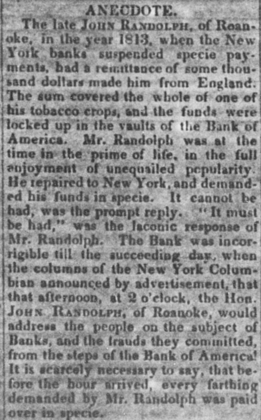 offer that the proprietors of the invention very liberal terms to such as are disposed to contribute to the means of carrying it into effect."-Balt. Amer. Extraordinary peculiarities of great Com. posers.-Haydn was one of the most quiet composers, and never required stimulants to his imagination like many others of the profession, but he had a spiritus familiaris of another kind. This consisted of a diamond ring, which had been presented to him by Frederick the Great. When he was inclined to compose, if his ideas were not proportionate to his wishes, the ring was only accured by him-he has forgot to put it on his finger. From the moment this magic ring had re-taken its accustomed place, and they eye of the composer could meet the dazzling brilliancy of the precious gems, his soul was animated with the most wonderful inspirations.-Gluck, to animate his creative faculties, retired to a verdant lawn, whither he had his Piano Forte brought to him; at his side was placed a bottle of champaigne, and it was thus, ani. mated by the warmth of the sun, and that he his operas.-Sarti a of adopted wine, system composed completely opposite he used to lock himself up in a large and ob. scurechamber, illuminated alone by a small lamp, and which resembled in a considera. ble degree a sepulchral vault; there, during midnight, amid profound silence, he composed his justly celebrated airs, full of live. liness and fraicheur.-Zangarelli formed a plan still more singular to inspire himself. He never failed, before beginning to compose, to read one of the chapters of the Apostles.-Salieri deserted his study and his books, and sought inspiration amidst the multitude. He perambulated the pub. lic thoroughfares of every description, took an ice, and returned to his rooms to note down his ideas. Paer wrote his Surginias, and his Achilles in quiet chit with his friends, amidst scolding his servants, or even in quarrelling with his wife and family.--Ldstly, it was snugly in bed that Pasiello composed his Nina, his Molinara, and his Barbiere di Siviglia. Anecdote-The late John Randoiph, of Roanoke, in the year 1813, when the New. York banks suspended specie payments, had a remittance of some thousand dollars made him from England. The sum cover. ed the whole of one of his tobacco crops, and the funds were locked up in the vaults of the Bank of America. Mr. Randolph was at the time in the prime of life, in the full enjoyment of unequalied popularity. He repaired to New- York and demanded his funds in specie. It cannot be had was the prompt reply. " It must he had," was laconic bank was the The response incorrigible of of Mr. till the the New-York Randolph. succeed. ing day, when the columns Columbian announced by advertisement, that afternoon at 2 o'clock, the Honorable John Randolph of Roanoke, would address the people on the subject of the Banks. and the frauds they committed, from the steps of the Bank of America It is scarcely neces. sary to say, that before the hour arrived, every farthing demanded by Mr. Randolph was paid over in specie. [Petersburg Intelligencer.
