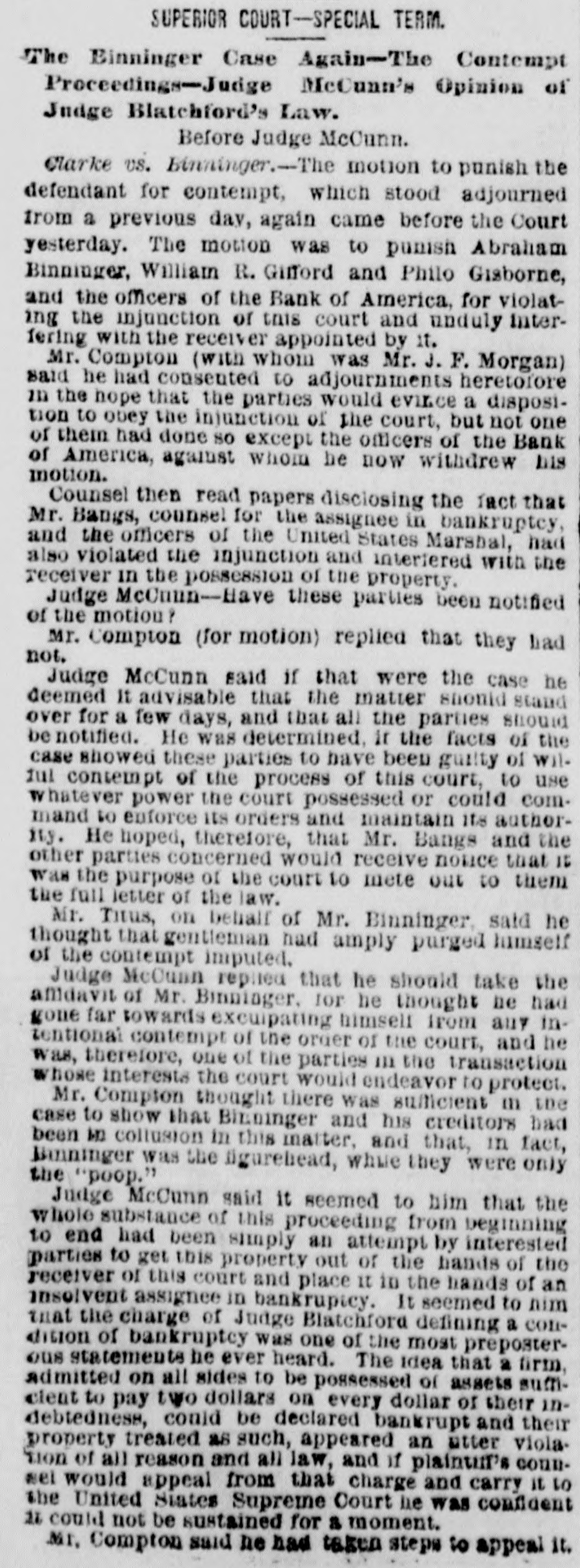 SUPERIOR COURT-SPECIAL TERM. The Einninger Case Again-The Contempt Proceedings-Judge McCunn's Opinion of Judge Blatchford's Law. Before Judge McCunn. Clarke US. Binninger.--The motion to punish the defendant for contempt, which stood adjourned from a previous day, again came before the Court yesterday. The motion was to punish Abraham Binninger, William R. Gifford and Philo Gisborne, and the officers of the Bank of America, for violating the injunction or this court and unduly Interfering with the receiver appointed by it. Mr. Compton (with whom was Mr. J. F. Morgan) said he had consented to adjournments heretofore in the hope that the parties would evince a disposition to obey the injunction of the court, but not one of them had done so except the officers of the Bank of America, against whom be now withdrew his motion. Counsel then read papers disclosing the fact that Mr. Bangs, counsel for the assignee in bankruptcy, and the officers of the United States Marshal, had also violated the injunction and interiered with the receiver in the possession of the property. Judge McCmun-Have these parties been notified of the motion? Mr. Compton (for motion) replied that they had not. Judge McCunn said if that were the case he deemed It advisable that the matter should stand over for a few days, and that all the parties should be notified. He was determined, it the facts of the case showed these parties to have been guilty of will ful contempt of the process of this court, to use whatever power the court possessed or could command to enforce its orders and maintain its authorXty. He hoped, therefore, that Mr. Bangs and the other parties concerned would receive notice that IS was the purpose of the court to mete out to them the full letter of the law. Mr. Titus, on behalf of Mr. Binninger, said he thought that gentleman had amply purged himself of the contempt imputed. Judge McCunn replied that he should take the affidavit of Mr. Binniager, for he thought be had gone far towards excuipating himself from auy intentional contempt of the order of the court, and he was, therefore, one of the parties 111 the transaction whose interests the court would endeavor to protect. Mr. Compton thought there was sufficient in the case to show that Bilninger and his creditors had been be collusion in this matter, and that, in fact, Binninger was the figurehead, while they were only the "poop." Judge McCunn said it seemed to him that the whole substance of this proceeding from beginning to end had been simply an attempt by interested parties to get this property out of the hands of the receiver of this court and place It in the hands of an insolvent assignee in bankruptcy. It seemed to him that the charge of Judge Blatchford defining a condision of bankruptcy was one of the most preposterous statements he ever heard. The idea that a firm, admitted on all sides to be possessed of assets sumcient to pay two dollars on every dollar of their indebtedness, could be declared bankrupt and their property treated as such, appeared an utter viola. tion of all reason and all law, and if plaintif's counset would appeal from that charge and carry it to the United States Supreme Court he was confident 11 could not be sustained for a moment. MI. Compton said he had taken steps to appeal it.