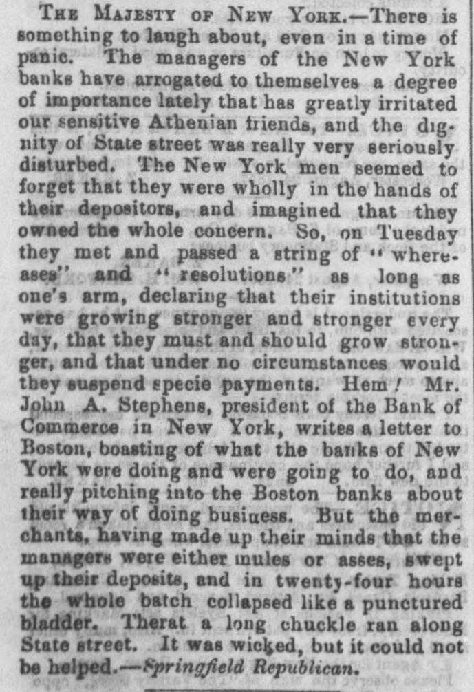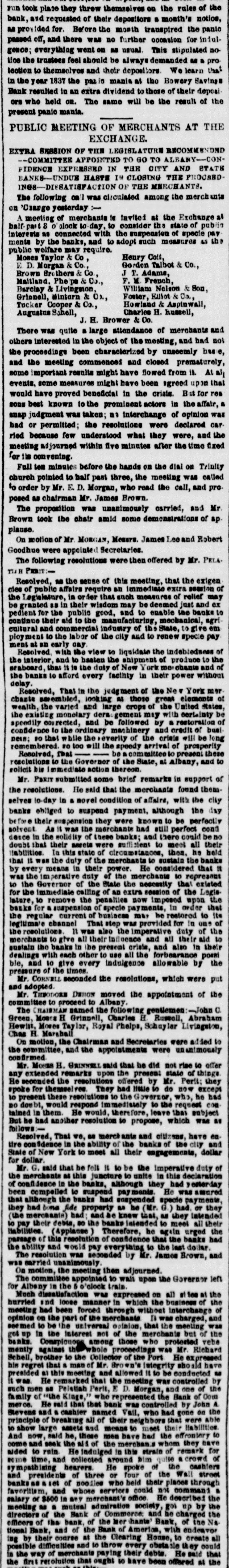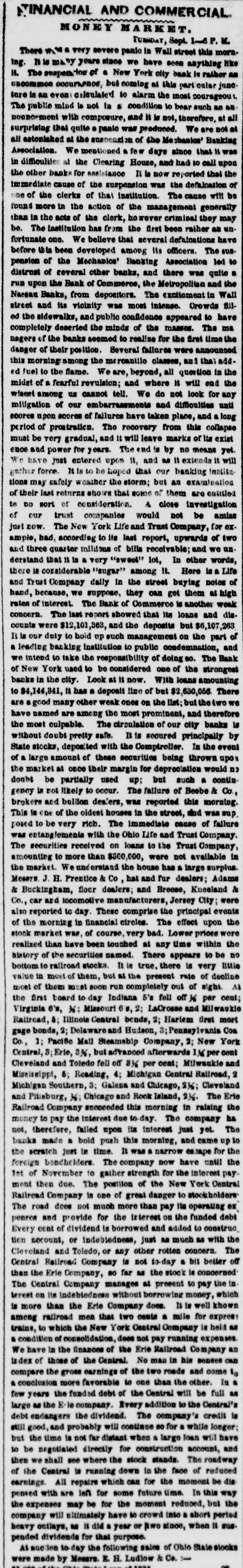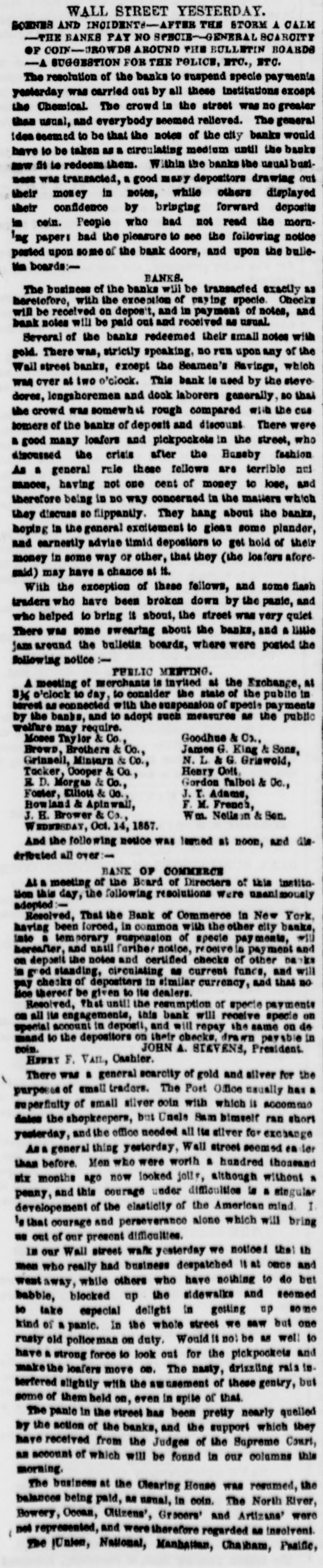 FERMENT. A IN WALL STREET The Defalcation in the Mechanics' Banking Association. SUSPENSION OF THAT INSTITUTION. MORE FAILURES. The Case of Thompson, the Wall Street Banker. AFFAIRS ELSEWHERE, do &c., to., THE EMBEZZLEMENT IN THE MECHANICS BANKING ASSOCIATION. APPEARANCE OF THE PRISONEH-THE SENSATION IN WALL STREET. Wall street presented y esterday a soene of more exotte most, fever and panic, than on any day since the present financial crists has afficied that locality. The suspension or the Mechanics' Banking Association, and the house of Beebee & Do., specie brokers, the run upon the Han ver Bank, the Metropolitan and the Bank of Commerce, and failure of several business houses, all reported yesterday-the particulars of which will be found in our money article-contributed to swell the tide of the anxious and alarmed crowd which throughout the whole day made Wall street the theatre of an unusual drama. But the centre of the excitement was the office of the Mechanica' Banking Association. The announcement in the HERALD yesterday morning that one of the clerks had been detected in embezzling to the amount of some seventy thousand dollars, created a deep sen. antion throughout the city ; and when it was announced that the bank had suspended business in con sequence of the defaication, crowds began to assemble in frout of the building in Wall street, and continued to swell during the day. The inside of the building was crowded, and a stream of people continued to flow in and out without cessation. With regard to the alleged embezzlemen it appears that some suspicion had been entertained for a long time that something was going wrong in the bank, from the fact that a large deficit in the specie had been from time to time observed. Buspielen rested upon Mr. Edwin Van Biarcom, the paying teller, a gentleman who had for a long time ocoupled that position of trust. On Monday evening a request was sent from the bank to Deputy Superintendent Carpenter, to detail a couple of officers for special duty; and, accordlogly, the Deputy, accompanied by officers Elder and Mo. Cord, hastened 10 street, where they found the cashier of the Mechanica' Banking Association and the teller Mr. Van Blaroom, engaged in overhanling the books. They remained outside until about 11 P. M., when they were summoned, and Mr. Van Blarcom was given into their charge, They at once removed him and kept him in close oustody for the night. Yesterday the prisoner was taken down to the bank in charge of the officers to await the desision of the Board of Directors, which held a long session for the purpose of in vestigating the affair, and discovering, if presible, the amount of the defalcation and the best means of dealing with the prieener. During their session Mr. Van Bisroom sat in the passage leading from the bank to the directors' room, and walthe object of a(minute scrutiny by the crowd which filled the the bank. Helan elderly man-probably about forly. eight or fifty years of age. He is small in stature, slight, dark complexioned and slightly gray; wears spectacles, and is very hard of hearing. He seemed restless and embarrassed during the two or three hours be occupied his unpleasant position, exposed to the public gaze. He rarely lifted his eyes from the ground except when one of the directors came out and entered Into conversation with him, with a view to obtain some information as to the amount of the defaice Mon or the mode in which is was accomplished. It is well known that in all such cases the directors of the bank are found to be prefourdly Ignorant of the doings of their em ployés, and when a defalcation occurs they are dependent on the communications of the defaulter not only for the sine to the mystory of the wrong doing, but for the amount of which they have been defrauded. We learn that the Board of Directors separated yester day without taking any steps to prosecute the delinquent. No charge has been made against him, though we under. stand there is no doubt that some seventy or eighty thou and dollars are unaccounted for. Mr. Van Blaroom is a man of family residing in Bloccker sirret. His habits have been remarkably ex. travagant; and the opinion seems to prevail that he has been the victim of stock jobbers and speculators, who have obtained conveniences from him, out of which he has probably received little or no benefit. The Mechanics' Banking Association refused to redeem to own notes for the present; its bills, however, were re DRIVER on deposit in the Mechanica' and other banks. Blocks yesterday fell considerably, and the money marnot, as a matter of course, was very stringent. The panic extended to other banking institutions besides the Mechanica' Association, though the manifastations in their neighborhood were not as apparent No extraordi. cary excitement was observable about the Metropolitan or Hanover banks; but a considerable crowd was assem bled during a portion of the day round the Bank of Com merce. The Shoe and Leather Bank refused to pay a check of Comptroller Flagg, countersigned by the Mayor and Clark of the Common Council, for $68.83 The Teller stated that they had no money. On the whole, an ill suppressed anxiety and restless ners were displayed in the neighborhood of Wall street, which indicated a very unsettled condition of financial affairs in the city. IOUN