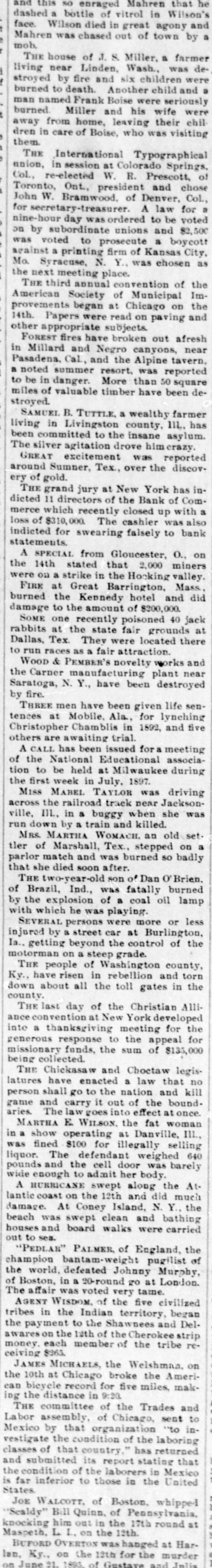 he this so enraged Mahren in Wilson's that bottle of vitrol and dashed Wilson a died in great agony by Mahren face. was chased out of town mob. house of J. S. Miller. a was farmer deTHE near Linden. Wash.. children were living fire and six and stroyed by death. Another child burned named to Frank Boise were wife seriously were man Miller and his chil burned from home, leaving their visiting dren away in care of Boise, who was them. International Typographical Springs, THE in session at Colorado of union, re-elected W. R. Prescott, chose Toronto, Col., Ont., president and Col., W. Bramwood. of Denver. law for a John secretary-treasurer. A to be voted for nine-hour day was ordered and $2,500 subordinate unions boycott on by voted to prosecute a City. was printing firm of Kansas ehosen as against Mo. Syracuse, a N. Y. was next meeting place. the the third annual convention of ImTHE Society of Municipal the American began at Chicago on and provements Papers were read on paving other 14th. appropriate subjects out FOREST fires have broken afresh near Millard and Negro canyons, tavern. in Cal., and the Alpine reported Pasadena. summer resort. was 50 square a noted danger. More than demiles to be in of valuable timber have been stroyed. B. TUTTLE, a wealthy III. farmer has SAMUEL in Livingston county, asylum. living committed to the insane himerazy. The been silver agitation drove reported excitement was discovof gold. around GREAT Summer, Tex., over the ery jury at New York has Com. inTHE grand directors of the Bank of with a dieted which 11 recently closed up was also merce $310.00 The cashier bank loss indicted of for swearing falsely to statements. SPECIAL from Gloucester, miners O., on A 14th stated that 2,000 valley. the a strike in the Hocking Mass. were on at Great Barrington. and did FIRE the Kennedy hotel burned to the amount of $200,000 40 damage recently poisoned jack SOME at one the state fair grounds there at Dallas, rabbits Tex. They were located races as a fair attraction. and to run & PEMBER'S novelty works near WOOD manufacturing plant destroyed by Saratoga, the Carner N.Y., have been fire. men have been given life senTHREE at Mobile, Ala. for lynching and five awaiting Christopher tences Chamblis trial. in 1892, others are has been issued for a meeting associaA CALL Educational of the National be held at Milwaukee during tion first to week in July. 1897. driving the MABEL TAYLOR was Miss railroad track near Jackson- she was across III. the in a buggy when killed. ville, by a train and run down MARTHA WOMACH. an old on set. MRS Marshall, Tex., stepped badly parlor tler of match and was burned so that she died soon after. Dan O'Brien. THE two-year-old son of burned Brazil, Ind., was fatally oil lamp of the explosion of a coal or with by which he was playing. less SEVERAL persons were more Burlington, by a street car at of the injured getting beyond the control motorman Ia.. on a steep grade. of Washington county, THE people in rebellion and torn the down Ky., have about risen all the toll gates in county. last day of the Christian AlliTHE convention at New York developed for the ance a thanksgiving meeting appeal for into response to the $135,000 missionary generous funds, the sum of being collected. Chickasaw and Choctaw that legis- no latures THE have enacted a law and kill person shall go to it the out nation of the boundgame and The carry law goes into effect at woman once. aries. MARTHA E WILSON. the Danville, fat III., fined in a show operating $100 for illegally at selling 640 weighed was liquor. The the defendant cell door was barely pounds enough and to admit her body. Atwide HURRICANE swept along the much A coast on the 12th and did the lantic At Coney Island, N.Y., bathing damage. swept clean and carried out to sea. beach houses was and board walks were PALMER, of England, the of "PEDLAR" bantam-weight pugilist champion world, defeated Johnny Murphy, London. of the Boston, in a 20-round voted very go tame. at The affair WISDOM was of the five civilized began AGENT in the Indian territory, Deltribes to the Shawnees and money. the payment on the 12th of the Cherokee strip tribe reawares each member of the $365. ceiving MICHAELS, the Welshman. Ameri- on JAMES at Chicago broke the makthe 10th bicycle record for five miles, can ing the committee distance in of 9:20 the Trades and to THE assembly, of Chicago, sent "to inMexico Labor by that organization laboring the condition of the returned vestigate of that country, has that classes submitted its report statiog Mexico and of the laborers in United is the far condition inferior to those in the States WALCOTT. of Boston. whipped JOE Bill Quinn. of Pennsylvania. round at knocking "Sealdy" him out in the 17th L L. on the 12th Maspeth. OVERTON was hanged murder at Haron BUFORD on the 12th for the Inlis lan. June Ks., 21 1895, of Gustare and