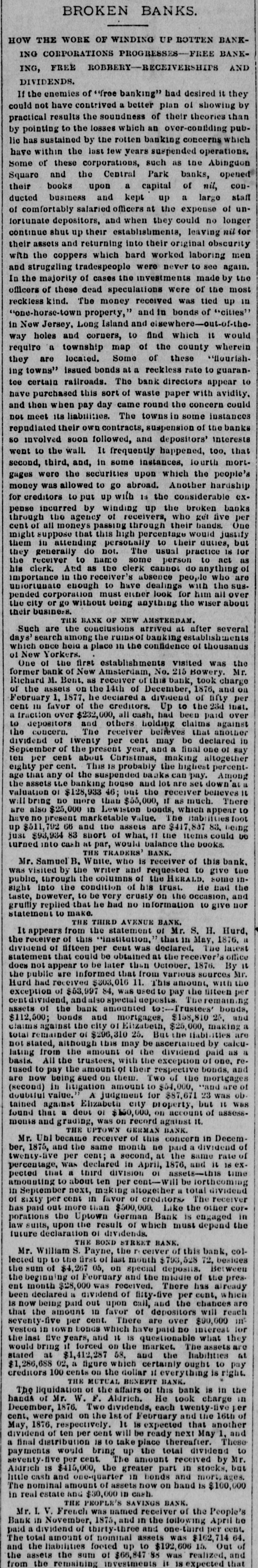 BROKEN BANKS. UP OF THE WORK HOW BANKROTTEN WINDING ING BANKPROGRESSESCORPORATIONS AND FREE ING, it desired they DIVIDENDS. of "free banking" plan had ol showing If the contrived a better theories could not results the soundness an over-contiding practical enemies have which of their which than pub- by by pointing sustained to the by losses the rotten banking suspended concerns operations. Central conlic have has within of these the corporations, last few years such Park as banks, the Abingdon opened some Square and the a capital of large nil, staff books upon kept up a of depositors, ducted their business and officers at the expense longer uncomfortably salaried when they could no nil shut up into their and worked coppers were continue their of fortunate assets returning their which and establishments, hard never original laboring leaving to see obscurity again. men for with struggling the tradespeople investments made by the and of cases the were of the most of these dead received was kind. The money and in bonds of officers reckless In the majority speculations tied out-of-the- "cities' up in property, and eigewhere would "one-horse-town Long Island find which it in New Jersey. and corners, to county wherein way holes a township map of of the these "Hourishthey issued bonds bank directors require ing towns" are railroads. located. Some The at a reckless rate with to appear avidity. guaran- to toe certain this sort of waste paper the concern could have then purchased when pay day came towns round in some instances banks and repudiated not meet its their liabilities. own contracts, The and suspension depositors' of the interests that the wall. instances, so involved goon followed, It frequently happened, fourth too. mortwent to third, and, in some upon which the people's second, the securities Another hardship exgages money were was allowed to put to up go with abroad. 13 the considerable broken banks for creditors by winding receivers, up the who get hands. five One per pense through incurred all the moneys agency passi ot high through percentage their would duties, justity but cent of that this ersonally to their 18 for might them they generally in suppose that attending do name not. some The CADDOL usual person practice do anything to act as of the receiver And to as the clerk absence people who the sus- are his clerk. in the receiver's to have dealings for with him all over importance uniontunate enough must either look the wiser about pended corporation or go without being anything their the city busine:8. THE BANK OF NEW arrived AMSTERDAM. at after several establishment a held once was the day Such s' search are among the conclusions place the ruins in the of confidence banking of thousands visited which 01 New Yorkers. first establishments No. 215 Howery Mr. former Richard One of bank M. the Bent. of on New as the Amsterdam, receiver 14th of December, divided this bank, 1876, of took fifty charge and lost. per on February of the assets 1. 1877, he the declared creditors. a Up to been the paid 23d over cent traction in favor over of $232, 000, others all cash, holding had claims that another against a to depositors and The receiver cent believe may be declared one of say in teu dividend the concern. of of twenty the present per year, and making final altogether September per cent about This 18 Caristmas, probably the can highest pay. percent- Among eighty that per any cent. of the suspended house and baaks lot are set beneves! down 16 age the assets u.e $128,933 banking 46; but $55,000, the it receiver as much. There 10 valuation bring o no more than ewiston bonds, which liabilities appear foot will also $25,000 in ketable value. The 83, being have are no present 66 and mar the assets 11 are the $417,837 items could DO up $ $511,792 $93,934 83 short of would what, balance the books. bank. just turned into cash THE at par, TRADERS BANK. receiver of this Samuel B. Waite. who and is requested to give some the inwas Mr. visited by the writer columns of the trust. HERALD. He had and the public, through the condition of his the occasion, sight taste, however, into replied the that to be he very had crusty no information on 10 give nor gruffly to make. THIRD AVENUE BANK. It appears from the institution. declared. that in The the of lifteen per obtained at the By statement dividend receiver of THE could this be statement cent was October. of Mr. S. May, 1876. H. 1876. Hurd, latest office Mr. it statement not appear that to be later that than from various sources with the does the public received are informed $303. 11. used This to pay amount, the filteen per Hard exception had of $63,997 84, special was deposits 'rustees' The bonds, and centdividend, and bank amounted to:- $158,810 25, $112,500; assets ot the boods and mortgages, Elizabeth, $25,000, liabilities making are a claims re mainder against the of city $296, ol 310 may 25. be But ascertained paid by calcu- as a the total not stated, although amount this of the exception dividend of one. reTwo lating basis. from All the the trustees, amount of with their the respective of the bonds. mortgages and doublit fused are now to pay being sued on amount thew. to $54,000, $87,671 23 and was are ob Ehzabeth on account (second) value. in litigation A judgment city for pl operty, but of assess- it was tained that against a deut of $150,000. on record against and grading, GERMAN BANK. of Ubl because receiver month ne paid same rate monts found Mr. and THE the UPTOWN same was second, of this at concern the it. dividend in it Decem- 18 exber, twenty-ave 1875, per declared cent; a in April, 1876, asset and time percentage, that was a third division cent- 01 will be dividend coming amounting pected in September to next, about in making ten favor per of altogether creditors/ Like a total the The other receiver cor- in of gixty per cent than $500,000 is engaged law suits, oi dividends. has porations paid out upon the more Uptown the result German of