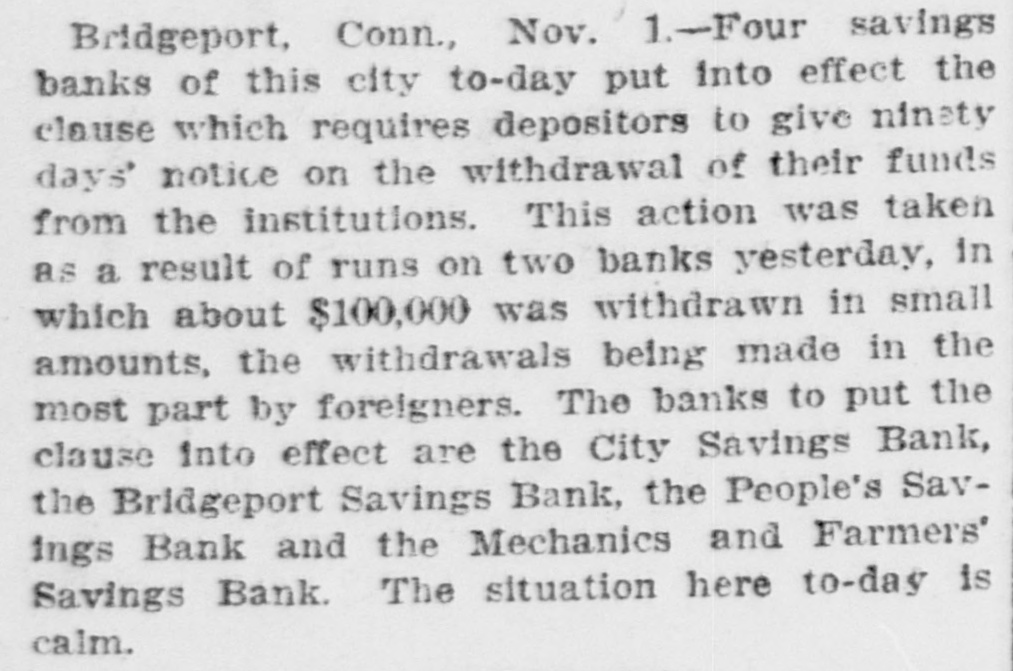 No direct run is reported on Bridgeport Savings Bank itself; it and three other local savings banks invoked the 90-day notice clause (partial suspension of immediate withdrawals) on Oct 31/Nov 1, 1907 in response to runs on two other local savings banks and the wider New York financial upheaval. The institution remained solvent and the situation was described as calm.