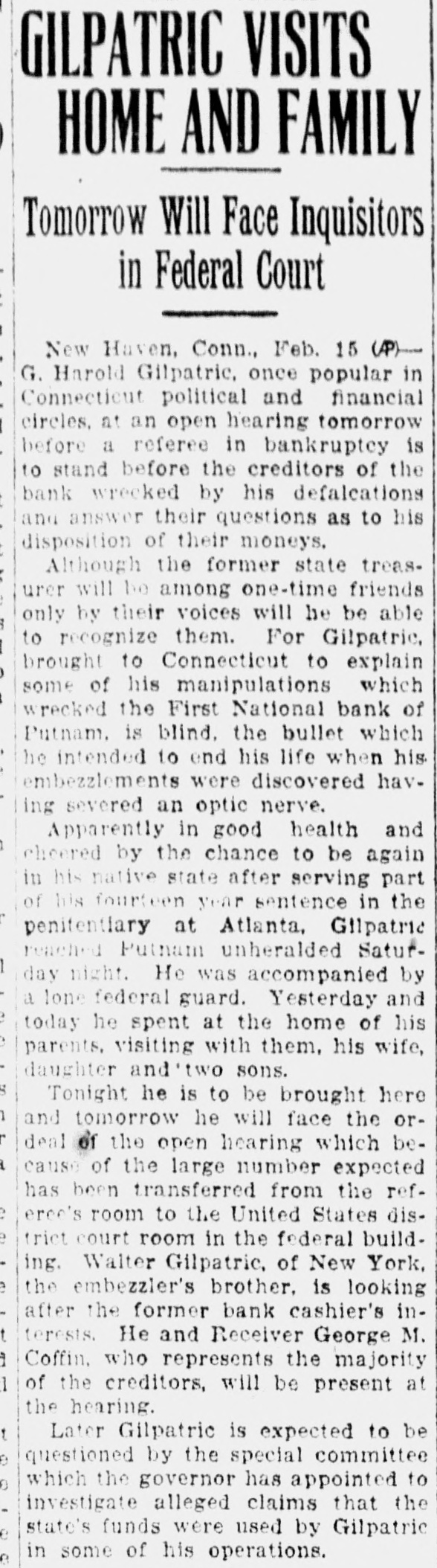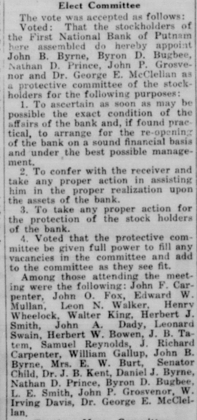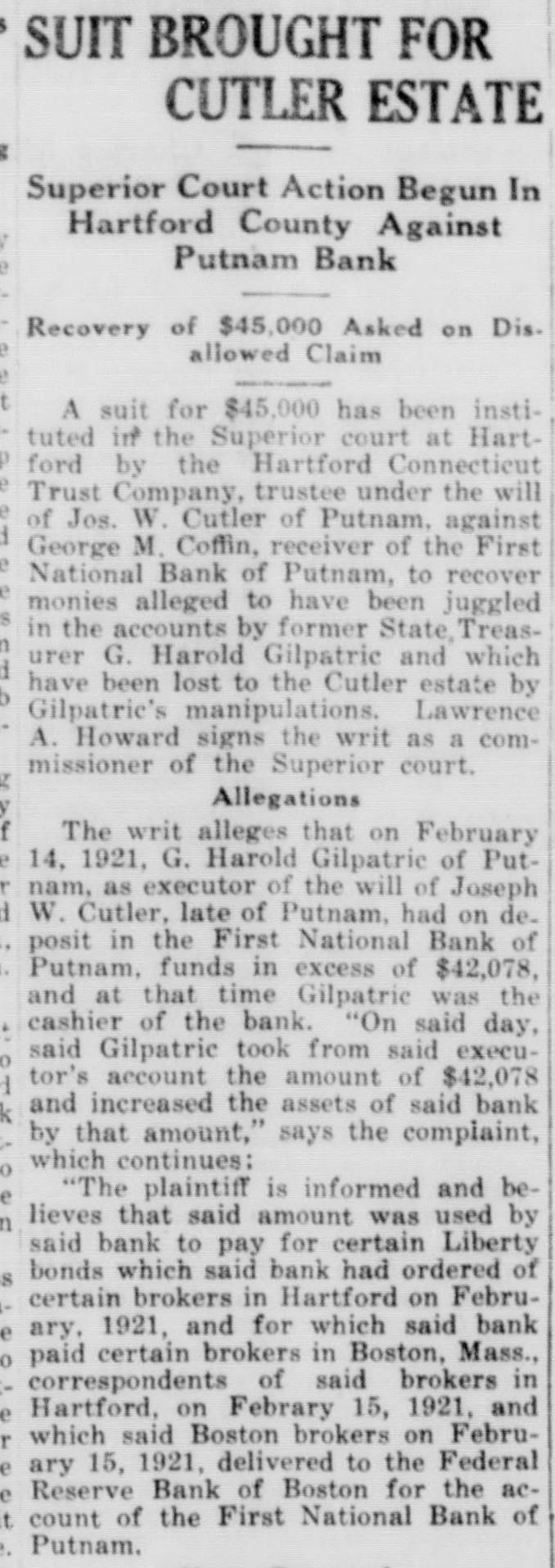 Comptroller Appoints Receiver for Bank. Shortage $262,000 (Continued from Page One) by the directors as $262,000, but this the bank's affairs and present condiamount is in excess of the loss. tion. He stated today that nothing had come to his attention that disDiscussed Donahue Affair closed the necessity of the state atWith respect to reports that there torney's office for Windham county to had been forgeries on mortgage deeds proceed against anyone connected given by Mr. Gilpatric to James Donwith the bank or any of its affairs. ahue, to the Cutler estate and to other Not Gilpatric's Signature interests in this city who had given him an aggregate of approximately It was learned from a reliable $200,000 to invest for them, Walter H source today that there has been disGilpatrie said that his brother assured covered among the papers of Mr. Gilhim specifically in the case of the Donpatric a note for $35,000, payable to ahue and Cutler instances that the G. Harold Gilpatric as trustee of the transactions were entirely regular. trust fund set up by the late Joseph My brother told me that he handCutler for his daughter, Miss Annie ed the mortgage for the Hartford Cutler. The note is not signed by Mr. property to Donahue for him to reGilpatric. Whose signature it is. cord," Mr. Gilpatric said. "If Donahowever, could not be learned. It is hue failed to record it we cannot help stated, however, that the note appears it. He (Donahue) has run to the to be worth its face value and therestate attorney for prosecution. We fore the trust fund is not in danger are sorry. We are concerned now in of losing anything by reason of the getting together all possible assets to note. The mortgage deed, said to have make up the losses. If these losses been given on Hartford property, canamount to anything like $262,000 I not be found. But this fact is also shall be greatly surprised. not conclusive of wrongdoing, as the Mr. Gilpatric indicated that by the deed may yet be found among the ef assignment to the bank he felt that no fects of Mr. Gilpatric yet to be found. wrong was being done to individuals Refuse to Make Statement who had entrusted funds to the state From the moment that the bank treasurer for safe keeping, because opened its doors as usual on Friday he believed his brother's accounts in morning, until the institution was this connection would be found corclosed for good by vote of directors rect Tuesday morning, directors and offi. A "certain element" was charged by cials have persistently refused to Mr. Gilpatric with disturbing condimake any sort of a public statement tions in recent days to the point where showing the status of the bank. They an effort to effect a settlement with were pleaded with by depositors and the bank that would maintain its solothers who had a right to know how vency had been obstrueted. the institution stood. But all that "They are trying to make my brothwas fortheoming was the reiterated er a goat for a great many things that statement that "The bank is solvent never took place, he said in discusand capable of meeting all its obligasing reports of mortgage and trust tions. fund irregularities. There was a decided run on the Prepared For Courts bank during Saturday morning, savWhen this thing is finished up I ings accounts being particularly af think that Putnam will find that all a fected by the continued absence of losses have been made good It will definite statement of facts concerning be true if they let us get things tothe bank gether. If they put Harold in bankIn the meantime directors of the bank held frequent meetings, but ruptcy no one knows what will happen. what they discussed and what they He has to face the courts on this. decided to do. was not made public. We are prepared for this. We are Decided "Run" Starts to let the its not so The bank opened at the usual hour the as we are on Monday morning A crowd gathcourse. much prepared with We are past concerned law take in makered within a few minutes and a line ing up for the consequences of the of about fifteen people assembled bepast. fore the savings department. People Events Develop Rapidly were withdrawing their money. Some Developments came thick and fast took away sizeable piles of bills. OthTuesday afternoon. one of them beers did not have as much on deposit, ing the announcement by Walter Gilbut they were withdrawing all that patric that his brother had assigned they had. It was a serious-faced his personal property to the bank to group of people, not excited or uncover any losses he may have caused strung, but taking a natural precauthat institution. The statement was tion in the face of the uncommunicaas follows: tive statement that the bank was sol"G. Harold Gilpatric has today exevent. Business in the commercial cuted and delivered to the First Na(checking) department was stated to tional Bank, an assignment of all his have been normal during the day, property to meet any loss sustained with deposits and withdrawals about as usual for a Monday's business. It by reason of his acts. From an est:mate of his assets, it is believed that was reported that one of the bank's heaviest depositors made a 100 per they will go a considerable way in offsetting such loses.' cent withdrawal during the day. The Mr. Gilpatric indicated that by the run on the savings department continued throughout the day, and is reassignment to the bank he felt that no wrong was being done to indiported to have totalled approximately viduals who had entrusted funds to $75,000. the man for safe keeping, because he In Session Eight Hours believed his brother's accounts in this The directors held a meeting in connection would be found correct. the forenoon, lasting two hours. In Trying to Raise Money the afternoon they met again, adIt is known that Mr. Gilpatrie's journing around o'clock and re-conbrothers have been working day and vening at about 8 o'clock. They remained in session until shortly after night for a week now, in an end