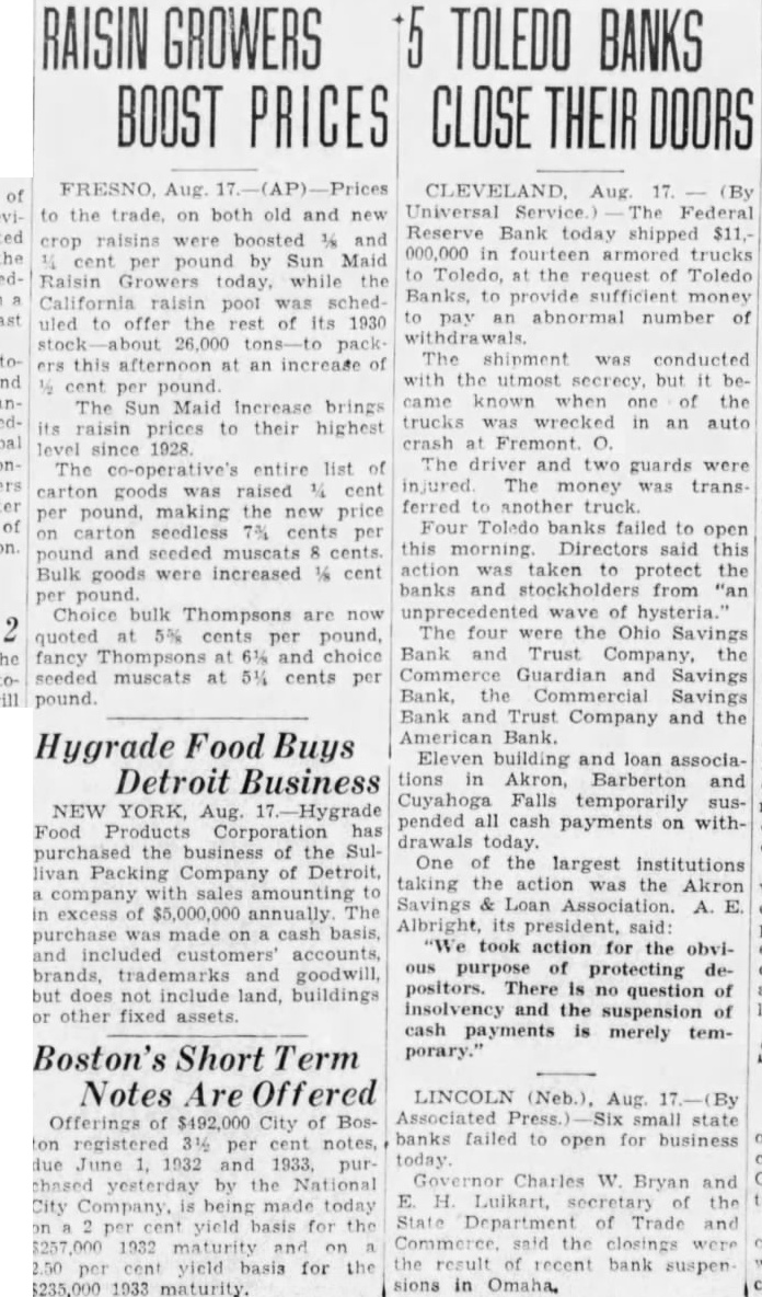 Silver Bar silver continued un changed at the close of the week holding at 27% an ounce New York and 12% pence in London Washington, August 15the Farm Board finally will adopt to the Southern cot farmer his low dilemma tonight the close interest of toel-Operations of steel mills in Washington the Youngstown district next week Hope been virtually abandoned will average per cent of rated for its proposal that third of the an increase of one per cent current crop be destroyed and over the past week, Dow, Jones & ization supplies held off the market Co. estimates. for year At least five actual rejections been received the Governors TOLEDO BANKS CLOSED. who were asked to join in the program. Three Savings Institutions Turned There apparently is no immediate Over To State Department. prospect of action although many to that Toledo, Ohio, August end have out. The disposit Directors of the Ohio Savings Bank seems be to leave the actual for & Trust Co., the Guard plan squarely up to the board to be Trust & Savings Bank and the worked out the counter Commercial Savings Bank & Trust proposals put forward by Governors. Co., at special meetings tonight. de- Senators and cided to close the three board members continued banks and turn their assets their efforts to reach an agreement the State Superintendent of Banks with the directors the American This action means that the three Cotton Cooperative Association on down-town banks and their 34 the amount advances to be branches throughout the ed in handling this city not be opened Monday year's The bumper morning pective crop 15,584,000 In the of said the this action for protection of all de- tions have been in process for during an unparalleled several days. TRY OUT GROUP MARKETING Salem, Ohio, August Orchardists Mahoning and Columbiana Counties today began their first in group marketing. They completed deal whereby large of the apple and peach will be sold an agency 700 and 800 cars of fruit will be shipped with East Palestine New Coford and Canfield