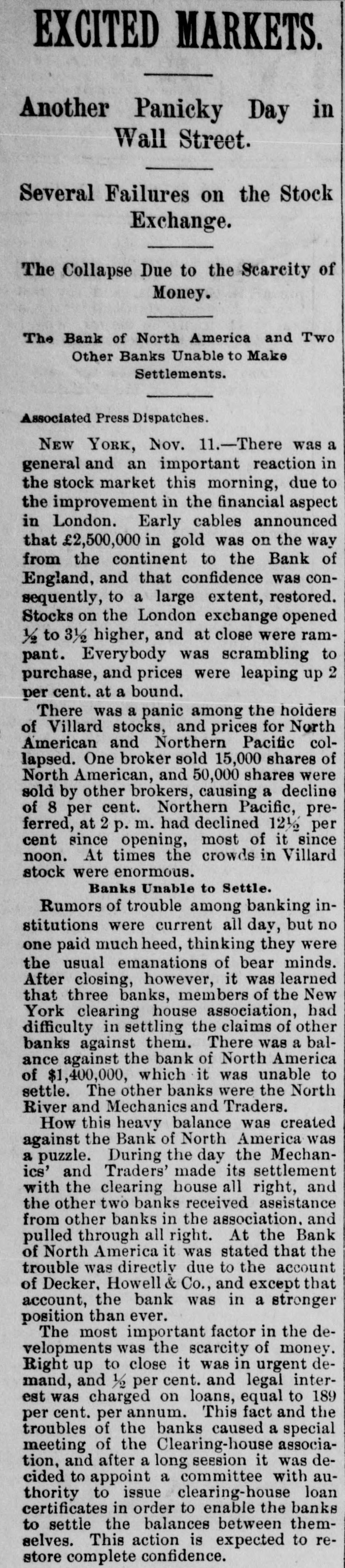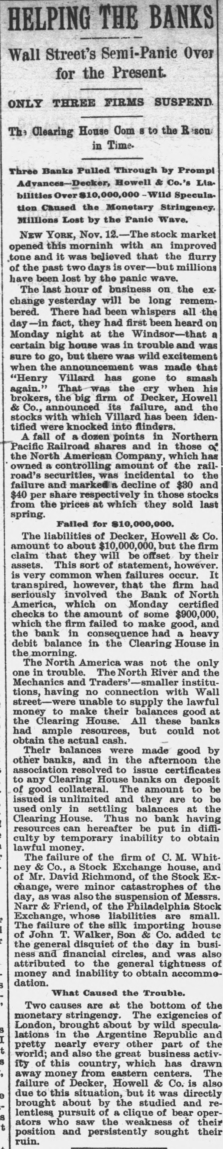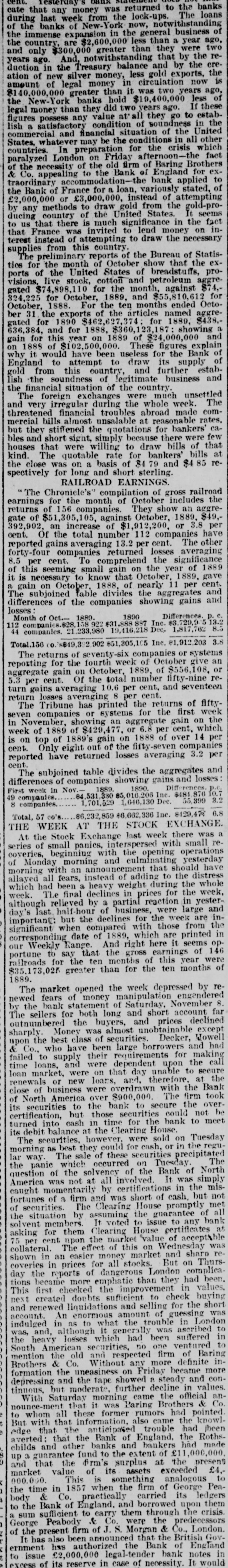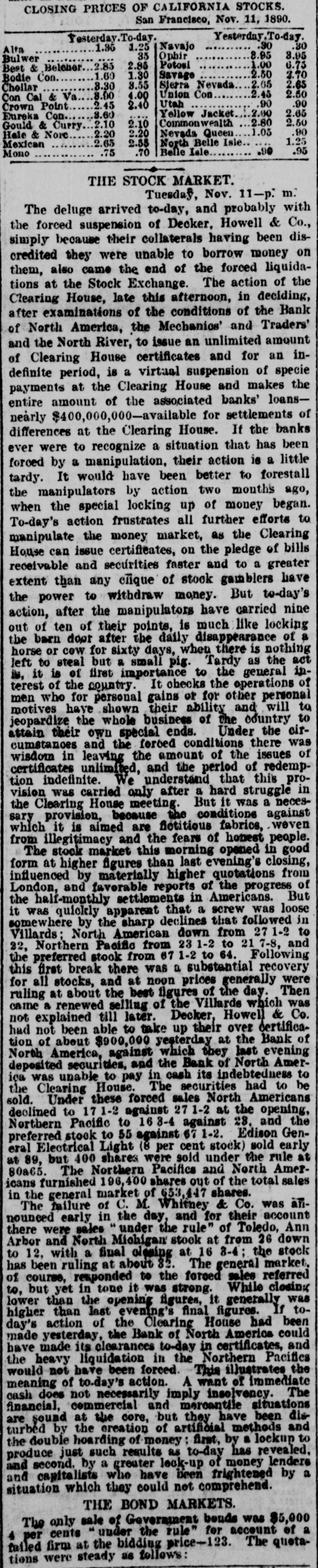 CLOSING PRICES OF CALIFORNIA STOCKS. San Francisco, Nov. 11, 1890. Yesterday To-day. Yesterday To-day. .30 .30 Navajo 1.25 1.35 Alta 8.95 3.95 35 Ophir Bulwer 1.00 6.75 Potosi 2.85 2.85 Best & Belcher 2.50 2.70 1.30 Savage 1.60 Bodie Con. 2.65 2.65 3.55 Sjerra Nevada 3.30 Chollar 2.45 2.50 Union Con 4.00 8.90 Con Cal & Va .90 90 Utah 2.45 2.40 Crown Point 2.65 2.00 Yellow Jacket 3.60 Eureka Con 2.80 2.50 2.10 Common wealth 2.10 Gould & Curry .90 1.05 2.20 2.20 Nevada Queen Hale & None 1.25 2.65 2.55 North Belle Isle Mexican .95 .90 Belle Isle .70 .75 Mono THE STOCK MARKET. Tuesday, Nov. 11-p. m. The deluge arrived to-day, and probably with the forced suspension of Decker, Howell & Co., simply because their collaterals having been discredited they were unable to borrow money on them, also came the end of the forced liquidations at the Stock Exchange. The action of the Clearing House, late this afternoon, in deciding, after examinations of the conditions of the Bank of North America, the Mechanics' and Traders' and the North River, to issue an unlimited amount of Clearing House certificates and for an indefinite period, is a virtual suspension of specie payments at the Clearing House and makes the entire amount of the associated banks' loans— nearly $400,000,000-available for settlements of differences at the Clearing House. If the banks ever were to recognize a situation that has been forced by a manipulation, their action is a little tardy. It would have been better to forestall the manipulators by action two months ago, when the special locking up of money began. To-day's action frustrates all further efforts to manipulate the money market, as the Clearing House can issue certificates, on the pledge of bills receivable and securities faster and to a greater extent than any clique of stock gamblers have the power to withdraw money. But to-day's action, after the manipulators have carried nine out of ten of their points, is much like locking the barn door after the daily disappearance of a horse or cow for sixty days, when there is nothing left to steal but a small pig. Tardy as the act is, it is of first importance to the general interest of the country. It checks the operations of men who for personal gains or for other personal motives have shown their ability and will to jeopardize the whole business of the country to attain their own special ends. Under the circumstances and the foroed conditions there was wisdom in leaving the amount of the issues of certificates unlimited, and the period of redemption indefinite. We understand that this provision was carried only after a hard struggle in the Clearing House meeting. But it was a necessary provision, because the conditions against which it is aimed are fletitious fabrics, woven from illegitimacy and the fears of honest people. The stock market this morning opened in good form at higher figures than last evening's closing, influenced by materially higher quotations from London, and favorable reports of the progress of the half-monthly settlements in Americans. But it was quickly apparent that a screw was loose somewhere by the sharp declines that followed in Villards; North American down from 27 1-2 to 22, Northern Pacific from 23 1-2 to 21 7-8, and the preferred stock from 67 1-2 to 64. Following this first break there was a substantial recovery for all stocks, and at noon prices generally were ruling at about the best figures of the day. Then came a renewed selling of the Villards which was not explained till later. Decker, Howell & Co. had not been able to take up their over certification of about $900,000 yesterday at the Bank of North America, against which they last evening deposited securities, and the Bank of North Ameriça was unable to pay in cash its indebtedness to the Clearing House. The securities had to be sold. Under these forced sales North Americans declined to 17 1-2 against 27 1-2 at the opening, Northern Pacific to 163-4 against 28, and the preferred stock to 55 against B7 1-2. Edison General Electrical Light (8 per cent stock) sold early at 89, but 400 shares were sold under the rule at 80a65. The Northern Pacifics and North Americans furnished 196,400 shares out of the total sales in the general market of 653,447 shares. The failure of C. M. Whitney & Co. was announced early in the day, and for their account there were sales under the rule" of Toledo, Ann Arbor and North Michigan stock at from 26 down to 12, with a final closing at 16 3-4; the stock has been ruling at about 32. The general market. of course, responded to the forced sales referred to, but yet in tone it was strong. While closing lower than the opening figures, it generally was higher than last evening's final figures. If today's action of the Clearing House had been made yesterday, the Bank of North America could have made its clearances to-day in certificates, and the heavy liquidation in the Northern Pacifies would not have been forced. This illustrates the meaning of to-day's action. A want of immediate cash does not necessarily imply insolvency. The financial, commercial and mercantile situations are sound at the core, but they have been disturbéd by the creation of artificial methods and the double hoarding of money first, by a lockup to produce just such results as to-day has revealed, and second, by a greater leck-up of money lenders and capitalists who have been frightened by a situation which they could not comprehend. THE BOND MARKETS. The only sale of Government bonds was $5,000 for