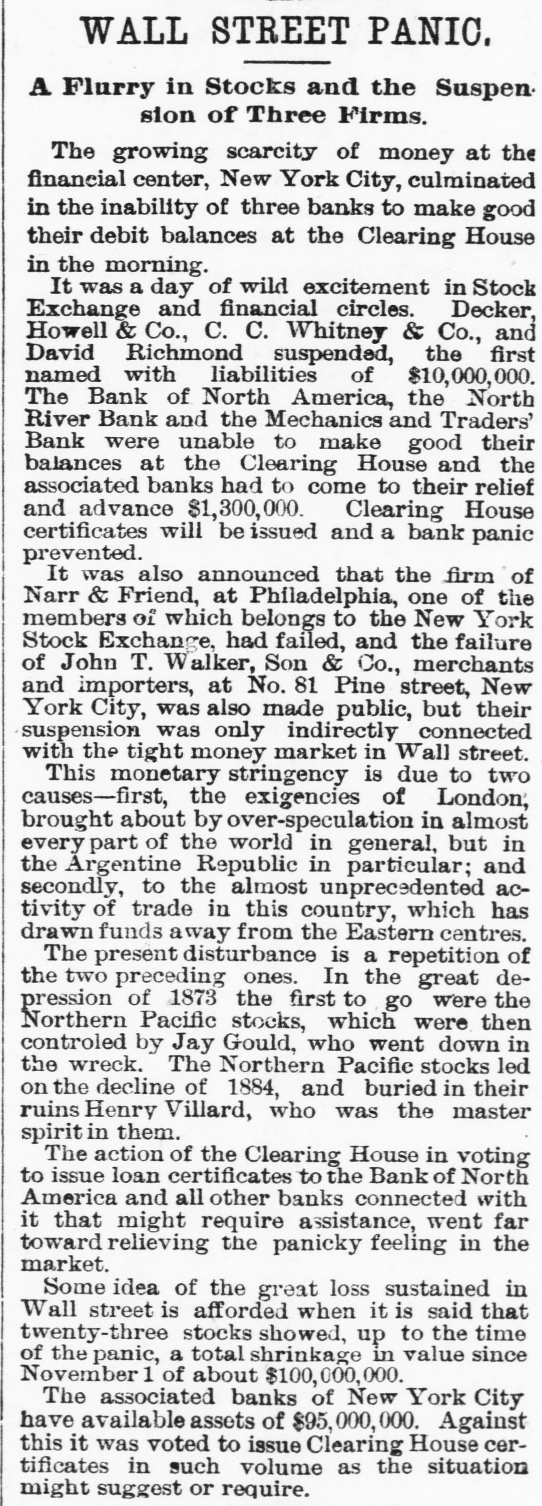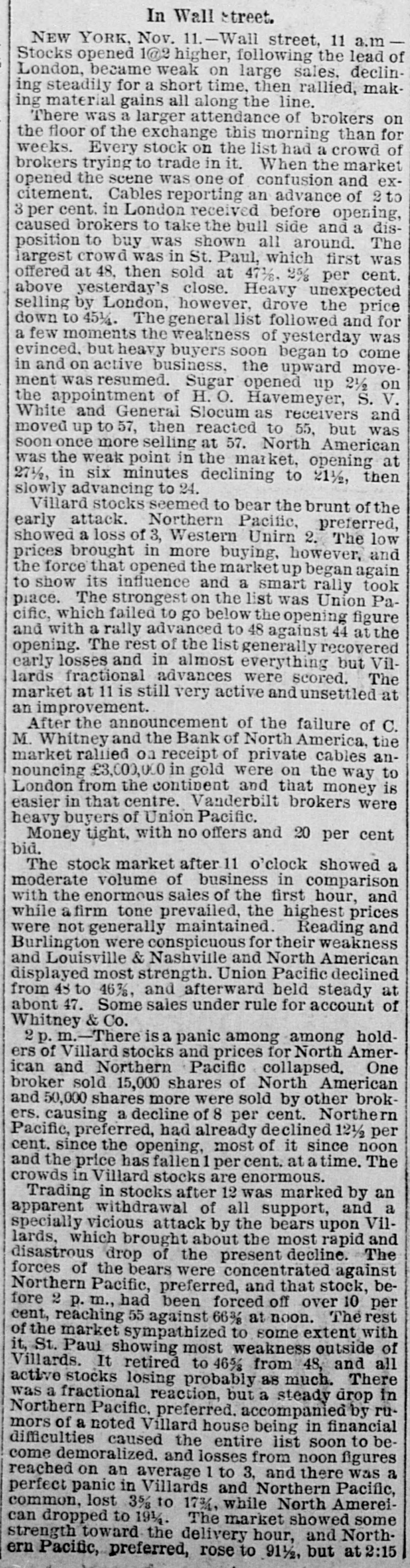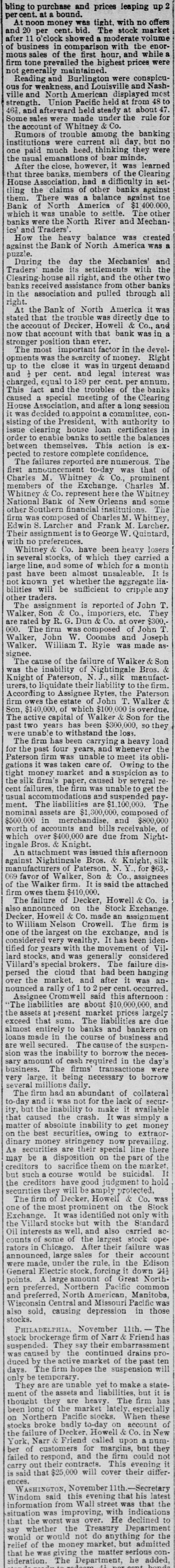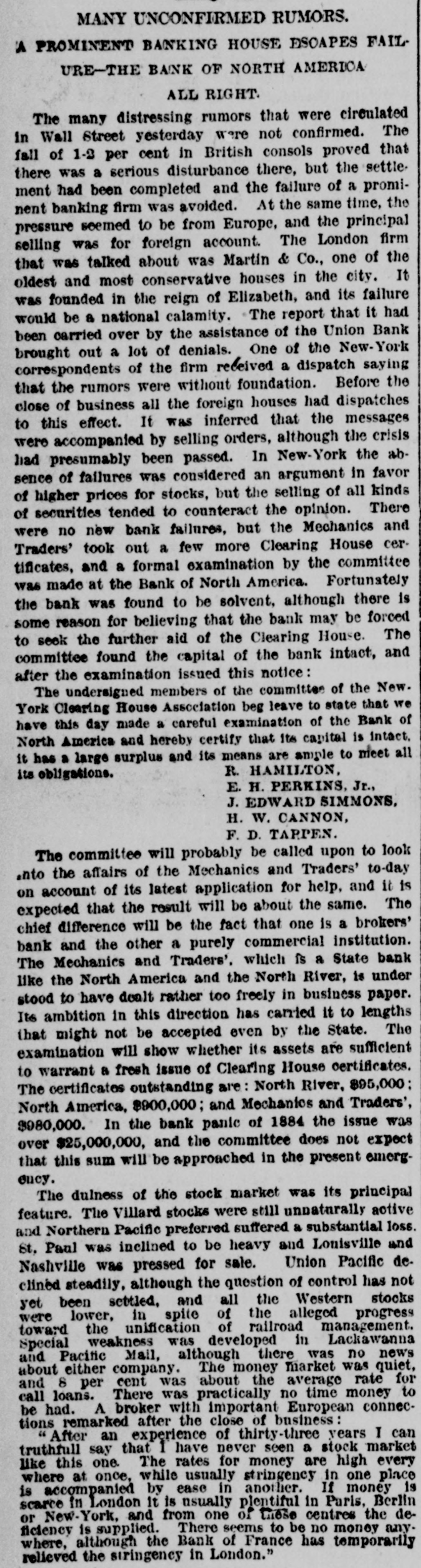 CLOSING PRICES OF CALIFORNIA STOCKS. San Francisco, Nov. 11, 1890. Yesterday To-day. Yesterday To-day. .30 .30 Navajo 1.25 1.35 Alta 8.95 3.95 35 Ophir Bulwer 1.00 6.75 Potosi 2.85 2.85 Best & Belcher 2.50 2.70 1.30 Savage 1.60 Bodie Con. 2.65 2.65 3.55 Sjerra Nevada 3.30 Chollar 2.45 2.50 Union Con 4.00 8.90 Con Cal & Va .90 90 Utah 2.45 2.40 Crown Point 2.65 2.00 Yellow Jacket 3.60 Eureka Con 2.80 2.50 2.10 Common wealth 2.10 Gould & Curry .90 1.05 2.20 2.20 Nevada Queen Hale & None 1.25 2.65 2.55 North Belle Isle Mexican .95 .90 Belle Isle .70 .75 Mono THE STOCK MARKET. Tuesday, Nov. 11-p. m. The deluge arrived to-day, and probably with the forced suspension of Decker, Howell & Co., simply because their collaterals having been discredited they were unable to borrow money on them, also came the end of the forced liquidations at the Stock Exchange. The action of the Clearing House, late this afternoon, in deciding, after examinations of the conditions of the Bank of North America, the Mechanics' and Traders' and the North River, to issue an unlimited amount of Clearing House certificates and for an indefinite period, is a virtual suspension of specie payments at the Clearing House and makes the entire amount of the associated banks' loans— nearly $400,000,000-available for settlements of differences at the Clearing House. If the banks ever were to recognize a situation that has been forced by a manipulation, their action is a little tardy. It would have been better to forestall the manipulators by action two months ago, when the special locking up of money began. To-day's action frustrates all further efforts to manipulate the money market, as the Clearing House can issue certificates, on the pledge of bills receivable and securities faster and to a greater extent than any clique of stock gamblers have the power to withdraw money. But to-day's action, after the manipulators have carried nine out of ten of their points, is much like locking the barn door after the daily disappearance of a horse or cow for sixty days, when there is nothing left to steal but a small pig. Tardy as the act is, it is of first importance to the general interest of the country. It checks the operations of men who for personal gains or for other personal motives have shown their ability and will to jeopardize the whole business of the country to attain their own special ends. Under the circumstances and the foroed conditions there was wisdom in leaving the amount of the issues of certificates unlimited, and the period of redemption indefinite. We understand that this provision was carried only after a hard struggle in the Clearing House meeting. But it was a necessary provision, because the conditions against which it is aimed are fletitious fabrics, woven from illegitimacy and the fears of honest people. The stock market this morning opened in good form at higher figures than last evening's closing, influenced by materially higher quotations from London, and favorable reports of the progress of the half-monthly settlements in Americans. But it was quickly apparent that a screw was loose somewhere by the sharp declines that followed in Villards; North American down from 27 1-2 to 22, Northern Pacific from 23 1-2 to 21 7-8, and the preferred stock from 67 1-2 to 64. Following this first break there was a substantial recovery for all stocks, and at noon prices generally were ruling at about the best figures of the day. Then came a renewed selling of the Villards which was not explained till later. Decker, Howell & Co. had not been able to take up their over certification of about $900,000 yesterday at the Bank of North America, against which they last evening deposited securities, and the Bank of North Ameriça was unable to pay in cash its indebtedness to the Clearing House. The securities had to be sold. Under these forced sales North Americans declined to 17 1-2 against 27 1-2 at the opening, Northern Pacific to 163-4 against 28, and the preferred stock to 55 against B7 1-2. Edison General Electrical Light (8 per cent stock) sold early at 89, but 400 shares were sold under the rule at 80a65. The Northern Pacifics and North Americans furnished 196,400 shares out of the total sales in the general market of 653,447 shares. The failure of C. M. Whitney & Co. was announced early in the day, and for their account there were sales under the rule" of Toledo, Ann Arbor and North Michigan stock at from 26 down to 12, with a final closing at 16 3-4; the stock has been ruling at about 32. The general market. of course, responded to the forced sales referred to, but yet in tone it was strong. While closing lower than the opening figures, it generally was higher than last evening's final figures. If today's action of the Clearing House had been made yesterday, the Bank of North America could have made its clearances to-day in certificates, and the heavy liquidation in the Northern Pacifies would not have been forced. This illustrates the meaning of to-day's action. A want of immediate cash does not necessarily imply insolvency. The financial, commercial and mercantile situations are sound at the core, but they have been disturbéd by the creation of artificial methods and the double hoarding of money first, by a lockup to produce just such results as to-day has revealed, and second, by a greater leck-up of money lenders and capitalists who have been frightened by a situation which they could not comprehend. THE BOND MARKETS. The only sale of Government bonds was $5,000 for