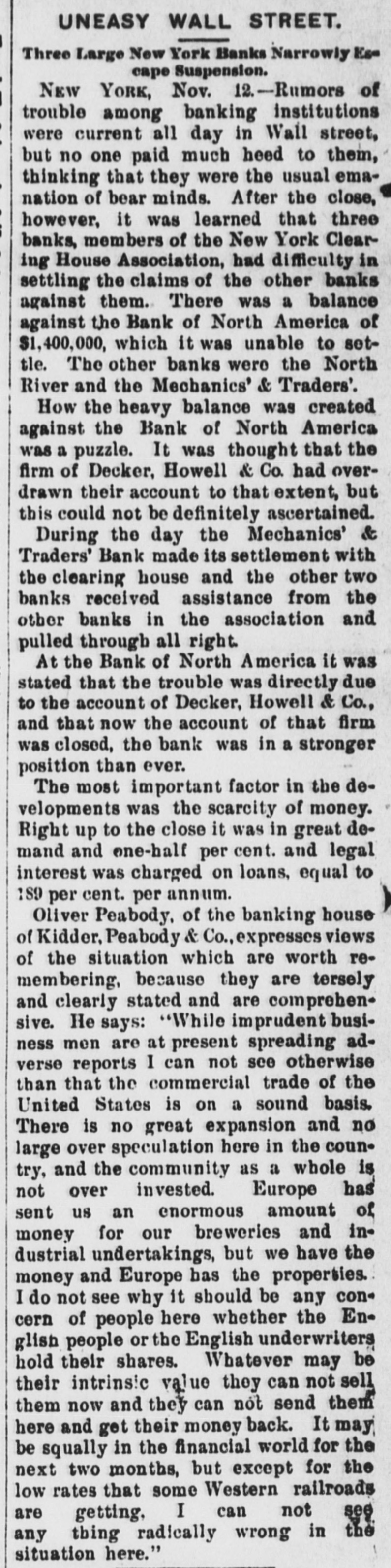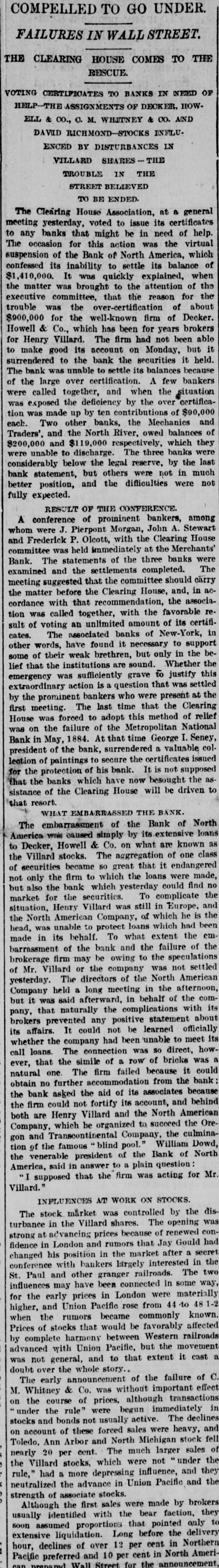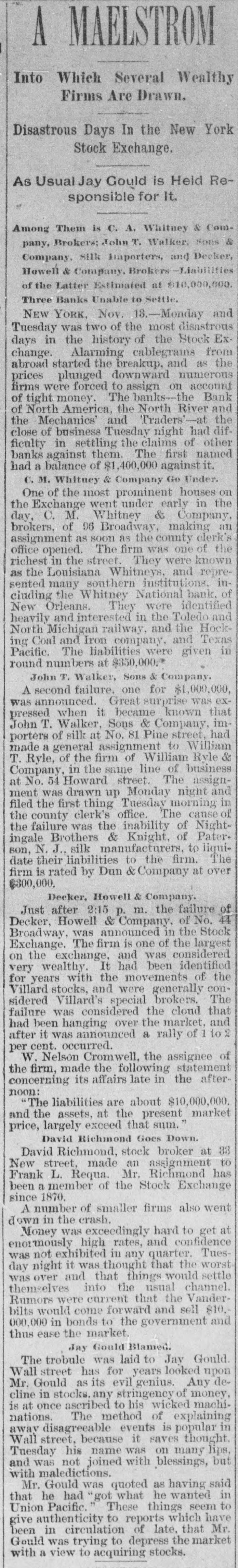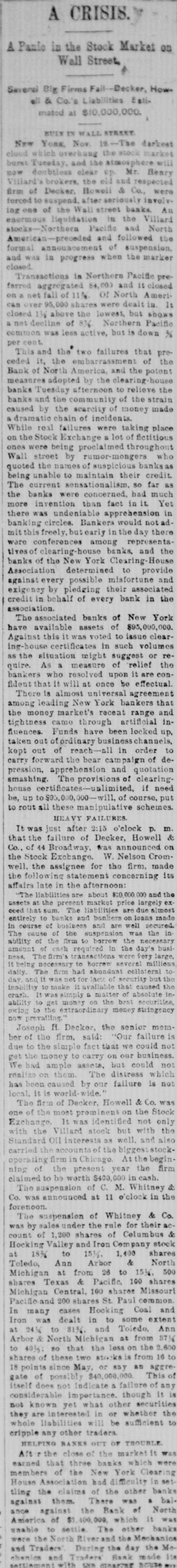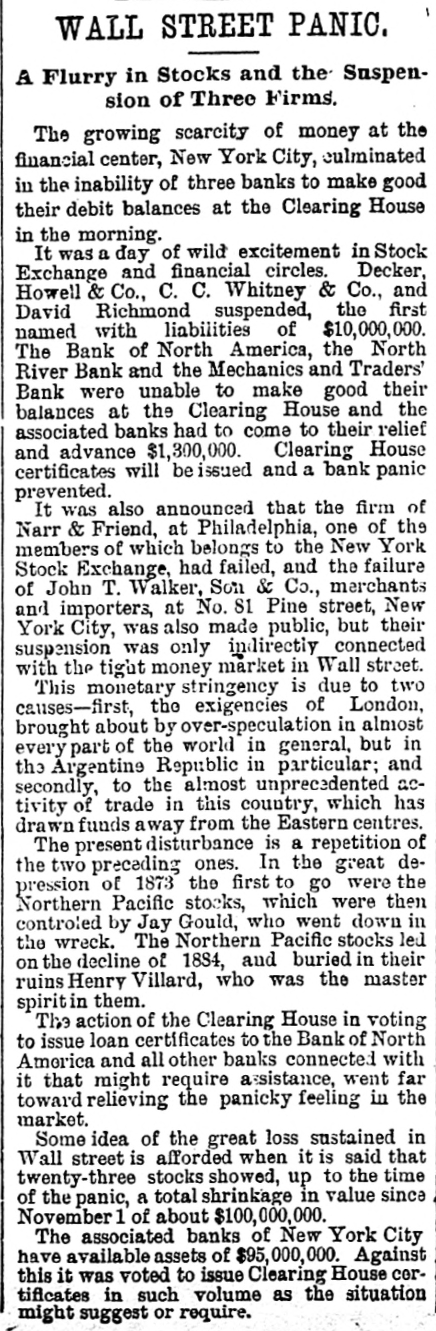 CLOSING PRICES OF CALIFORNIA STOCKS. San Francisco, Nov. 11, 1890. Yesterday To-day. Yesterday To-day. .30 .30 Navajo 1.25 1.35 Alta 8.95 3.95 35 Ophir Bulwer 1.00 6.75 Potosi 2.85 2.85 Best & Belcher 2.50 2.70 1.30 Savage 1.60 Bodie Con. 2.65 2.65 3.55 Sjerra Nevada 3.30 Chollar 2.45 2.50 Union Con 4.00 8.90 Con Cal & Va .90 90 Utah 2.45 2.40 Crown Point 2.65 2.00 Yellow Jacket 3.60 Eureka Con 2.80 2.50 2.10 Common wealth 2.10 Gould & Curry .90 1.05 2.20 2.20 Nevada Queen Hale & None 1.25 2.65 2.55 North Belle Isle Mexican .95 .90 Belle Isle .70 .75 Mono THE STOCK MARKET. Tuesday, Nov. 11-p. m. The deluge arrived to-day, and probably with the forced suspension of Decker, Howell & Co., simply because their collaterals having been discredited they were unable to borrow money on them, also came the end of the forced liquidations at the Stock Exchange. The action of the Clearing House, late this afternoon, in deciding, after examinations of the conditions of the Bank of North America, the Mechanics' and Traders' and the North River, to issue an unlimited amount of Clearing House certificates and for an indefinite period, is a virtual suspension of specie payments at the Clearing House and makes the entire amount of the associated banks' loans— nearly $400,000,000-available for settlements of differences at the Clearing House. If the banks ever were to recognize a situation that has been forced by a manipulation, their action is a little tardy. It would have been better to forestall the manipulators by action two months ago, when the special locking up of money began. To-day's action frustrates all further efforts to manipulate the money market, as the Clearing House can issue certificates, on the pledge of bills receivable and securities faster and to a greater extent than any clique of stock gamblers have the power to withdraw money. But to-day's action, after the manipulators have carried nine out of ten of their points, is much like locking the barn door after the daily disappearance of a horse or cow for sixty days, when there is nothing left to steal but a small pig. Tardy as the act is, it is of first importance to the general interest of the country. It checks the operations of men who for personal gains or for other personal motives have shown their ability and will to jeopardize the whole business of the country to attain their own special ends. Under the circumstances and the foroed conditions there was wisdom in leaving the amount of the issues of certificates unlimited, and the period of redemption indefinite. We understand that this provision was carried only after a hard struggle in the Clearing House meeting. But it was a necessary provision, because the conditions against which it is aimed are fletitious fabrics, woven from illegitimacy and the fears of honest people. The stock market this morning opened in good form at higher figures than last evening's closing, influenced by materially higher quotations from London, and favorable reports of the progress of the half-monthly settlements in Americans. But it was quickly apparent that a screw was loose somewhere by the sharp declines that followed in Villards; North American down from 27 1-2 to 22, Northern Pacific from 23 1-2 to 21 7-8, and the preferred stock from 67 1-2 to 64. Following this first break there was a substantial recovery for all stocks, and at noon prices generally were ruling at about the best figures of the day. Then came a renewed selling of the Villards which was not explained till later. Decker, Howell & Co. had not been able to take up their over certification of about $900,000 yesterday at the Bank of North America, against which they last evening deposited securities, and the Bank of North Ameriça was unable to pay in cash its indebtedness to the Clearing House. The securities had to be sold. Under these forced sales North Americans declined to 17 1-2 against 27 1-2 at the opening, Northern Pacific to 163-4 against 28, and the preferred stock to 55 against B7 1-2. Edison General Electrical Light (8 per cent stock) sold early at 89, but 400 shares were sold under the rule at 80a65. The Northern Pacifics and North Americans furnished 196,400 shares out of the total sales in the general market of 653,447 shares. The failure of C. M. Whitney & Co. was announced early in the day, and for their account there were sales under the rule" of Toledo, Ann Arbor and North Michigan stock at from 26 down to 12, with a final closing at 16 3-4; the stock has been ruling at about 32. The general market. of course, responded to the forced sales referred to, but yet in tone it was strong. While closing lower than the opening figures, it generally was higher than last evening's final figures. If today's action of the Clearing House had been made yesterday, the Bank of North America could have made its clearances to-day in certificates, and the heavy liquidation in the Northern Pacifies would not have been forced. This illustrates the meaning of to-day's action. A want of immediate cash does not necessarily imply insolvency. The financial, commercial and mercantile situations are sound at the core, but they have been disturbéd by the creation of artificial methods and the double hoarding of money first, by a lockup to produce just such results as to-day has revealed, and second, by a greater leck-up of money lenders and capitalists who have been frightened by a situation which they could not comprehend. THE BOND MARKETS. The only sale of Government bonds was $5,000 for