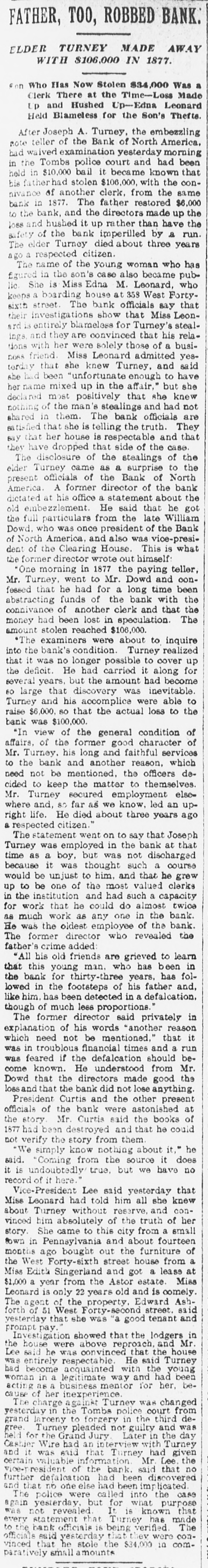 FATHER, TOO, ROBBED BANK. ELDER TURNEY MADE AWAY WITH $106,000 IN 1877. on Who Has Now Stolen $34,000 Was a Clerk There at the Time-Loss Made Up and Hushed Up-Edna Leonard Held Blameless for the Son's Thefte After Joseph A. Turney, the embezzling note teller of the Bank of North America, bad waived examination yesterday morning in the Tombs police court and had been held in $10,000 bail it becam known that bis father had stolen $106,000, with the connivance of another clerk. from the same bank in 1877. The father restored $6,000 to the bank, and the directors made up the loss and hushed it up rather than have the safety of the bank imperilled by a run. The elder Turney died about three years ago a respected citizen. The name of the young woman who has figured in the son's case also became public She is Miss Edna M. Leonard, who keeps a boarding house at 358 West Fortysixth street. The bank officials say that their investigations show that Miss Leonard is entirely blameless for Turney's steal. ings and they are convinced that his rela. tions with her were solely those of a businoss friend. Miss Leonard admitted yesterday that she knew Turney, and said she had been "unfortunate enough to have her name mixed up in the affair." but she declared most positively that she knew nothing of the man' 's stealings and had not shared in them. The bank officials are satisfied that she is telling the truth. They Bay that her house is respectable and that they have dropped that side of the case The disclosure of the stealings of the elder Turney came as a surprise to the present officials of the Bank of North America. A former director of the bank dictated at his office a statement about the old embezzlement. He said that he got the full particulars from the late William Dowd. who was once president of the Bank of North America. and also was vice-president of the Clearing House. This is what the former director wrote out himself "One morning in 1877 the paying teller, Mr. Turney, went to Mr. Dowd and confessed that he had for a long time been abstracting funds of the bank with the connivance of another clerk and that the money had been lost in speculation. The amount stolen reached $106,000. *The examiners were about to inquire into the bank's condition. Turney realized that it was no longer possible to cover up the deficit. He had carried it along for several years, but the amount had become 60 large that discovery was inevitable. Turney and his accomplice were able to raise $6,000. so that the actual loss to the bank was $100,000. "In view of the general condition of affairs, of the former good character of Mr. Turney. his long and faithful services to the bank and another reason, which need not be mentioned, the officers decided to keep the matter to themselves. Mr. Turney secured employment else= where and, SD far as we know, led an upright life. He died about three years ago a respected citizen." The statement went on to say that Joseph Turney was employed in the bank at that time as a boy, but was not discharged because it was thought such a course would be unjust to him. and that he grew up to be one of the most valued clerks in the institution and had such a capacity for work that he could do almost twice as much work as any one in the bank. He was the oldest employee of the bank. The former director who revealed the father's crime added "All his old friends are grieved to learn that this young man. who has been in the bank for thirty-three years, has followed in the footsteps of his father and, like him. has been detected in a defalcation though of much less proportions." The former director said privately in explanation of his words 'another reason which need not be mentioned.' that it was in troublous financial times and a run was feared if the defalcation should become known. He understood from Mr. Dowd that the directors made good the loss and that the bank did not lose anything. President Curtis and the other present officials of the bank were astonished at the story Mr Curtis said the books of had been destroyed and that he could not verify the story from them We simply know nothing about it," he said. Coming from the source it does it is undoubtedly true. but we have no record of it here. Vice-President Lee said yesterday that Miss Leonard had told him all she knew about Turney without reserve, and convinced him absolutely of the truth of her story. She came to this city from a small town in Pennsylvania and about fourteen months ago bought out the furniture of the West Forty-sixth street house from a Miss Edith Singerland and got a leass at $1,000 a year from the Astor estate. Miss Leonard is only 22 years old and is comely The agent of the property, Edward Ashforth of 51 West Forty-second street. said yesterday that she was "a good tenant and prompt pay. Investigation showed that the lodgers in the house were above reproach. and Mr. Lee said he was convinced that the house was entirely respectable He said Turney had become acquainted with the young woman in a legitimate way and had been acting as a businessmenton for her, because of her inexperience. The charge against Turnev was changed yesterday in the Tombs police court from grand larceny to forgery in the third degree. Turney pleaded not guilty and was held for the Grand Jury Later in the day Cashier Wire had interview with Turney and it was said that Turney had given certain valuable information Mr Lee. the vice-resident of the bank. said that no further defalcation had been discovered and that no one else had been im: licated The police were called into the case again yesterday, but for what purpose was not revealed. It is known that every statement that Turney has made to the bank officials is being verified The officials said yesterday that they were con. vinced that he stole the $34,000 in comparatively small amounts