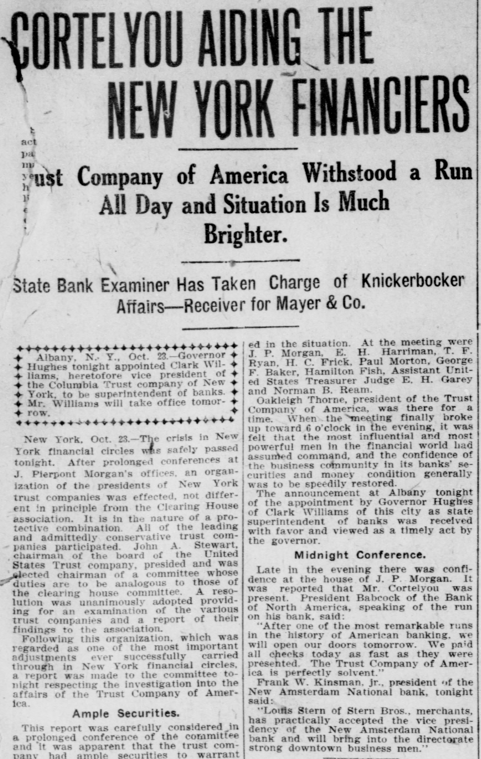 CORTELYOU AIDING THE NEW YORK FINANCIERS act mi ust Company of America Withstood a Run h All Day and Situation Is Much Brighter. State Bank Examiner Has Taken Charge of Knickerbocker Affairs-Receiver for Mayer & Co. ed in the situation. At the meeting were J. P. Morgan, E. H. Harriman, T. F. Albany, N. Y., Oct. 23.-Governor Ryan, H. C. Frick, Paul Morton, George Hughes tonight appointed Clark WilF. Baker, Hamilton Fish, Assistant Unitliams, heretofore vice president of ed States Treasurer Judge E. H. Garey the Columbia Trust company of New and Norman B. Ream. York, to be superintendent of banks. Oakleigh Thorne, president of the Trust Mr. Williams will take office tomorCompany of America, was there for a row. time. When the meeting finally broke up toward 6 o'clock in the evening, it was felt that the most influential and most New York, Oct. 23.-The crisis in New powerful men in the financial world had York financial circles was safely passed assumed command, and the confidence of tonight. After prolonged conferences at the business community in its banks' seJ. Pierpont Morgan's offices, an organcurities and money condition generally was to be speedily restored. ization of the presidents of New York The announcement at Albany tonight trust companies was effected, not differof the appointment by Governor Hughes ent in principle from the Clearing House of Clark Williams of this city as state association. It is in the nature of a prosuperintendent of banks was received tective combination. All of the leading with favor and viewed as a timely act by and admittedly conservative trust comthe governor. panies participated. John A. Stewart, chairman of the board of the United Midnight Conference. States Trust company, presided and was Late in the evening there was confielected chairman of a committee whose dence at the house of J. P. Morgan. It duties are to be analogous to those of was reported that Mr. Cortelyou was the clearing house committee. A resopresent. President Babcock of the Bank lution was unanimously adopted providof North America, speaking of the run ing for an examination of the various on his bank, said: trust companies and a report of their "After one of the most remarkable runs findings to the association. in the history of American banking, we Following this organization, which was will open our doors tomorrow. We paid regarded as one of the most important all checks today as fast as they were adjustments ever successfully carried presented. The Trust Company of Amerthrough in New York financial circles, ica is perfectly solvent." a report was made to the committee toFrank W. Kinsman. jr., president of the night respecting the investigation into the New Amsterdam National bank, tonight affairs of the Trust Company of Amersaid: ica. "Louis Stern of Stern Bros., merchants, Ample Securities. has practically accepted the vice presiThis report was carefully considered in dency of the New Amsterdam National a prolonged conference of the committee bank and will bring into the directorate and it was apparent that the trust comstrong downtown business men." panv had ample securities to warrant