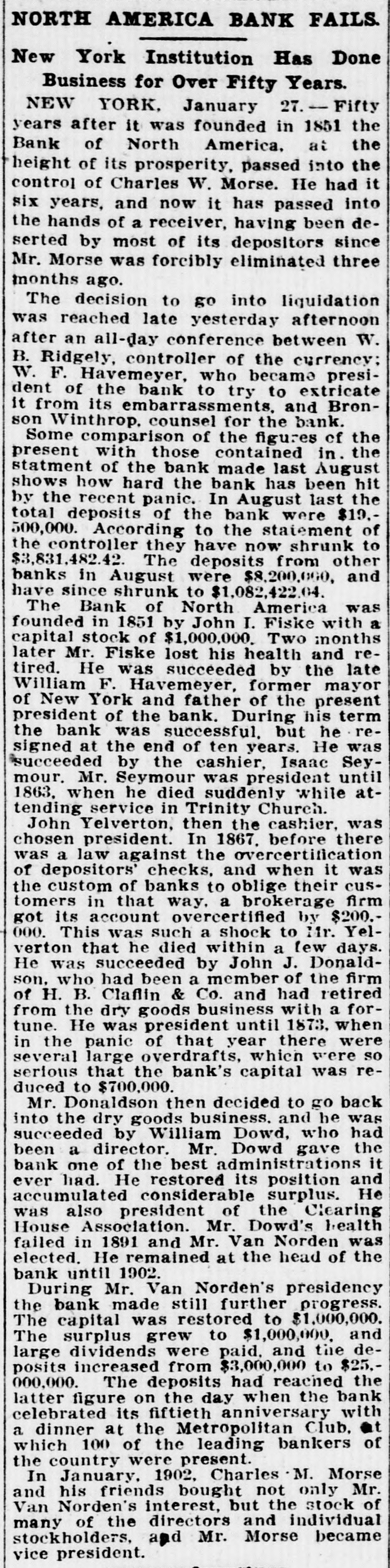 NORTH AMERICA BANK FAILS. New York Institution Has Done Business for Over Fifty Years. NEW YORK, January 27. - Fifty years after it was founded in 1851 the Bank of North America. at the height of its prosperity, passed into the control of Charles W. Morse. He had it six years. and now it has passed into the hands of a receiver, having been deserted by most of its depositors since Mr. Morse was forcibly eliminated three months ago. The decision to go into liquidation was reached late yesterday afternoon after an all-day conference between W. B. Ridgely, controller of the currency; W. F. Havemeyer, who became president of the bank to try to extricate it from its embarrassments, and Bronson Winthrop. counsel for the bank. Some comparison of the figures cf the present with those contained in. the statment of the bank made last August shows how hard the bank has been hit by the recent panic. In August last the total deposits of the bank were $19.500,000. According to the statement of the controller they have now shrunk to $3,831,482.42 The deposits from other banks in August were $8,200,000, and have since shrunk to $1,082,422.04. The Bank of North America was a founded in 1851 by John I. Fiske with capital stock of $1,000,000. Two months later Mr. Fiske lost his health and retired. He was succeeded by the late William F. Havemeyer, former mayor of New York and father of the present president of the bank. During his term the bank was successful, but he resigned at the end of ten years. He was succeeded by the cashier. Isaac Seymour. Mr. Seymour was president until 1863. when he died suddenly while attending service in Trinity Church. John Yelverton, then the cashier. was chosen president. In 1867. before there was a law against the overcertification of depositors' checks, and when it was the custom of banks to oblige their customers in that way, a brokerage firm got its account overcertified by $200.000. This was such a shock to Mr. Yelverton that he died within a few days. He was succeeded by John J. Donaldson, who had been a member of the firm of H. B. Claflin & Co. and had retired from the dry goods business with a fortune. He was president until 1873, when in the panic of that year there were several large overdrafts, which were so serious that the bank's capital was reduced to $700,000. Mr. Donaldson then decided to go back into the dry goods business. and he was succeeded by William Dowd, who had been a director. Mr. Dowd gave the bank one of the best administrations it ever had. He restored its position and accumulated considerable surplus. He was also president of the Clearing House Association. Mr. Dowd's health failed in 1891 and Mr. Van Norden was elected. He remained at the head of the bank until 1902. During Mr. Van Norden's presidency the bank made still further progress. The capital was restored to $1,000,000. The surplus grew to $1,000,000. and large dividends were paid. and the deposits increased from $3,000,000 to $25.000,000. The deposits had reached the latter figure on the day when the bank celebrated its fiftieth anniversary with a dinner at the Metropolitan Club. at which 100 of the leading bankers of the country were present. In January. 1902, Charles M. Morse and his friends bought not only Mr. Van Norden's interest, but the stock of many of the directors and individual stockholders. and Mr. Morse became vice president.