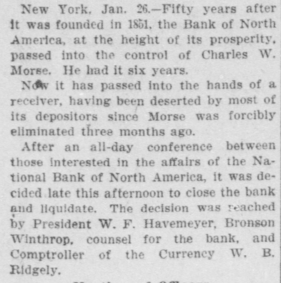 New York, Jan. 26.-Fifty years after it was founded in 1851. the Bank of North America, at the height of its prosperity, passed into the control of Charles W. Morse. He had it six years. Now it has passed into the hands of a receiver, having been deserted by most of its depositors since Morse was forcibly eliminated three months ago. After an all-day conference between those interested in the affairs of the National Bank of North America, it was decided late this afternoon to close the bank and liquidate. The decision was reached by President W. F. Havemeyer, Bronson Winthrop, counsel for the bank, and Comptroller of the Currency W. B. Ridgely.