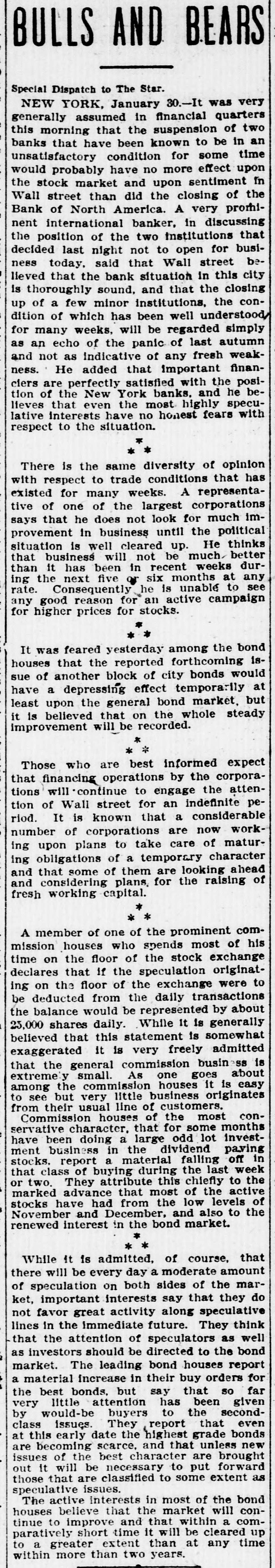 BULLS AND BEARS Special Dispatch to The Star. NEW YORK, January 30.-It was very generally assumed in financial quarters this morning that the suspension of two have been known to an condition for some unsatisfactory banks that effect be in upon time have no more and upon would the stock probably market sentiment of the fn Wall street than did the closing Bank of North America. A very banker, in nent international discussing promiof the two Institutions that last not to open decided the position night for busi- beness today. said that Wall street lieved that the bank situation in this city is thoroughly sound, and that the closing a few minor of which has been well dition up of institutions, understood/ the simply confor many weeks, will be regarded as an echo of the panic of last autumn and not as indicative of any fresh weakness. He added that important financiers are perfectly satisfied with the posi- betion of the New York banks. and he lieves that even the most highly specu- with lative interests have no honest fears respect to the situation. * * There is the same diversity of opinion has with respect to trade conditions that existed for many weeks. A representative of one of the largest corporations that he does not look for in business until says provement the He much political thinks imis well cleared up. will not be it has been in situation that than business recent much weeks at better dur- any the next five or six months see ing Consequently he is unable to rate. any good reason for an active campaign for higher prices for stocks. It was feared yesterday among the bond ishouses that the reported forthcoming would of another block of city bonds at sue have a depressing effect temporarily but least upon the general bond market, it is believed that on the whole steady improvement will be recorded. * * * Those who are best informed expect that financing operations by the corpora- attentions will continue to engage the peof Wall street for an indefinite riod. tion It is known that a considerable worknumber of corporations are now maturing upon plans to take care of obligations of a temporary character ahead ing some of them are looking of and and that considering plans. for the raising fresh working capital. * A member of one of the prominent com- his mission houses who spends most of time on the floor of the stock exchange declares that if the speculation originat- to on the floor of the exchange were ing be deducted from the daily transactions about the balance would be represented by 25,000 shares daily. While it is somewhat generally believed that this statement is exaggerated it is very freely admitted is the general commission busin about SS that small. As one goes is the commission houses it easy among very little business extremely see but customers. originates to usual line of houses of the that for some doing a large from servative Commission their been character. odd most lot months invest- paying conin the in ment material falling off stocks. of buying during the the have class business report a dividend last to week that They attribute this chiefly active or two. advance that most of the levels marked have had from the low to the of stocks November and December, and also * renewed interest in the bond market. * While it is admitted, of course, that there will be every day a moderate amount of speculation on both sides of the mar- do important interests say that they ket, favor great activity along speculative lines not in the immediate future. They think well that the attention of speculators as bond as investors should be directed to the The leading bond houses report increase in their buy market. a material that orders so far for best bonds. but say given the attention has very buyers to by report that would-be little issues. They the been second- bonds even class date the 'highest new at scarce, and that this becoming early grade unless brought are of the best character are forward issues will be necessary to put as those out it that are classified to some extent speculative issues. interests in most of the bond that the market conThe active believe within will a comhouses to improve and that cleared up tinue short time it will be time paratively greater extent than at any to within a more than two years.