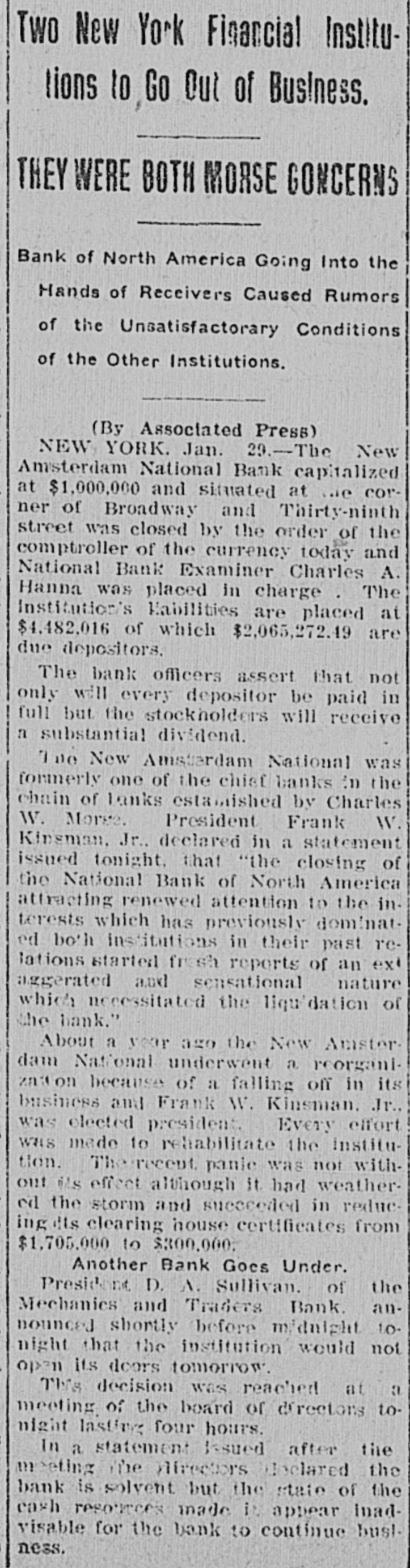 Two New York Financial Institutions to Go Out of Business. THEY WERE BOTH MORSE GONCERNS Bank of North America Going Into the Hands of Receivers Caused Rumors of the Unsatisfactorary Conditions of the Other Institutions. (By Associated Press) NEW YORK. Jan. 29.-The New Amsterdam National Bank capitalized at $1,000,000 and situated at we corner of Broadway and Thirty-ninth street was closed by the order of the comptroller of the currency today and National Bank Examiner Charles A. Hanna was placed in charge The Institution's Habilities are placed at $4,482,016 of which $2,065,272.49 are due depositors. The bank officers assert that not only will every depositor be paid in full but the stockholders will receive n substantial dividend. Two New Amstardam National was formerly one of the chist banks in the chain of Lanks estamished by Charles W. Morge. President Frank W. Kinsman, Jr., declared in a statement issued tonight, that "the closing of the National Bank of North America attracting renewed attention to the interests which has previously dominated both institutions in their past relations started fresh reports of an ext aggerated and sensational nature which necessitated the liquidation of the hank." About a year ago the New Ansterdam National underwent a reorganization because of a falling off in its business and Frank W. Kinsman. Jr., was elected president. Every effort WHS made to rehabilitate the institution. The recent panie was not without its effect although it had weathered the storm and succeeded in reducingets clearing house certificates from $1,705,000 to $300.000. Another Bank Goes Under. President D. A. Sullivan. of the Mechanics and Traders Bank. announced shortly before midnight to. night that the institution would not open its doors tomorrow. This decision was reached at a meeting of the board or directors tonight lasting four hours. In a statement Issued after the meeting The directors doclared the bank is solvent but the state of the cash resources made it appear Inadvisable for the bank to continue bustness.
