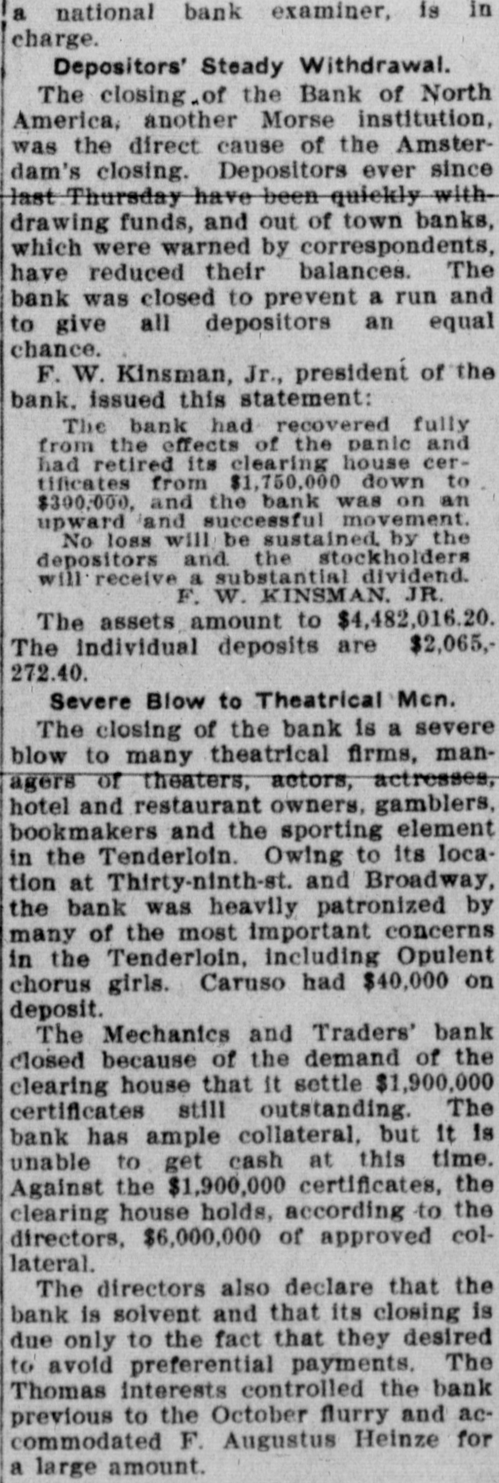 a national bank examiner, is in charge. Depositors' Steady Withdrawal. The closing of the Bank of North America, another Morse institution, was the direct cause of the Amsterdam's closing. Depositors ever since last Thursday have been quickly withdrawing funds, and out of town banks, which were warned by correspondents, have reduced their balances. The bank was closed to prevent a run and to give all depositors an equal chance. F. W. Kinsman, Jr., president of the bank. issued this statement: The bank had recovered fully from the effects of the panic and had retired its clearing house certificates from $1,750,000 down to $300,000, and the bank was on an upward and successful movement. No loss will be sustained. by the depositors and the stockholders will receive a substantial dividend. F. W. KINSMAN. JR. The assets amount to $4,482,016.20. The individual deposits are $2,065,272.40. Severe Blow to Theatrical Mcn. The closing of the bank is a severe blow to many theatrical firms, managers of theaters, actors, actresses, hotel and restaurant owners, gamblers, bookmakers and the sporting element in the Tenderloin. Owing to its location at Thirty-ninth-st. and Broadway, the bank was heavily patronized by many of the most important concerns in the Tenderloin, including Opulent chorus girls. Caruso had $40,000 on deposit. The Mechanics and Traders' bank closed because of the demand of the clearing house that it settle $1,900,000 certificates still outstanding. The bank has ample collateral, but it is unable to get cash at this time. Against the $1,900,000 certificates, the clearing house holds, according to the directors, $6,000,000 of approved collateral. The directors also declare that the bank is solvent and that its closing is due only to the fact that they desired to avoid preferential payments. The Thomas interests controlled the bank previous to the October flurry and accommodated F. Augustus Heinze for a large amount.