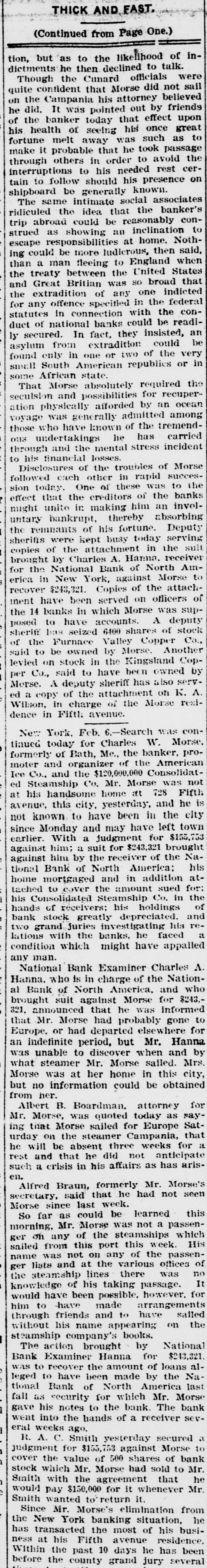 abroad could be reasonal as showing an inclina responsibilities at home could be more ludicrous, tl a man fleeing to Englar treaty between the United Great Britian was SO bro extradition of any one any offence specified in the in connection with t of national banks could 1 secured. In fact, they insi /lum from extradition e only in one or two of South American republi African state. 'hat Morse absolutely required ulsion and possibilities for physically afforded by : was generally admitted who have known of the : undertakings he has and the mental stress financial losses. Disclosures of the troubles ( lowed each other in rapid today. One of these wa that the creditors of th unito in making him a bankrupt, thereby a remnants of his fortune. were kept busy today of the attachment in night by Charles A. Hanna. the National Bank of No in New York, against : $243,321. Copies of the have been served on of 14 banks in which Morse \ to have accounts. A has seized 6400 shares the Furnace Valley Cop to be owned by Morse. on stock in the Kingsla Co., said to have been o A deputy sheriff has a a copy of the attachment ( in charge of the Mo in Fifth avenue. New York, Feb. 6.-Search 1 today for Charles W. merly of Bath, Me., the ban and organizer of the I Co., and the $120,000,000 Co Steamship Co. Mr. Morse his handsome home at 72 this city, yesterday, a known to have been in Monday and may have I With a judgment for ainst him; a suit for $243,321 him by the receiver of Bank of North Ameri mortgaged and in add to cover the amount : Consolidated Steamship C of receivers: his hold stock greatly deprecia grand Juries investigating with the banks, he 1 idition which might have man. National Bank Examiner CI who is in charge of the Bank of North America, ought suit against Morse 1 announced that he was Mr. Morse had probably or had departed elsev indefinite period. but Mr.