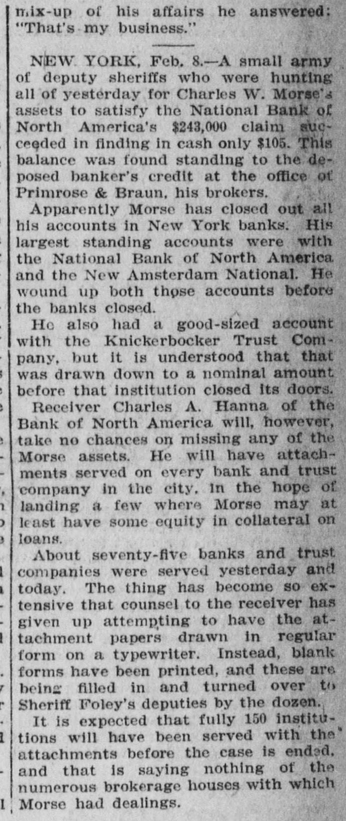 mix-up of his affairs he answered: "That's-my business." NEW YORK, Feb. 8.-A small army of deputy sheriffs who were hunting all of yesterday for Charles W. Morse's assets to satisfy the National Bank of North America's $243,000 claim sueceeded in finding in cash only $105. This balance was found standing to the deposed banker's credit at the office of Primrose & Braun, his brokers. Apparently Morse has closed out all his accounts in New York banks. His largest standing accounts were with the National Bank of North America and the New Amsterdam National. He wound up both those accounts before the banks closed. He also had a good-sized account with the Knickerbocker Trust Company, but it is understood that that was drawn down to a nominal amount before that institution closed its doors. Receiver Charles A. Hanna of the Bank of North America will, however, take no chances on missing any of the Morse assets. He will have attachments served on every bank and trust company in the city. In the hope of landing a few where Morse may at least have some equity in collateral on loans. About seventy-five banks and trust companies were served yesterday and today. The thing has become so extensive that counsel to the receiver has given up attempting to have the attachment papers drawn in regular form on a typewriter. Instead, blank forms have been printed, and these are being filled in and turned over to Sheriff Foley's deputies by the dozen. It is expected that fully 150 institutions will have been served with the attachments before the case is ended. and that is saying nothing of the numerous brokerage houses with which I Morse had dealings.