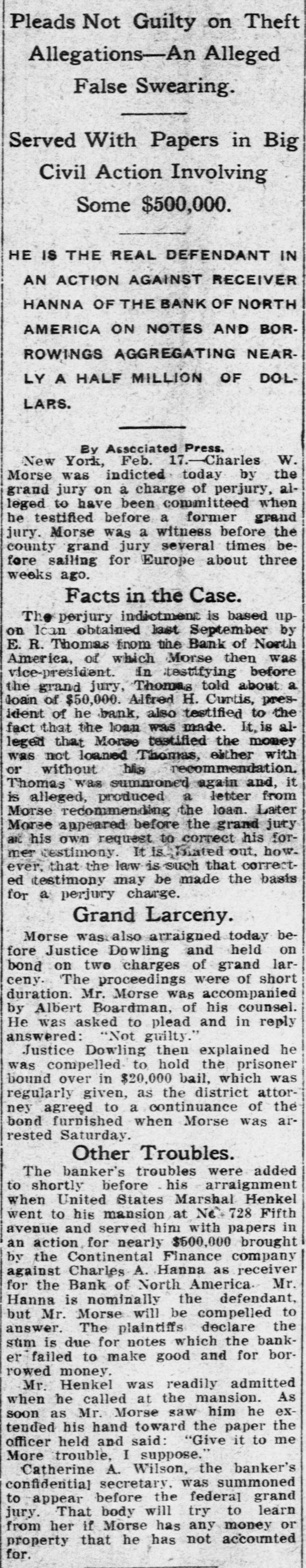 Pleads Not Guilty on Theft Allegations-An Alleged False Swearing. Served With Papers in Big Civil Action Involving Some $500,000. HE IS THE REAL DEFENDANT IN AN ACTION AGAINST RECEIVER HANNA OF THE BANK OF NORTH AMERICA ON NOTES AND BORROWINGS AGGREGATING NEARLY A HALF MILLION OF DOLLARS. By Associated Press. New York, Feb. 17.-Charles W. Morse was indicted today by the grand jury on a charge of perjury, alleged to have been committeed when he testified before a former grand jury. Morse was a witness before the county grand jury several times before sailing for Europe about three weeks ago. Facts in the Case. The perjury indictment is based upon Ican obtained last September by E. R. Thomas from time Bank of North America, of which Morse then was vice-president. In testifying before the grand jury, Thomas told about a loan of $50,000. Alfred H. Curtis, president of he bank, also testified to the fact that the loan was made. Lt, is alleged that Morse testified the money was not loaned Thomas, either with or without his recommendation. Thomas was summoned again and, it is alleged, produced a letter from Morse recommending the loan. Later Morse appeared before the grand jury atc his own request to correct his former destimony. It is Diated out, how. ever, that the law is such that corrected testimony may be made the basis for a perjury charge. Grand Larceny. Morse was also arraigned today before Justice Dowling and held on bond on two charges of grand larceny. The proceedings were of short duration. Mr. Morse was accompanied by Albert Boardman, of his counsel. He was asked to plead and in reply answered: "Not guilty." Justice Dowling then explained he was compelled to hold the prisoner bound over in $20,000 bail, which was regularly given, as the district attorney agreęd to a continuance of the bond furnished when Morse was arrested Saturday. Other Troubles. The banker's troubles were added to shortly before his arraignment when United States Marshal Henkel went to his mansion at No. 728 Fifth avenue and served him with papers in an action for nearly $500,000 brought by the Continental Finance company against Charles A. Hanna as receiver for the Bank of North America. Mr. Hanna is nominally the defendant, but Mr. Morse will be compelled to answer. The plaintiffs declare the sum is due for notes which the banker failed to make good and for borrowed money. Mr. Henkel was readily admitted when he called at the mansion. As soon as Mr. Morse saw him he extended his hand toward the paper the officer held and said: "Give it to me More trouble, I suppose. Catherine A. Wilson, the banker's confidential secretary, was summoned to appear before the federa] grand jury. That body will try to learn from her if Morse has any money or property that he has not accounted for.