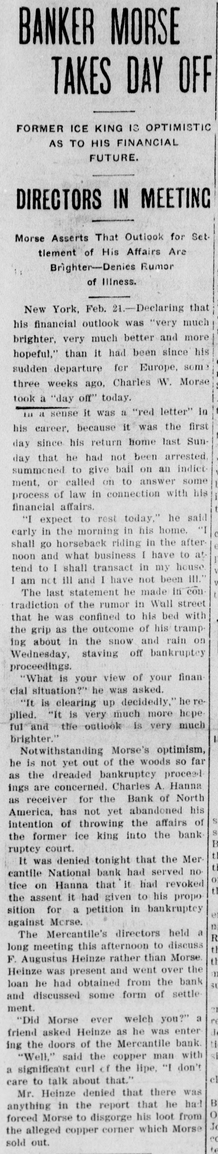BANKER MORSE TAKES DAY OFF FORMER ICE KING IS OPTIMISTIC AS TO HIS FINANCIAL FUTURE. DIRECTORS IN MEETING Morse Asserts That Outlook for Set. tlement of His Affairs Are Brighter-Denies Rumor of Illness. New York, Feb. 21.-Declaring that his financial outlook was "very much brighter, very much better and more hopeful," than it had been since his sudden departure for Europe, some three weeks ago, Charles W. Morse took a "day off" today. 111 a sense it was a "red letter" In his career. because it was the first day since his return home last Sunday that he had not been arrested. summened to give bail on an indictment, or called on to answer some process of law in connection with his financial affairs. "I expect to rest today," he said early in the morning in his home. "I shall go horseback riding in the after noon and what business I have to at tend to I shall transact in my house I am not ill and I have not been ill. The last statement he made in con tradiction of the rumor in Wall street that he was confined to his bed with the grip as the outcome of his tramp ing about in the snow and rain on Wednesday, staving off bankruptcy proceedings. "What is your view of your finan cial situation?" he was asked. "It is clearing up decidedly," he replied. "It is very much more hope ful and the outlook is very much brighter." Notwithstanding Morse's optimism, he is not yet out of the woods so far as the dreaded bankruptcy proceed ings are concerned. Charles A. Hanna as receiver for the Bank of North America, has not yet abandoned his S intention of throwing the affairs of si the former ice king into the bank B ruptey court. t It was denied tonight that the Merti cantile National bank had served no o tice on Hanna that it had revoked t the assent it had given to his propo sition for a petition in bankruptcy et against Morse. n The Mercantile's directors held a R tl long meeting this afternoon to discuss th F. Augustus Heinze rather than Morse. n Heinze was present and went over the su loan he had obtained from the bank and discussed some form of settle e ment. re "Did Morse ever welch you?" a de friend asked Heinze as he was enter ti ing the doors of the Mercantile bank. si "Well," said the copper man with a significant curl of the lipe, "I don't el care to talk about that." Mr. Heinze denied that there was B anything in the report that he had O forced Morse to disgorge his loot from Jo the alleged copper corner which Morse ed sold out. te
