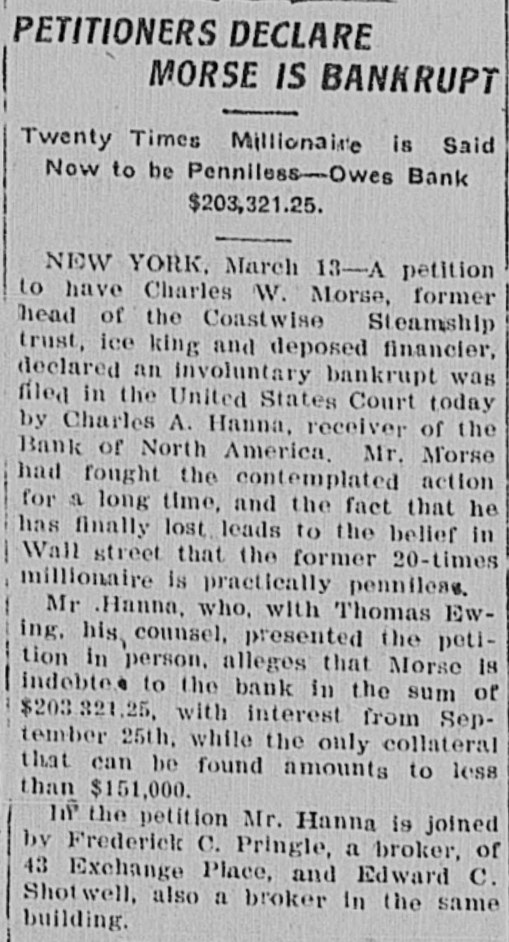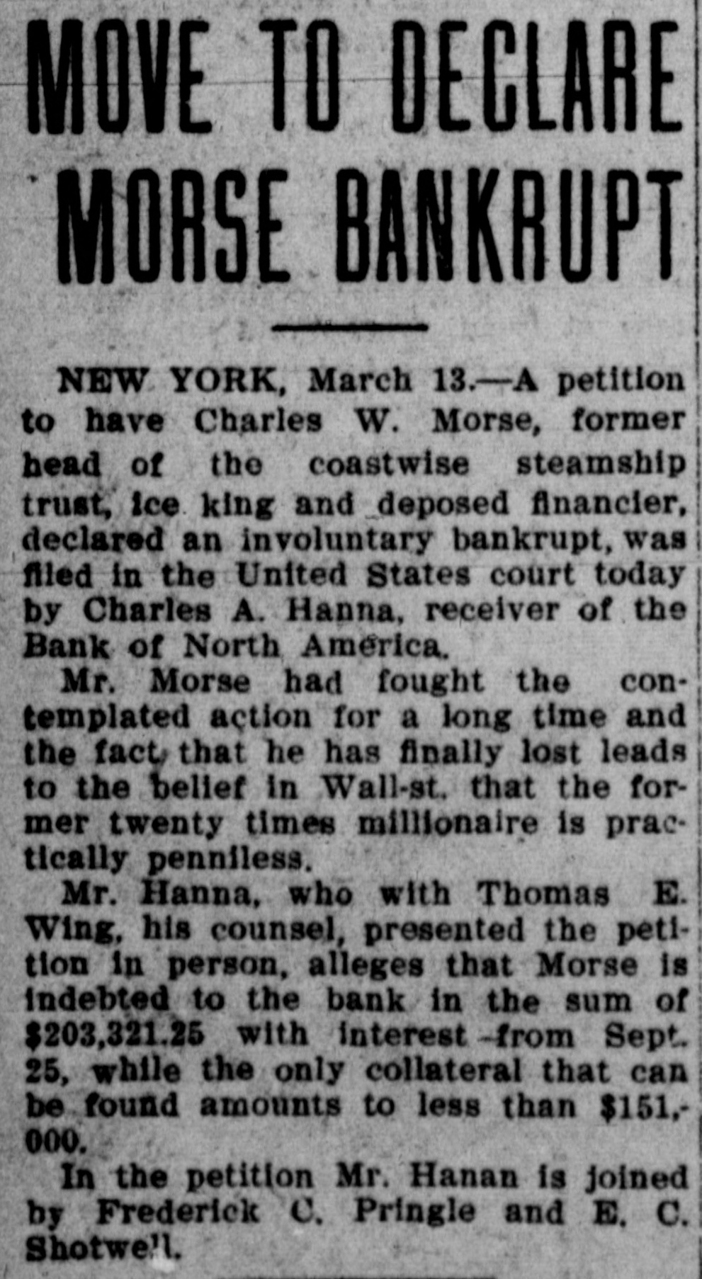 PETITIONERS DECLARE MORSE IS BANKRUPT Twenty Times Millionaire is Said Now to be Penniless-Owes Bank $203,321.25. NEW YORK, March 13-A petition to have Charles W. Morse, former head of the Coastwise Steamship trust, ice king and deposed financier, declared an involuntary bankrupt was filed in the United States Court today by Charles A. Hanna, receiver of the Bank of North America. Mr. Morse had fought the contemplated action for a long time, and the fact that he has finally lost leads to the belief in Wall street that the former 20-times millionaire is practically penniless. Mr .Hanna, who, with Thomas Ewing, his counsel, presented the petition in person, alleges that Morse is indebte to the bank in the sum of $203,321.25, with interest from September 25th, while the only collateral that can be found amounts to less than $151,000. Till the petition Mr. Hanna is joined by Frederick C. Pringle, a broker, of 43 Exchange Place, and Edward C. Shotwell, also a broker In the same building.
