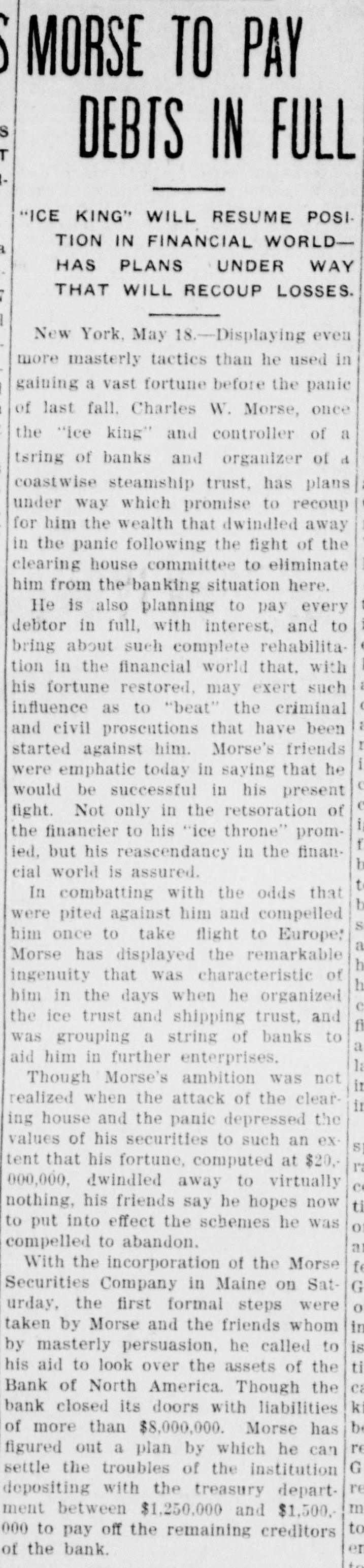 MORSE TO PAY DEBTS IN FULL "ICE KING" WILL RESUME POSI. TION IN FINANCIAL WORLDHAS PLANS UNDER WAY THAT WILL RECOUP LOSSES. New York, May 18.-Displaying even more masterly tactics than he used in gaining a vast fortune before the panie of last fall. Charles W. Morse, once the "ice king" and controller of a tsring of banks and organizer of d coastwise steamship trust, has plans under way which promise to recoup for him the wealth that dwindled away in the panic following the fight of the clearing house committee to eliminate him from the banking situation here. He is also planning to pay every debtor in full, with interest, and to * bring about such complete rehabilitation in the financial world that, with his fortune restored, may exert such influence as to "beat" the criminal : and civil prosentions that have been I started against him. Morse's friends i were emphatic today in saying that he ( would be successful in his present e fight. Not only in the retsoration of i the financier to his "ice throne" promf ied. but his reascendancy in the finanI cial world is assured. t In combatting with the odds that b were pited against him and compelled S him once to take flight to Europe: a Morse has displayed the remarkable h ingenuity that was characteristic of h him in the days when he organized e the ice trust and shipping trust, and fi was grouping a string of banks to a aid him in further enterprises. la Though Morse's ambition was not it realized when the attack of the clearit ing house and the panic depressed the values of his securities to such an exS tent that his fortune, computed at $20,l'a 000,000, dwindled away to virtually C nothing, his friends say he hopes now ti to put into effect the schemes he was 0 compelled to abandon. a With the incorporation of the Morse fe Securities Company in Maine on SatG urday, the first formal steps were o taken by Morse and the friends whom in by masterly persuasion, he called to is his aid to look over the assets of the ti ca Bank of North America. Though the k bank closed its doors with liabilities be of more than $8,000,000. Morse has re figured out a plan by which he can G settle the troubles of the institution re depositing with the treasury departm ment between $1,250,000 and $1,500, to 000 to pay off the remaining creditors en of the bank.
