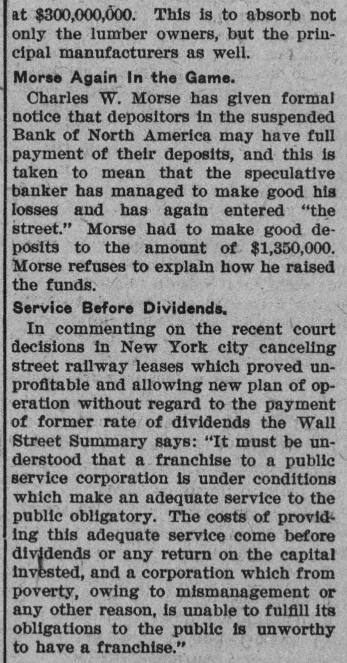 at $300,000,000. This is to absorb not only the lumber owners, but the principal manufacturers as well. Morse Again In the Game. Charles W. Morse has given formal notice that depositors in the suspended Bank of North America may have full payment of their deposits, and this is taken to mean that the speculative banker has managed to make good his losses and has again entered "the street." Morse had to make good deposits to the amount of $1,350,000. Morse refuses to explain how he raised the funds. Service Before Dividends. In commenting on the recent court decisions in New York city canceling street railway leases which proved unprofitable and allowing new plan of operation without regard to the payment of former rate of dividends the Wall Street Summary says: "It must be understood that a franchise to a public service corporation is under conditions which make an adequate service to the public obligatory. The costs of providing this adequate service come before dividends or any return on the capital invested, and a corporation which from poverty, owing to mismanagement or any other reason, is unable to fulfill its obligations to the public is unworthy to have a franchise."