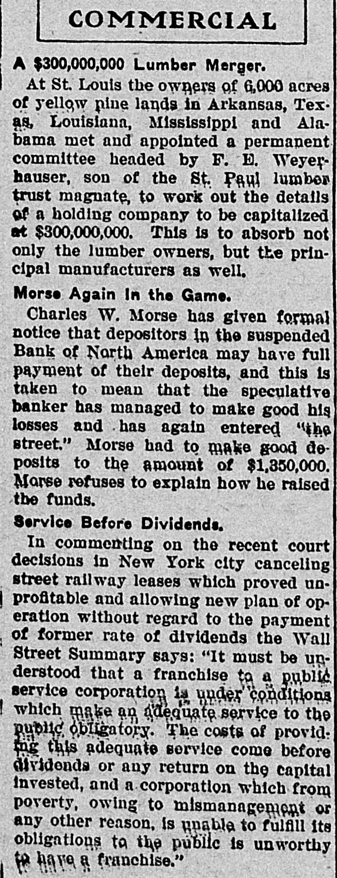 COMMERCIAL A $300,000,000 Lumber Merger. At St. Louis the owners of 6,000 acres of yellow pine lands in Arkansas, Tex. as, Louisiana, Mississippi and Alabama met and appointed a permanent committee headed by F. E. Weyerhauser, son of the St. Paul lumber trust magnate, to work out the details of a holding company to be capitalized at $300,000,000. This is to absorb not only the lumber owners, but the principal manufacturers as well. Morse Again In the Game. Charles W. Morse has given formal notice that depositors in the suspended Bank of North America may have full payment of their deposits, and this is taken to mean that the speculative banker has managed to make good his losses and has again entered "the street." Morse had to make good deposits to the amount of $1,350,000. Morse refuses to explain how he raised the funds. Service Before Dividends. In commenting on the recent court decisions in New York city canceling street railway leases which proved unprofitable and allowing new plan of operation without regard to the payment of former rate of dividends the Wall Street Summary says: "It must be understood that a franchise to a public service corporation is under conditions which make an adequate service to the public obligatory. The costs of provid. ing this adequate service come before dividends or any return on the capital invested, and a corporation which from poverty, owing to mismanagement or any other reason, is unable to fulfill its obligations to the public is unworthy to have a franchise."