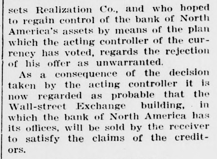 As a consequence of the decision taken by the acting controller it is now regarded as probable that the Wall-street Exchange building, in which the bank of North America has its offices, will be sold by the receiver to satisfy the claims of the creditors.