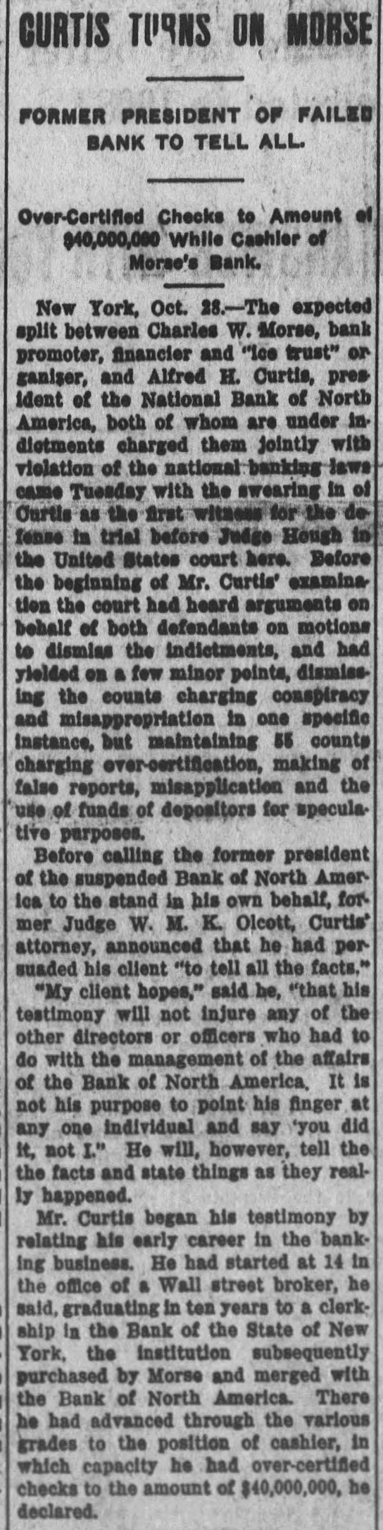 CURTIS TURNS ON MORSE FORMER PRESIDENT OF FAILED BANK TO TELL ALL. Over-Certified Checks to Amount of $40,000,000 While Cashier of Morse's Bank. New York, Oct. 28.-The expected split between Charles W. Morse, bank promoter, financier and "ice trust" or ganizer, and Alfred H. Curtis, pres ident of the National Bank of North America, both of whom are under indictments charged them jointly with violation of the national banking laws came Tuesday with the swearing in of Ourtis as the first withous for the de fense in trial before Judge Hough in the United States court here. Before the beginning of Mr. Curtis' examination the court had heard arguments on behalf of both defendants on motions to dismiss the indictments, and had yielded on a few minor points, dismissing the counts charging conspiracy and misappropriation in one specific instance, but maintaining 55 counts charging over-certification, making of false reports, misapplication and the use of funds of depositors for speculative purposes. Before calling the former president of the suspended Bank of North America to the stand in his own behalf, former Judge W. M. K. Olcott, Curtis' attorney, announced that he had persuaded his client "to tell all the facts." "My client hopes," said he, "that his testimony will not injure any of the other directors or officers who had to do with the management of the affairs of the Bank of North America. It is not his purpose to point his finger at any one individual and say 'you did it, not I" He will, however, tell the the facts and state things as they really happened. Mr. Curtis began his testimony by relating his early career in the banking business. He had started at 14 in the office of a Wall street broker, he said, graduating in ten years to a clerkship in the Bank of the State of New York, the institution subsequently purchased by Morse and merged with the Bank of North America. There he had advanced through the various grades to the position of cashier, in which capacity he had over-certifed checks to the amount of $40,000,000, he declared.