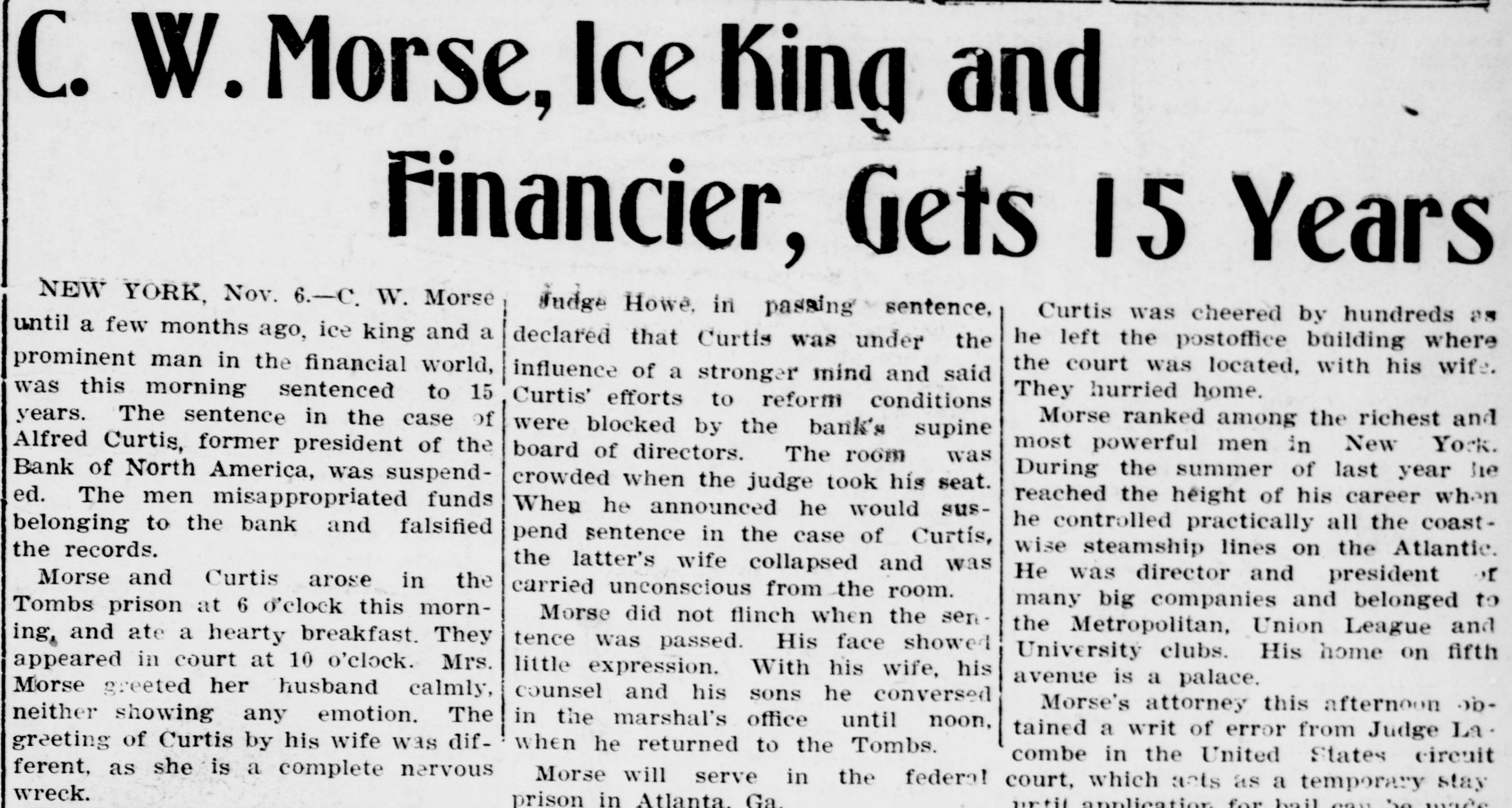 C. W. Morse, Ice King and Financier, Gets 15 Years NEW YORK Nov. 6.-C. W. Morse Judge Howe, in passing sentence, Curtis was cheered by hundreds as until a few months ago, ice king and a declared that Curtis was under the he left the postoffice building where prominent man in the financial world, the court was located, with his wife. influence of a stronger mind and said They hurried home. was this morning sentenced to 15 Curtis' efforts to reform conditions years. The sentence in the case of Morse ranked among the richest and were blocked by the bank's supine most powerful men in New York. Alfred Curtis, former president of the board of directors. The room was During the summer of last year he Bank of North America, was suspendcrowded when the judge took his seat. reached the height of his career when ed. The men misappropriated funds When he announced he would sushe controlled practically all the coastbelonging to the bank and falsified pend sentence in the case of Curtís, the records. wise steamship lines on the Atlantic. the latter's wife collapsed and was r He was director and president Morse and Curtis arose in the carried unconscious from the room. many big companies and belonged to Tombs prison at 6 o'clock this mornMorse did not flinch when the senthe Metropolitan, Union League and ing, and ate a hearty breakfast. They tence was passed. His face showed University clubs. His home on fifth appeared in court at 10 o'clock. Mrs. little expression. With his wife, his avenue is a palace. Morse greeted her husband calmly, counsel and his sons he conversed Morse's attorney this afternoon obneither showing any emotion. The in the marshal's office until noon, tained a writ of error from Judge La. greeting of Curtis by his wife was difwhen he returned to the Tombs. combe in the United States circuit ferent, as she is a complete nervous Morse will serve in the federal court, which acts as a temporary stay wreck. application prison in Atlanta. Ga.