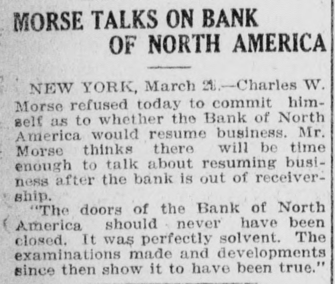MORSE TALKS ON BANK OF NORTH AMERICA NEW YORK, March 21.-Charles W. Morse refused today to commit himself as to whether the Bank of North America would resume business. Mr. Morse thinks there will be time enough to talk about resuming business after the bank is out of receivership. "The doors of the Bank of North America should never have been closed. It was perfectly solvent. The examinations made and developments since then show it to have been true."