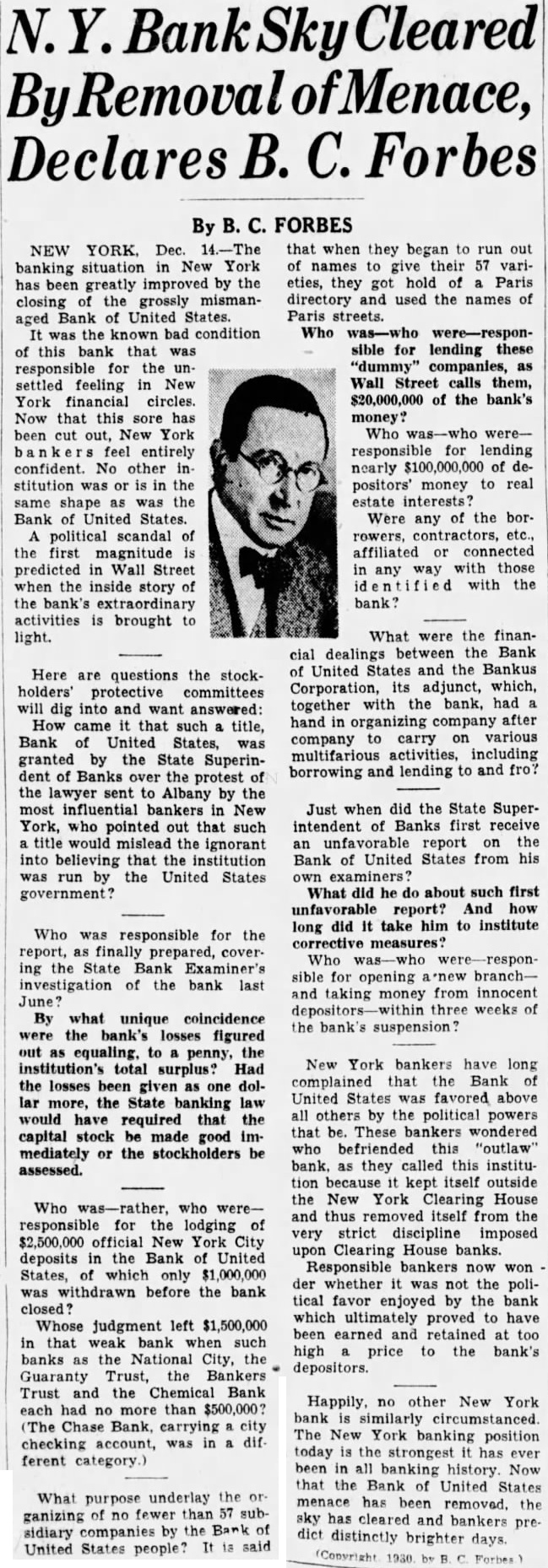 NEW YORK. Dec. 14.-The banking situation in New York has been greatly improved by the closing of the grossly mismanaged Bank of United States. was the known bad condition of this bank that was responsible for the unsettled feeling in New York financial circles. Now that this sore has been cut out, New York feel entirely confident. No other institution was or is in the same shape as was the Bank of United States. A political scandal of the first magnitude is predicted in Wall Street when the inside story of the bank's extraordinary activities is brought to light. that when they began to run out of names to give their 57 varieties, they got hold of Paris directory and used the names of Paris streets. Who was-who sible for lending these "dummy" companies, as Wall Street calls them, $20,000,000 of the bank's money? Who wereresponsible for lending nearly $100,000,000 of depositors' money to real estate interests? Were any of the borrowers, contractors, etc., affiliated or connected in any way with those with the bank?