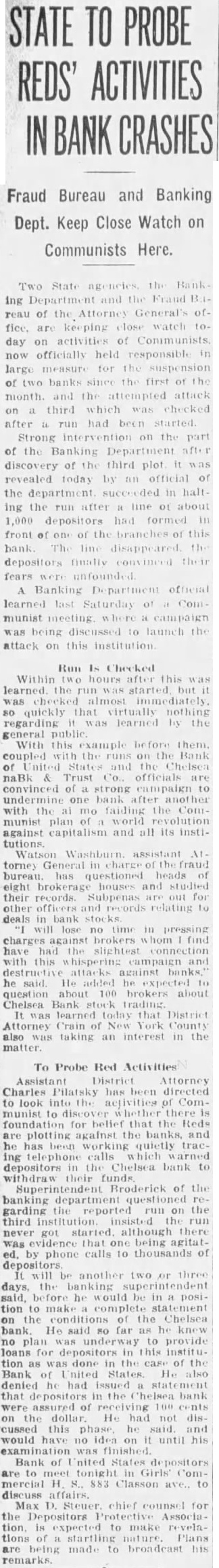 Assistant Attorney Charles Pilatsky has directed look into activities of Communist to foundation for that the Reds are plotting against the and he has quietly tracing calls depositors bank to withdraw their Broderick of the banking questioned garding reported run on the third Institution run there was that one being ed. by to thousands of depositors another two or three days, the said, he would be in position to make complete statement the conditions of the bank He 80 far he knew no tion was done the of the Bank of "nited States He denied he had issued that the Chelsea bank were assured of 100 on the dollar He had not discussed this phase he and would no on until his was to tonight Girls Commercial H. 883 Classon to discuss Max D. Steuer. chief counsel for the Depositors tion. is to make revelations startling made to broadcast his remarks