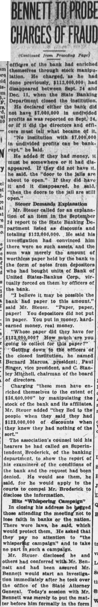 Page) officers of the bank had enriched themselves through stock manipulation. He charged. as he had done previously, had Sept. and Dec. 11, when the State Banking Department closed the Institution. He declared either the bank did not have $7,000,000 in undivided profits reported on Sept. if it did the directors and officers must tell what became it. 'No institution with undivided profits can be bankhe He added they had money. must be somewhere had dis. appeared. they did not have he said. the "door the jails about to If they did and disappeared. he said, "then the doors to the jail are still open." Steuer Demands Explanation Mr. Steuer called for explanation of an item in the September 24 report to the State Banking partment listed discounts and totaling $123,000,000. He said his investigation had convinced him there were no such assets, and the merely the amount of worthless paper held by the bank form of notes from depositors who had bought units of Bank of United Corp., virtually forced on them by officers of bank. believe it may be possible the bank had paper to this amount," said Mr. Steuer. "Paper, paper, paper! You depositors did not put in paper. You put in money, hardearned money, real money. paper did they have for How much are you going collect for this Getting down the officers of the closed institution. he named Bernard Marcus, president: Paul Singer, vice president, and Stanley Mitchell. chairman of the board Charging "these men have enriched themselves to the extent of by manipulating the stock of the bank and its affiliates. Mr. added "they lied to the people they said they had $123,000,000 discounts when they knew they had nothing of the sort." The association's counsel told his hearers he had called on Superintendent, Broderick, of the banking department, to the report of his examiners of the conditions of the bank and the request had been denied. He would see them, he said, for he would apply to the courts to compel Mr. Broderick to disclose the information. Hits "Whispering Campaign" In closing address he begged those attending the meeting to lose faith in banks or the nation. There were laws, he said. which would protect them. He asked that they pay no attention to "the whispering campaign" and to take no part such campaign. Mr. Steuer disclosed he and others had conferred Bennett and had been assured Mr. Bennett would start an investigation he took over the office of the State Attorney General. Today's session with Mr. Bennett merely put the matter before him formally in the form
