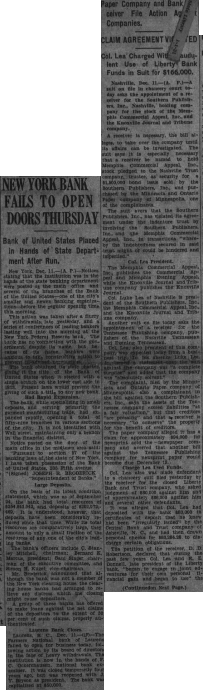 Col. Lea Charged audylent Use of Liberty Bank Funds in Suit for $166,000. suit on file in chancery court day the celver Publishers. Inc., Nashville, holding pany for the of the MemAppeal, the Journal and Tribune company. necessary. the to the company its investigated. necessary that be named to Appeal, Inc., stock pledged to the Nashville Trust security for $1,500,000 bond Southern purby the Paper the The avers that the Southern violated its ment the trust involving the Southern the Memphis Commercial Appeal, in in said by trust. might could be hindered imperiled.
